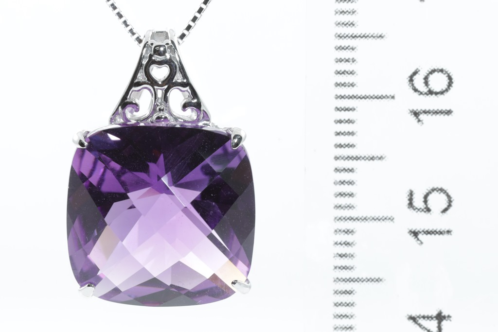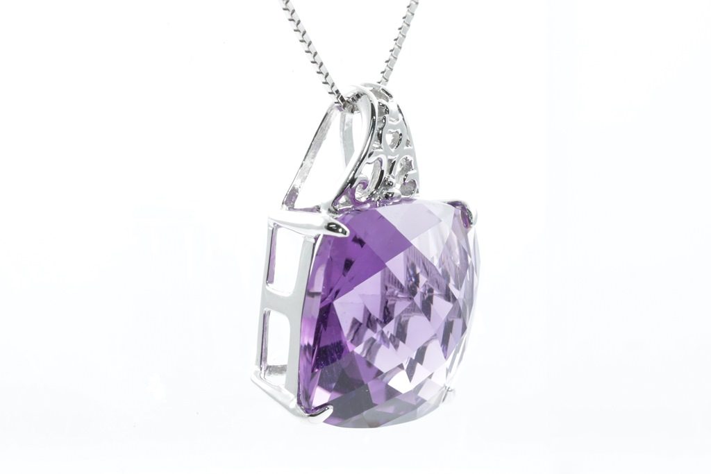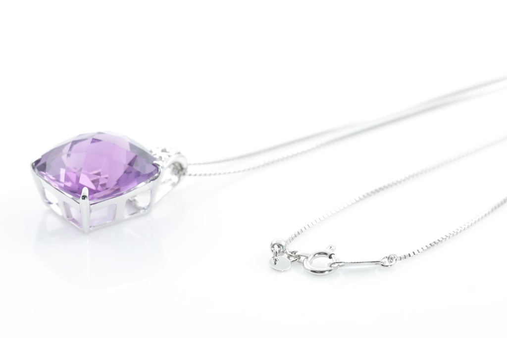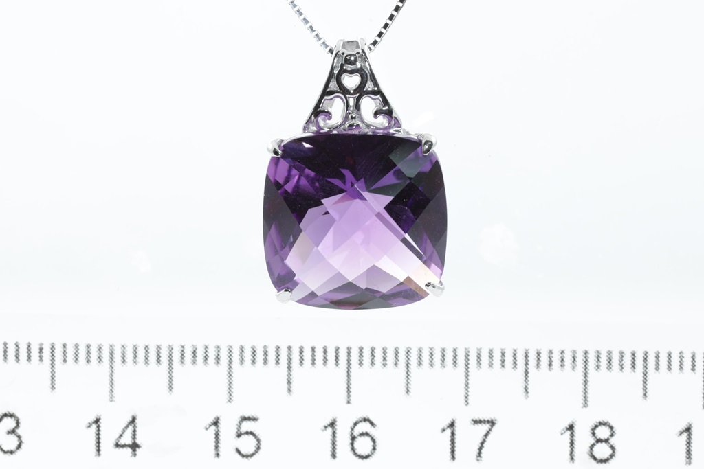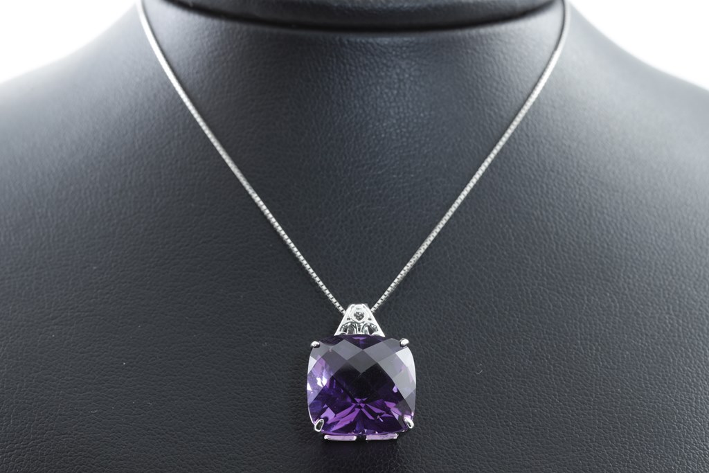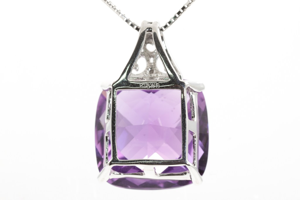Amethyst Pendant with a cushion checkerboard cut Amethyst of approximately 13.00ct. 18ct white gold with 44cm adjustable chain. Weight: 6.8g. (Pre-owned)