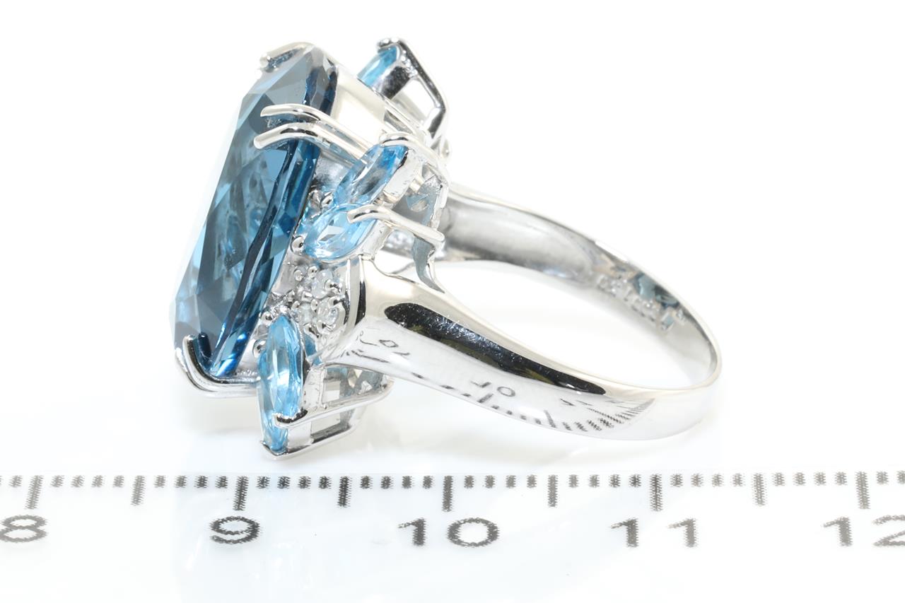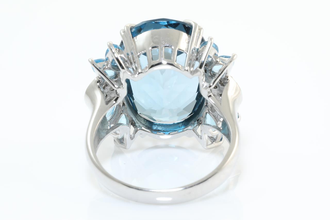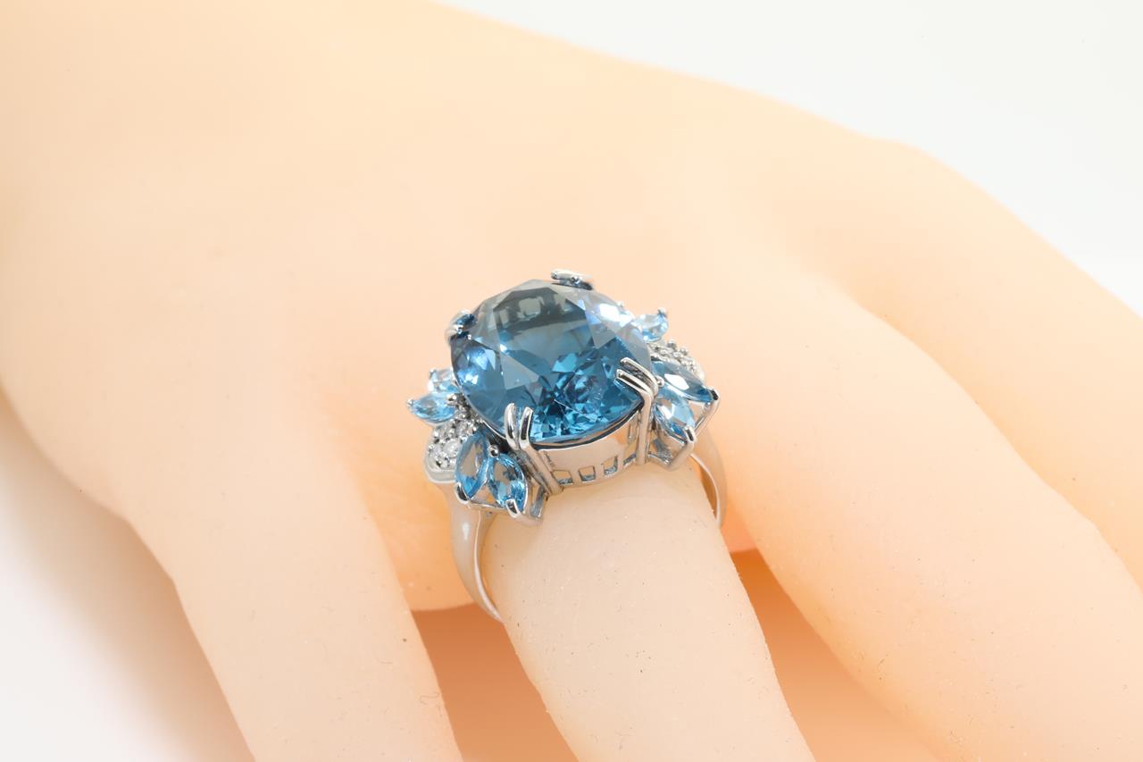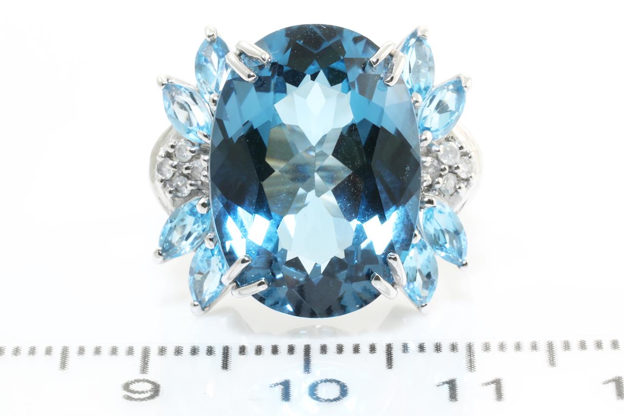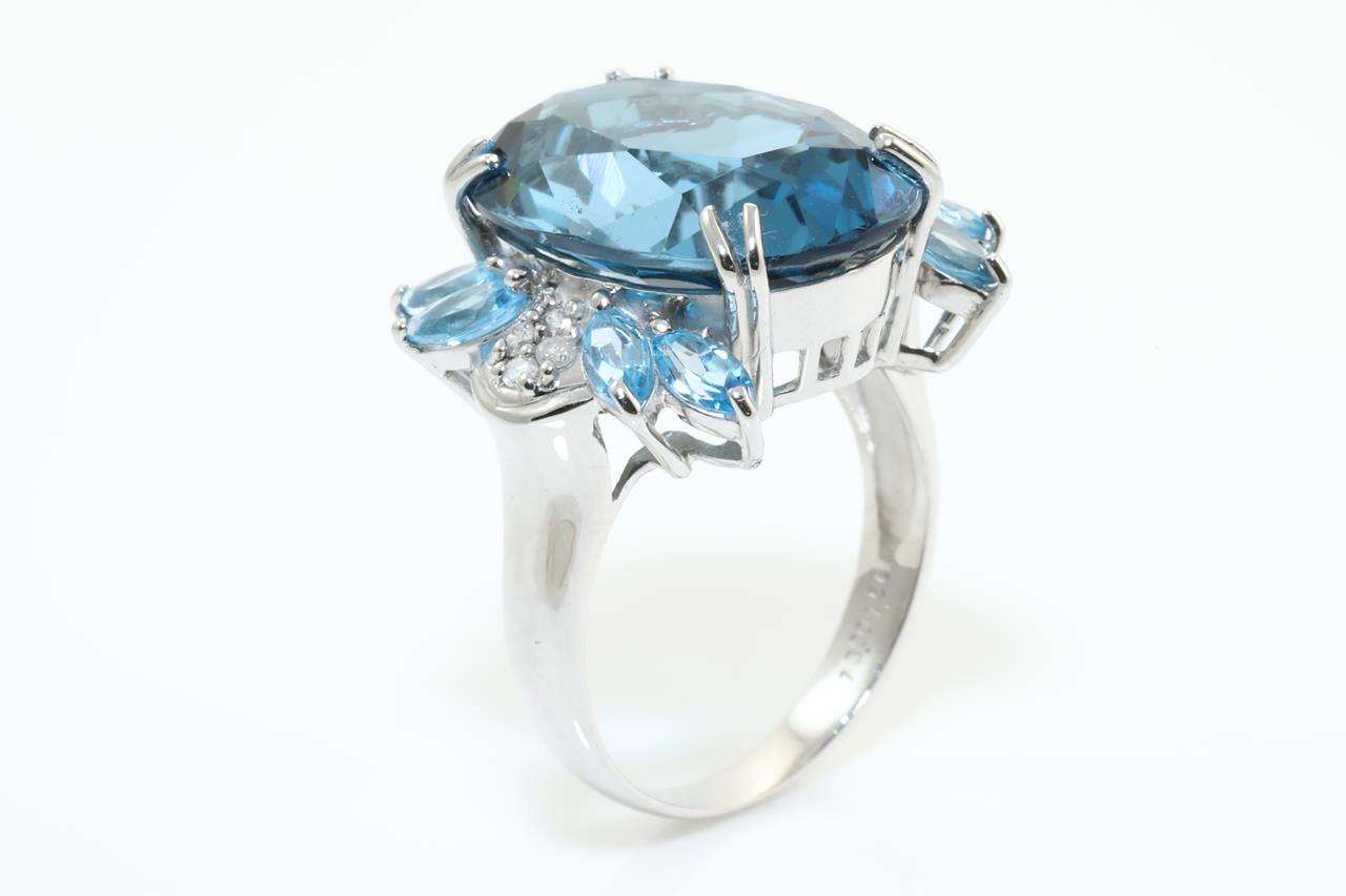Topaz and Diamond ring with an oval blue Topaz of 13.00ct, marquise cut blue Topaz totalling 1.50cts and Diamonds totalling 0.08cts. 18ct white gold. Ring size N1/2. Weight: 9.5gm. (Pre-owned)