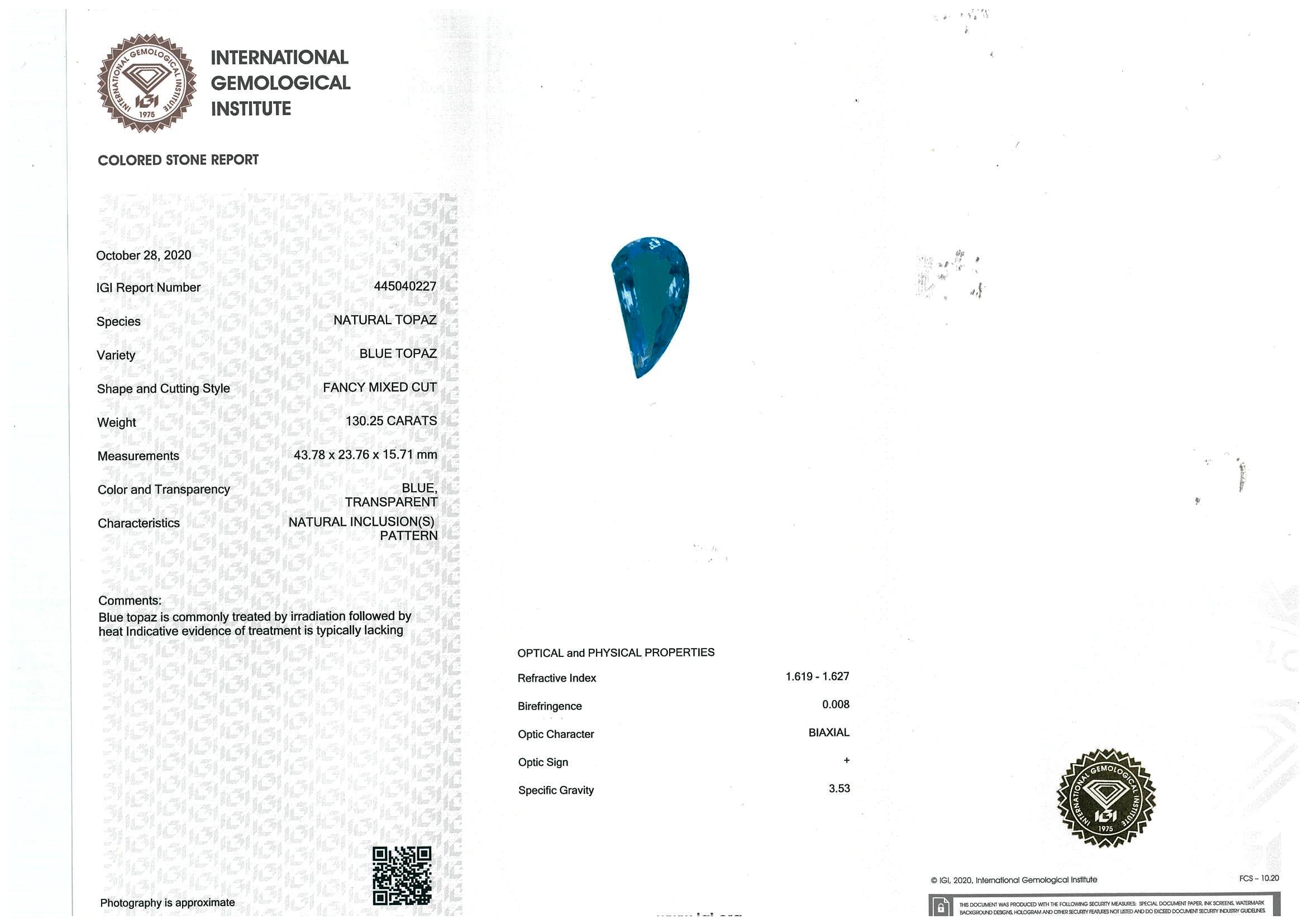 A loose fancy cut Natural Topaz of 130.25ct (with IGI report #445040227). Size: 43.7 x 23.7 x 15.7mm. (New)