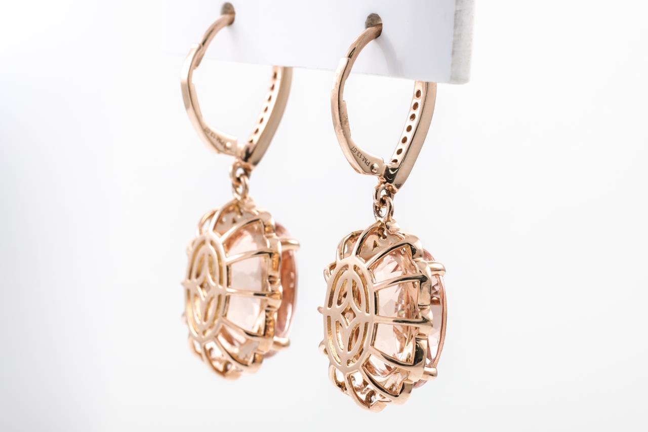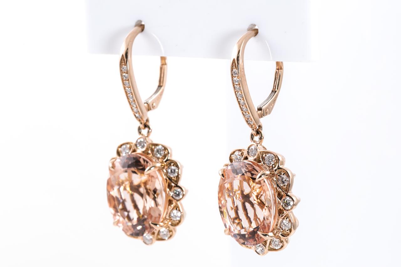 Morganite and Diamond hinge back earrings with oval Morganite totalling 13.07cts and round Diamonds totalling 0.78cts (Estimated grading: H-I SI). 14ct rose gold. Weight: 10.0g. With certificate #415427. (As new)