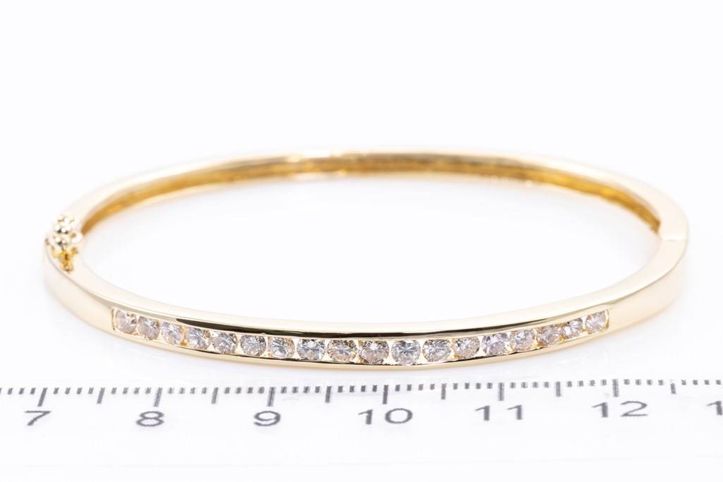 Diamond bangle with round Diamonds totalling 1.30cts (Estimated grading: I-K SI). 18ct yellow gold. Length: 17cm. Weight: 13.8g. (Pre-owned)