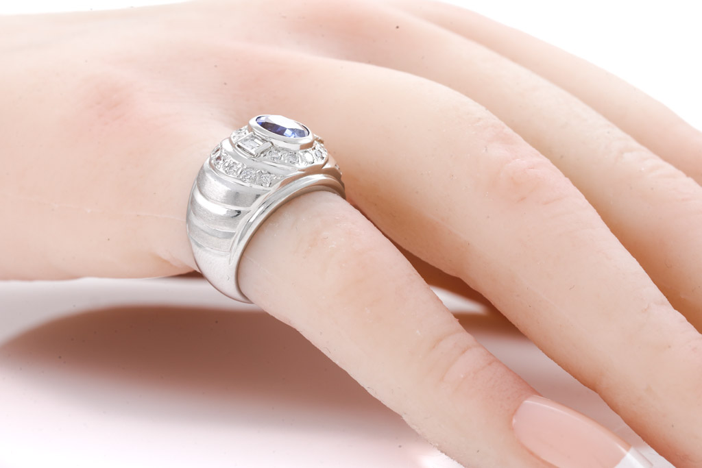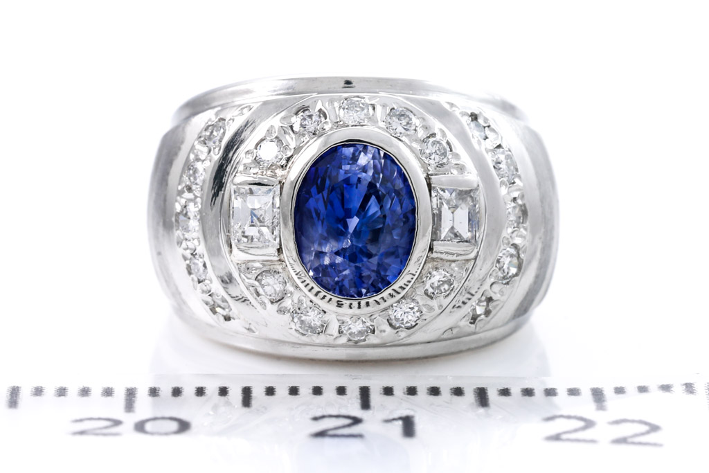 Sapphire and Diamond mens ring with oval blue Sapphire of 1.30cts and round Diamonds totalling 0.50cts. Platinum. Ring size G - ring resizing is not recommended. Weight: 11.3g. (Pre-owned)