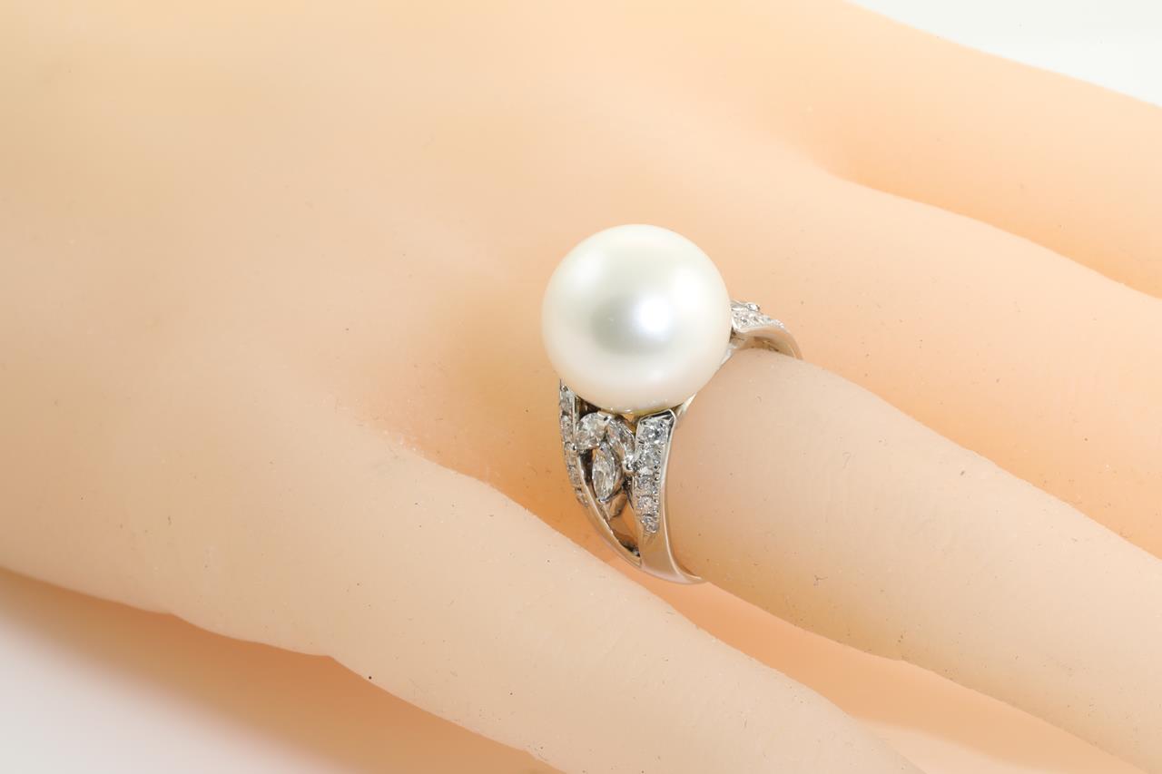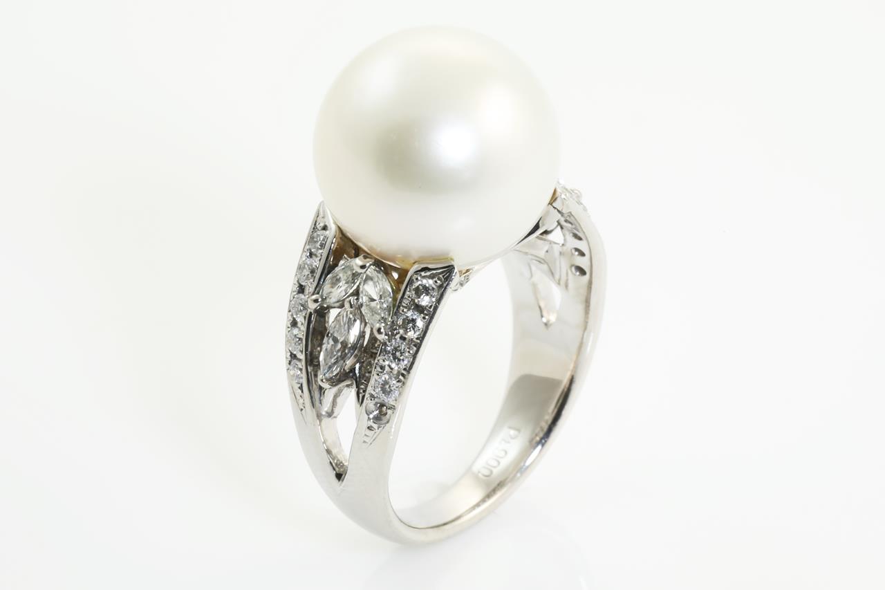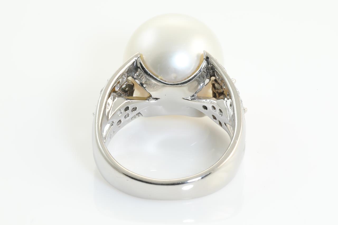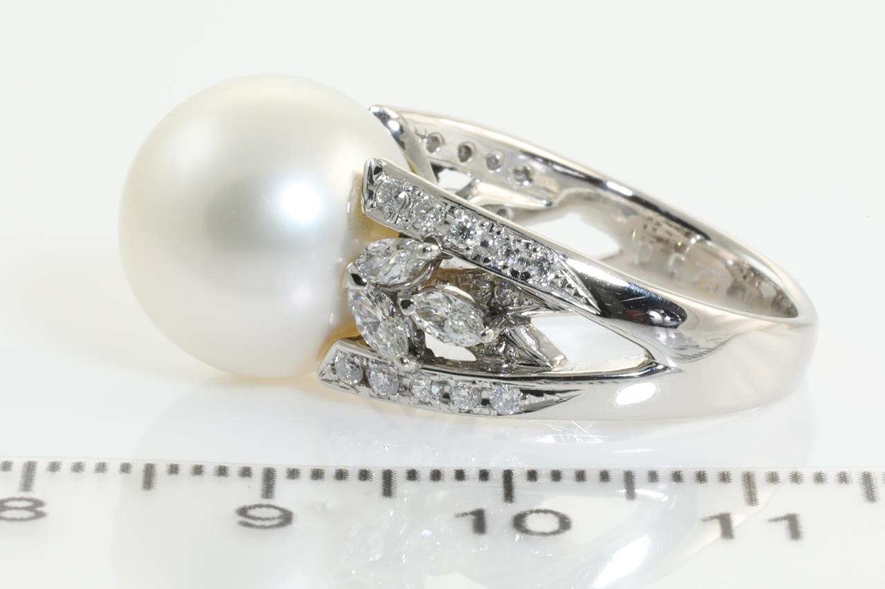 Pearl and Diamond Ring with a South Sea Pearl of 13.0mm and Diamonds totalling 0.75cts (Estimated grading: H SI). Platinum. Ring size J - ring resizing is not recommended. Weight: 11.1g (Pre-owned)