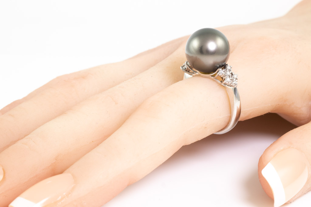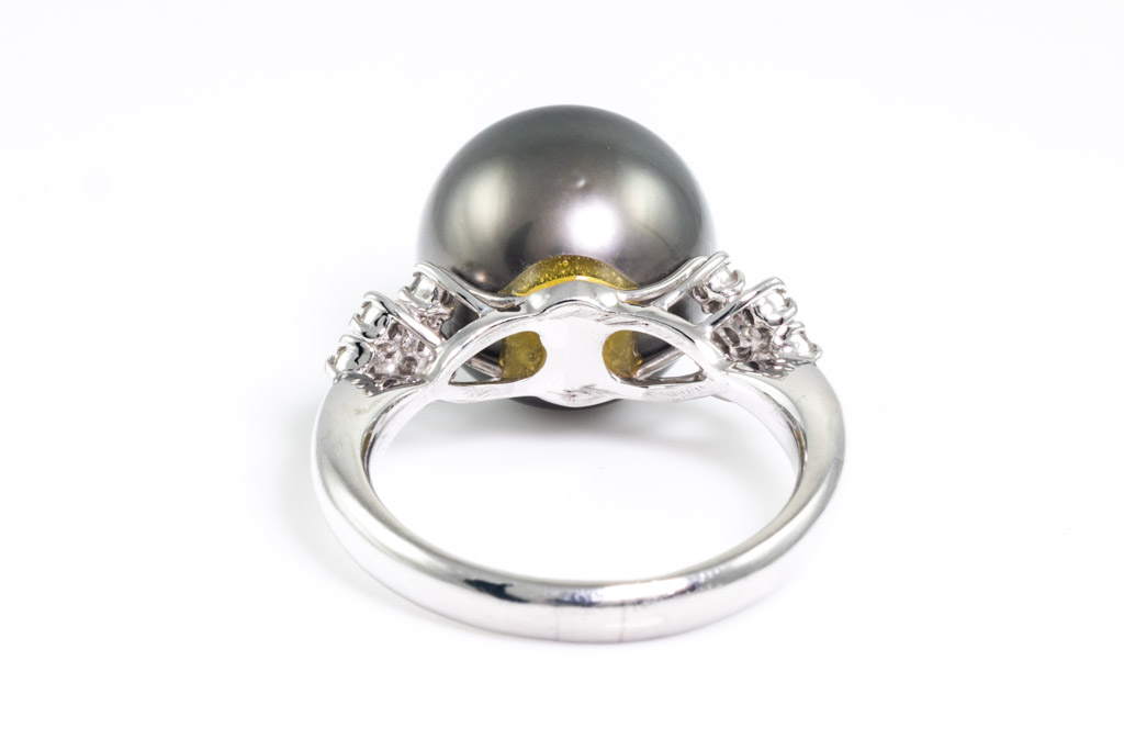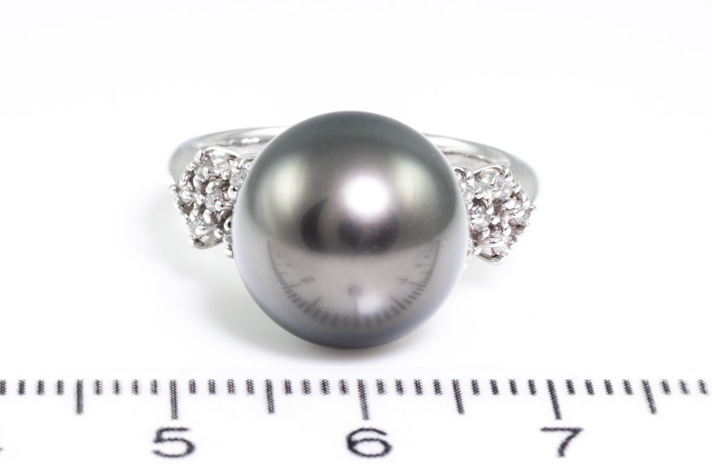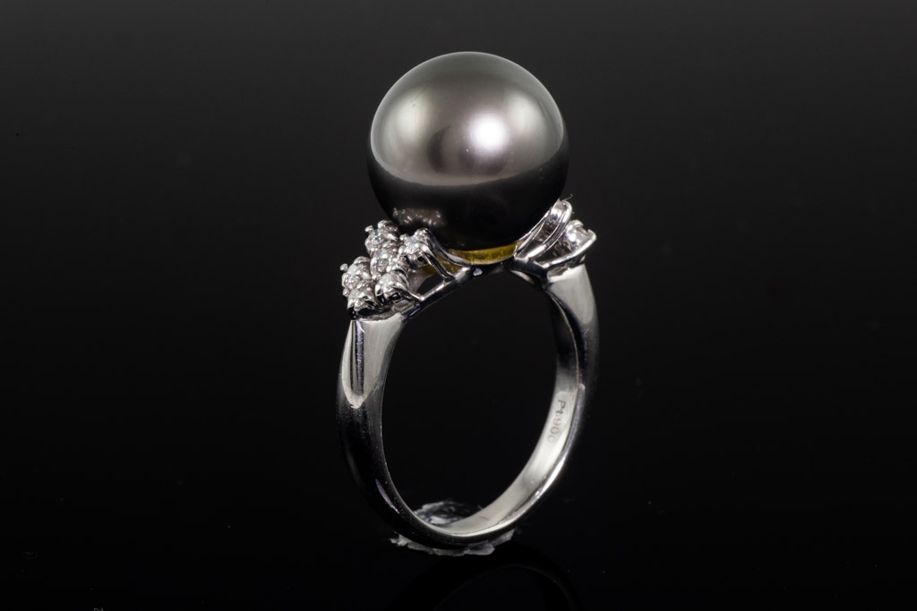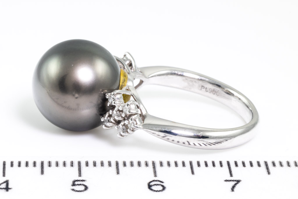 Tahitian Pearl and Diamond ring with Tahitian Pearl of 13.0mm and round Diamonds totalling 0.15cts. Platinum - 900. Ring size M1/2. Weight: 9.0g. (Pre-owned)
