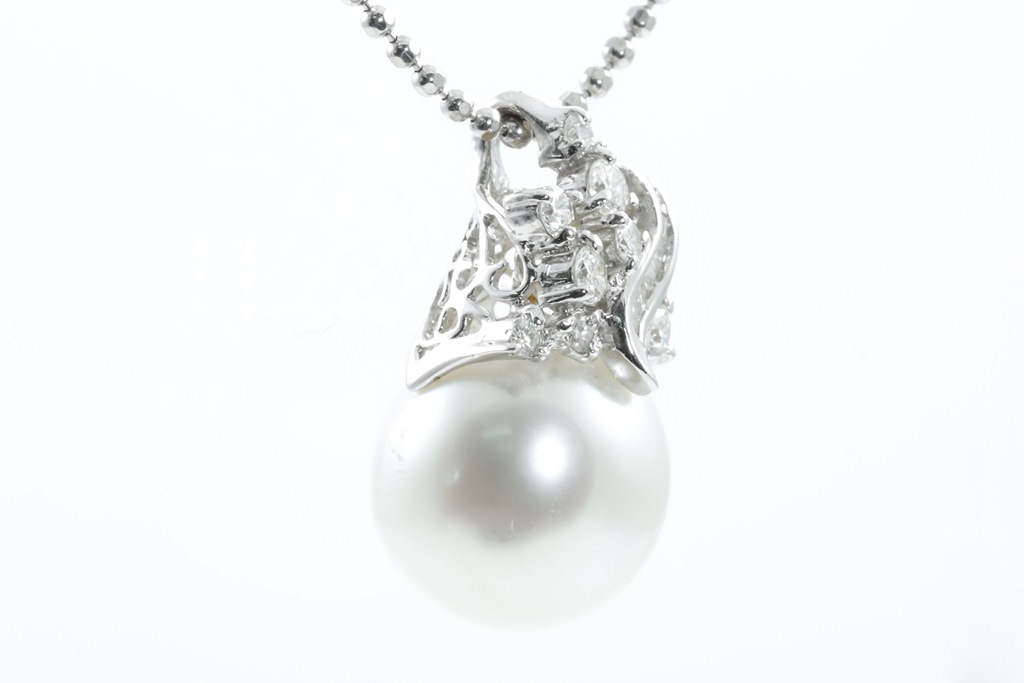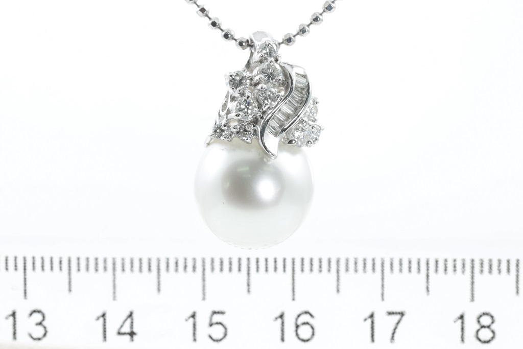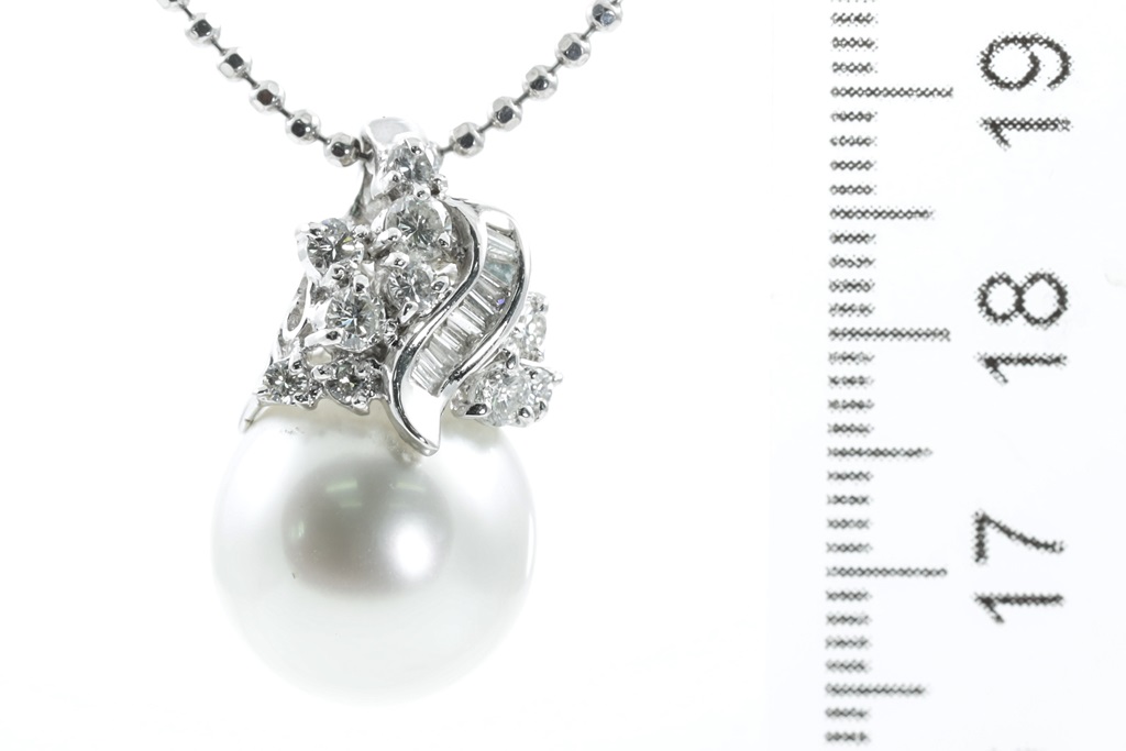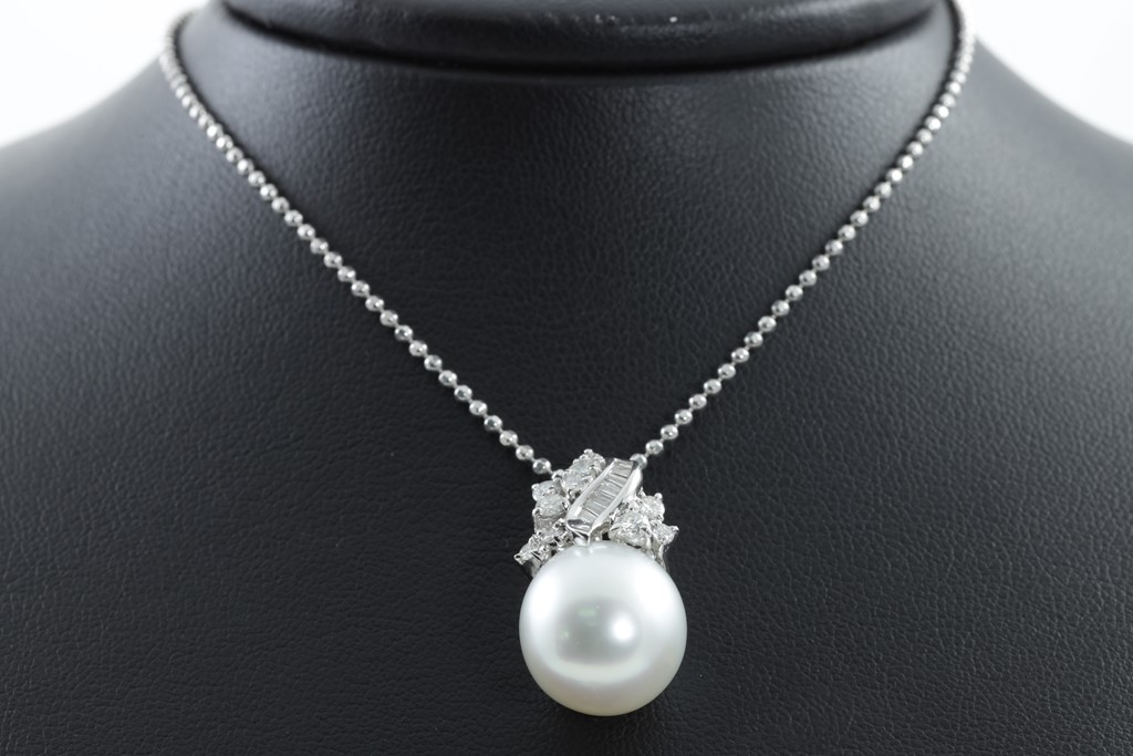 Pearl and Diamond pendant with South Sea Pearl of 13.1mm and round & baguette Diamonds totalling 0.60cts (Estimated grading: H-I SI). Platinum with adjustable 41cm chain. Weight: 11.6g (Pre-owned)