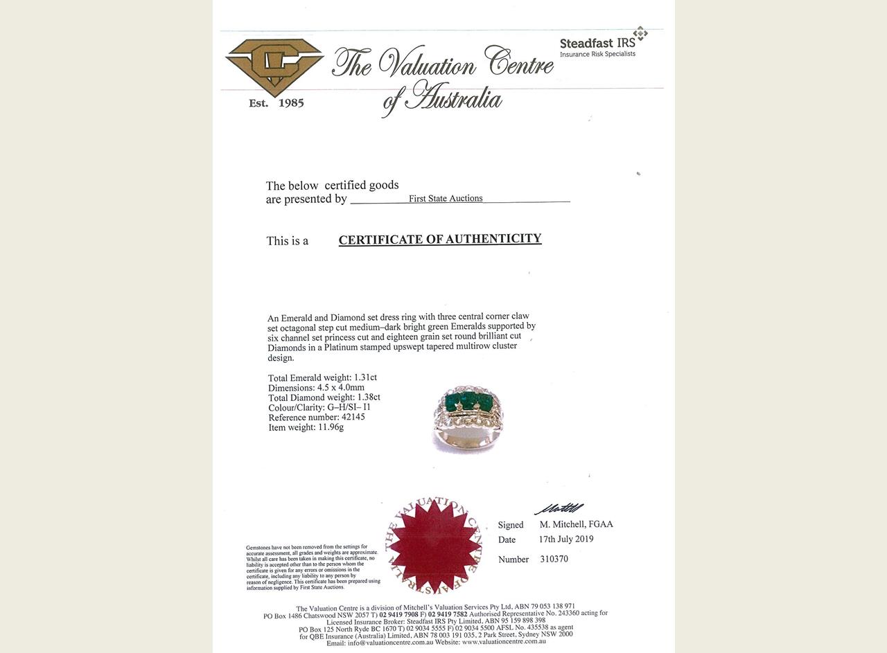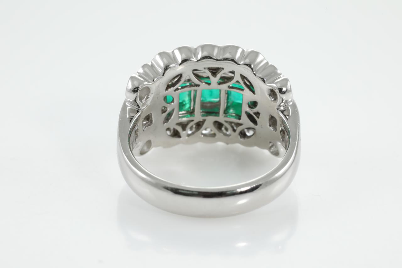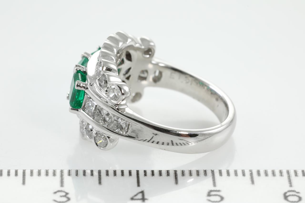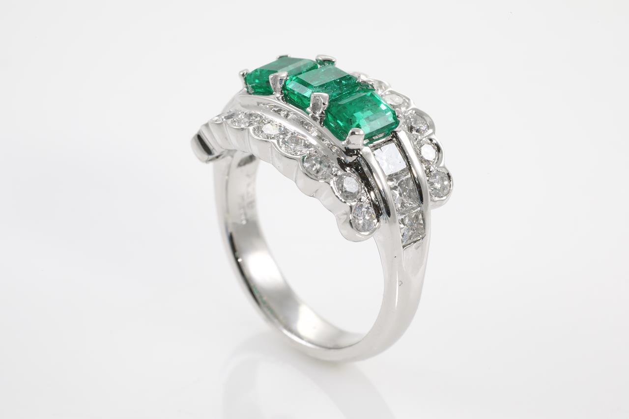 Emerald and Diamond ring with 3 emerald cut Emeralds totalling 1.31cts and Diamonds totalling 1.38cts (Estimated grading: G-H SI-P1). Platinum. Ring size L1/2. Weight: 11.9g. With certificate #310370. (Pre-owned)