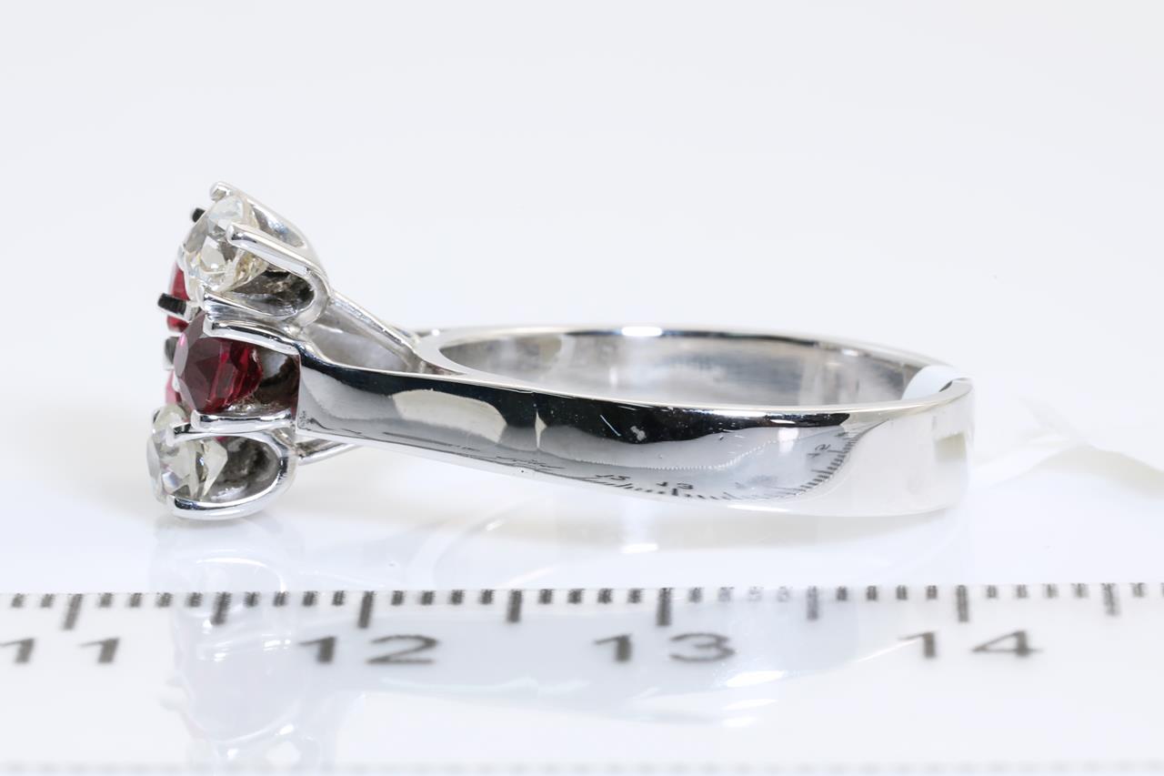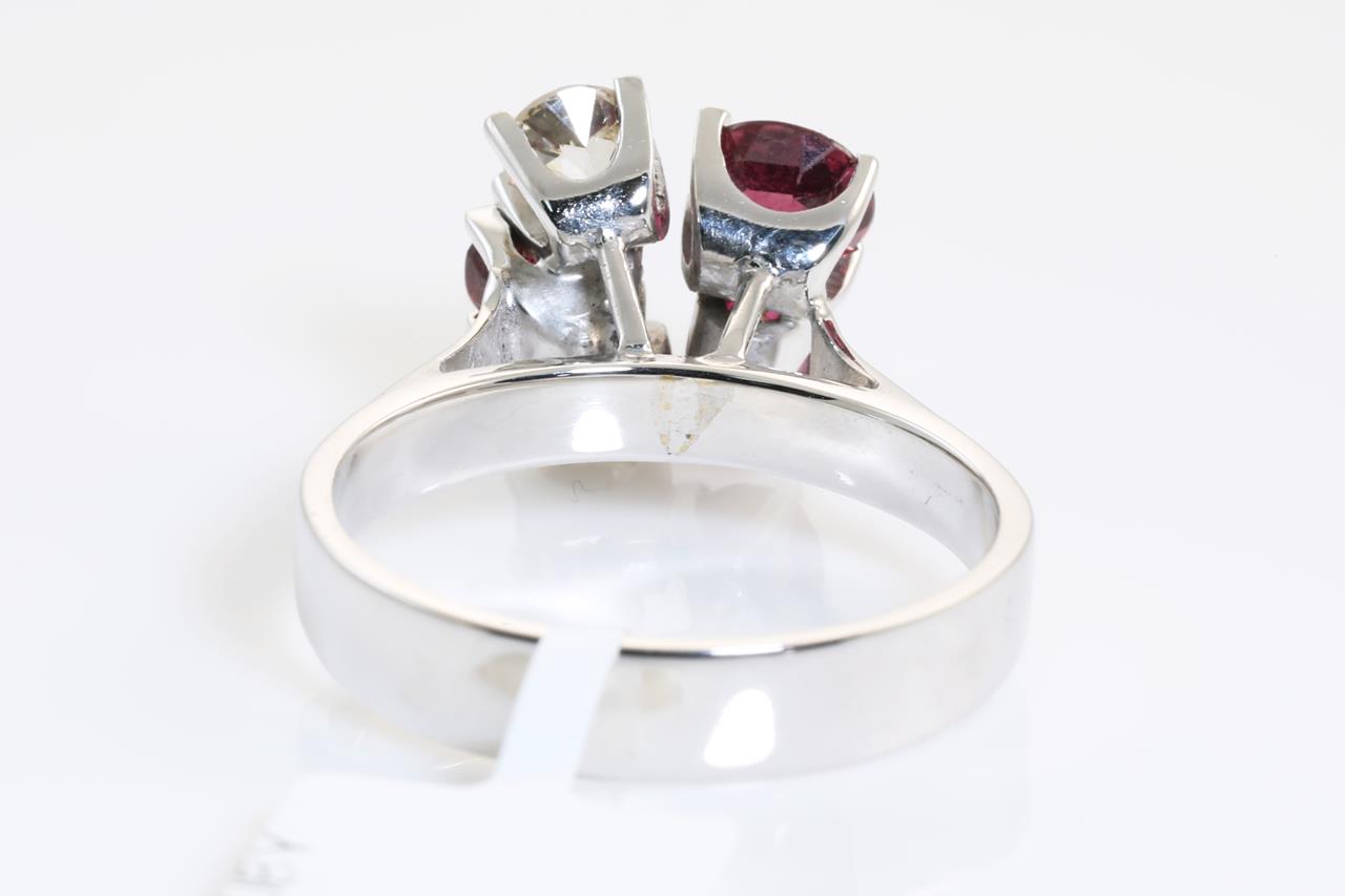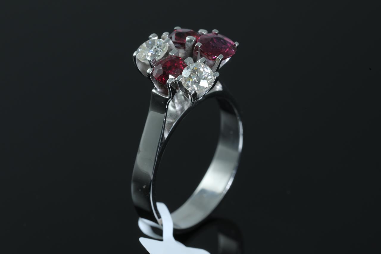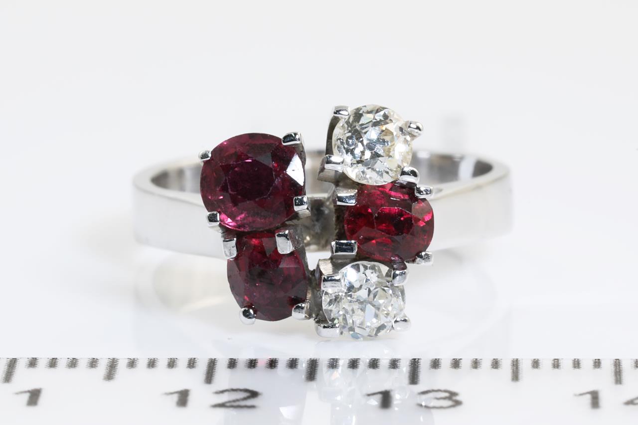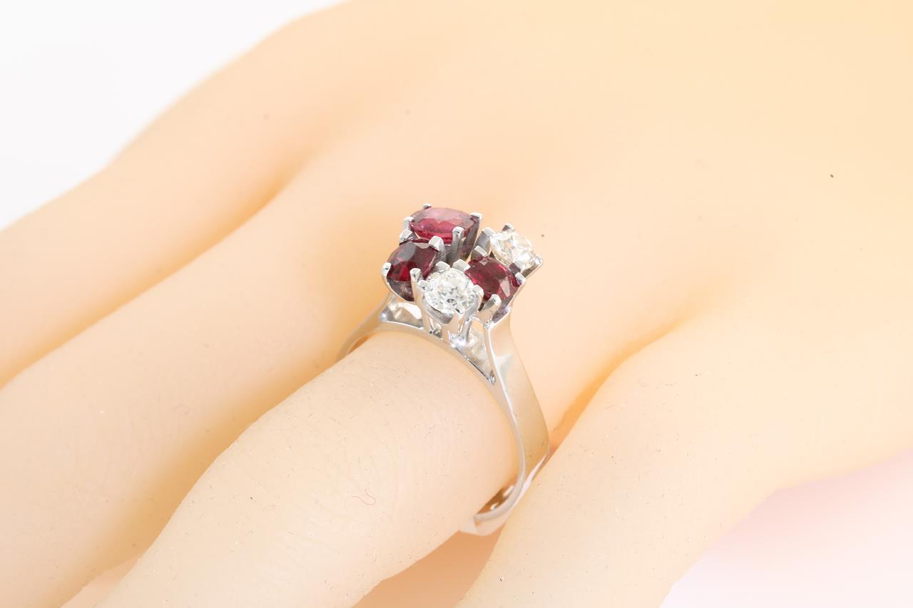 Ruby and Diamond ring with oval Rubies totalling approximately 1.31cts and Diamonds totalling approximately 0.50cts (Estimated grading: TBA). 18ct white gold. Ring size P. (As new)