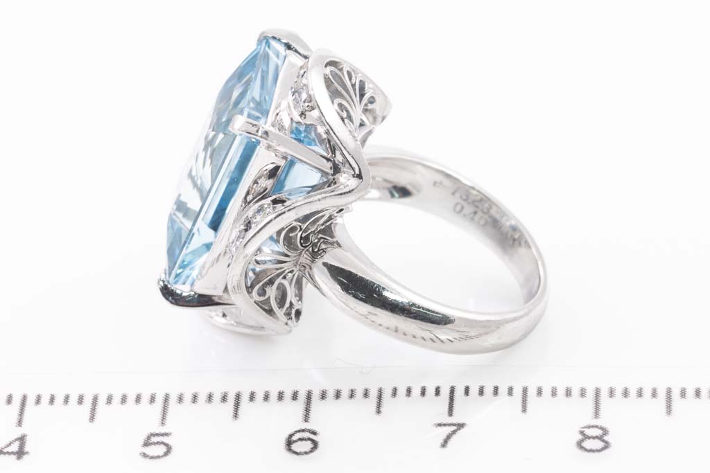 Aquamarine and Diamond ring with emerald cut Aquamarine of 13.23ct and round Diamonds totalling 0.40cts (Estimated grading: G-H SI). Platinum - 900. Ring size J. Weight: 17.3g. With certificate #417140. (Pre-owned)