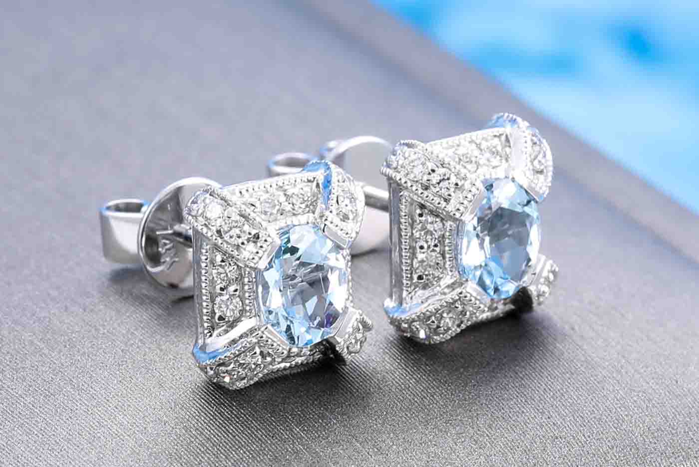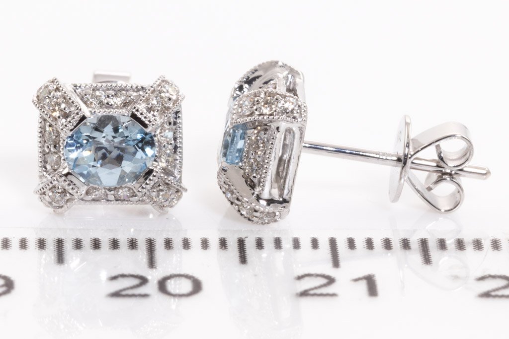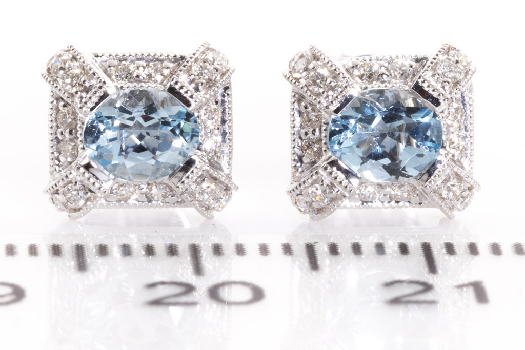 Aquamarine and Diamond earrings with oval shape Aquamarines totalling 1.32cts and round Diamonds totalling 0.25cts. 14ct white gold Weight: 2.3g. (New)