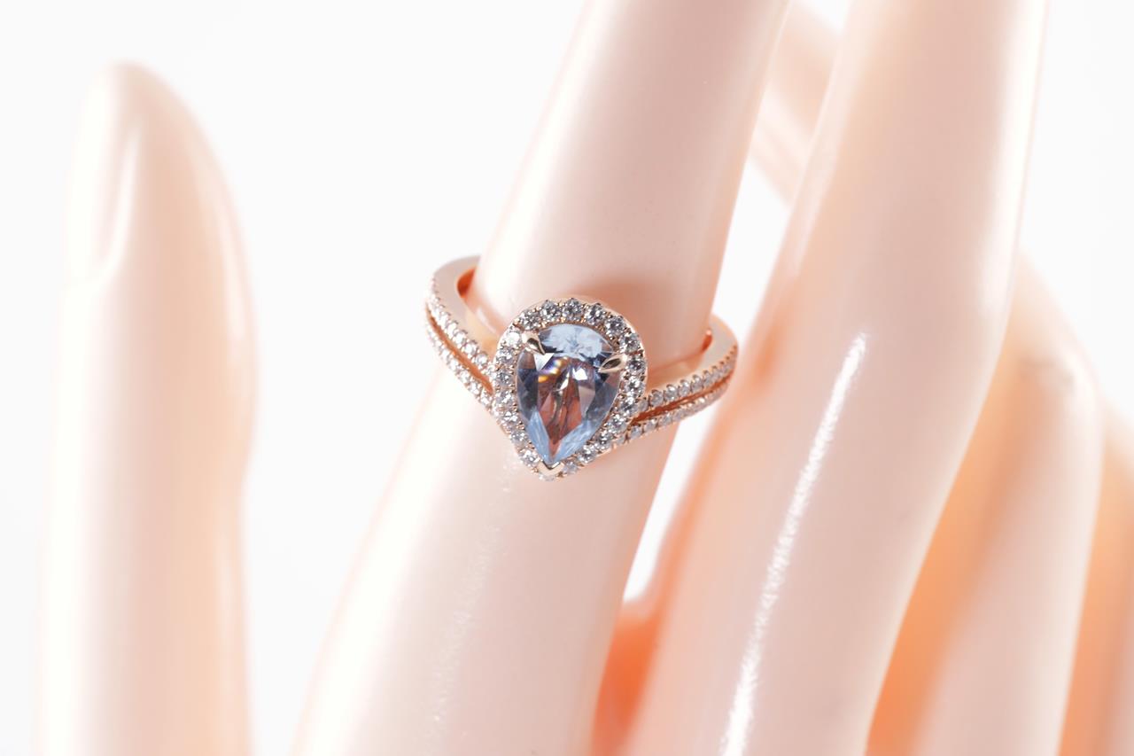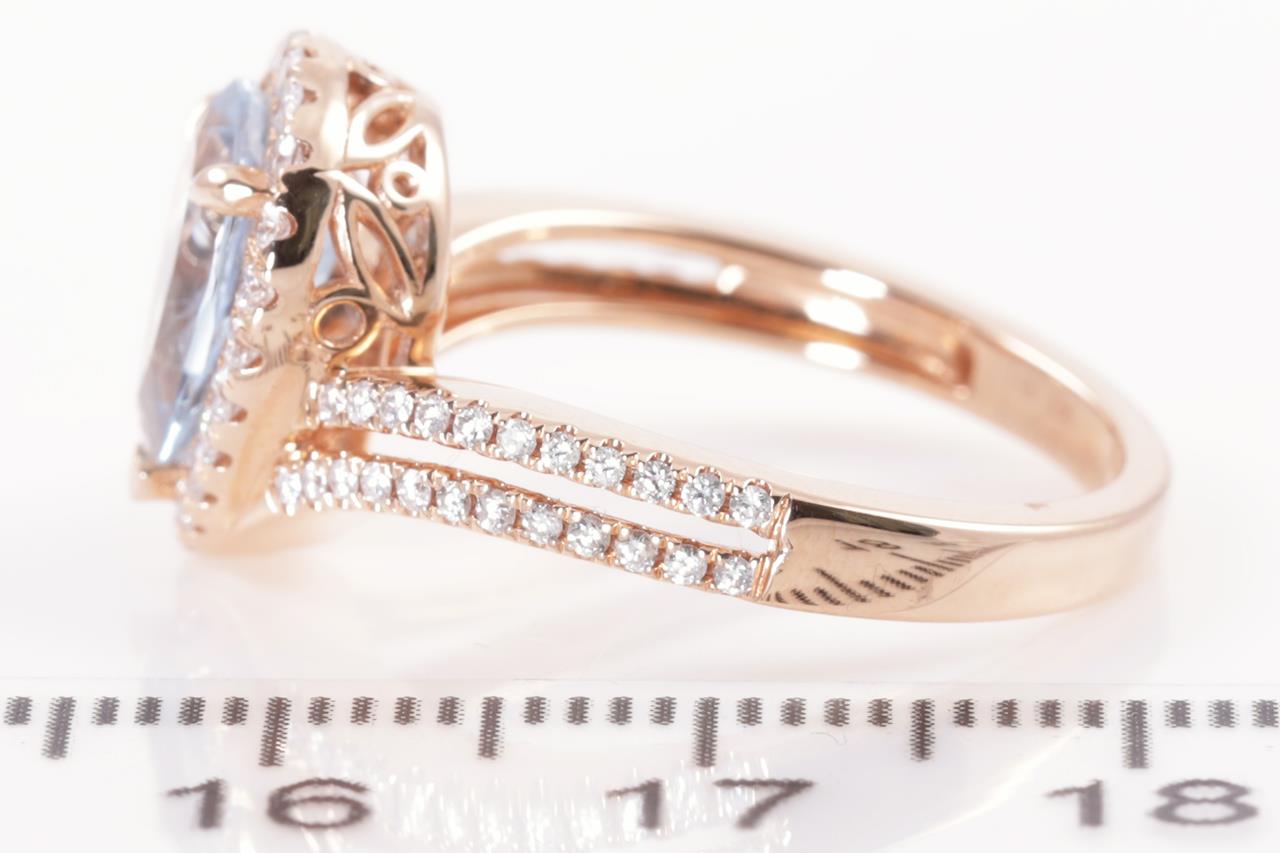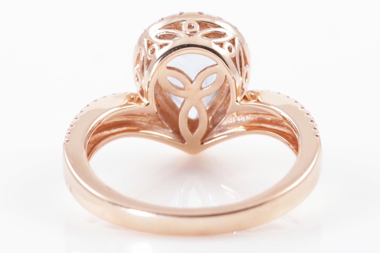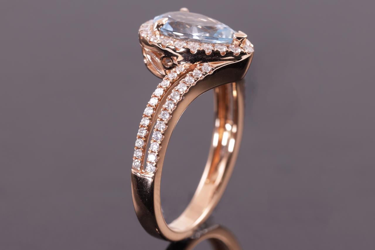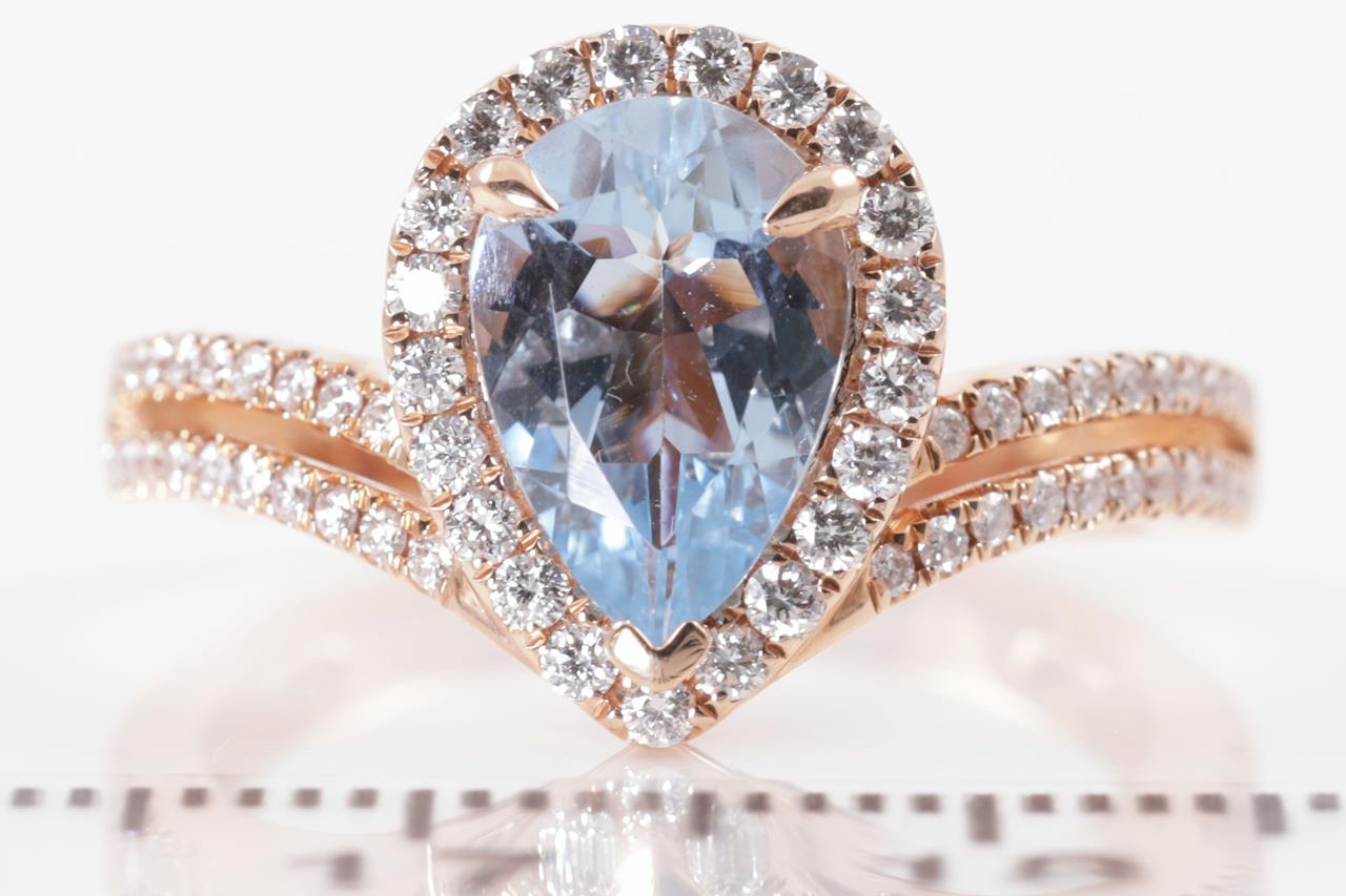 Aquamarine and Diamond ring with a pear cut Aquamarine of 1.32ct and Diamonds totalling 0.41cts (Estimated grading: G-H SI-P1). 14ct rose gold. Ring size N - ring resizing is not recommended. Weight: 4.5g. (As new)