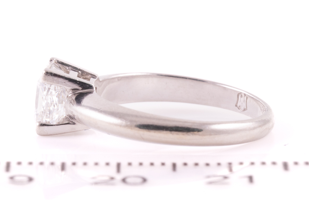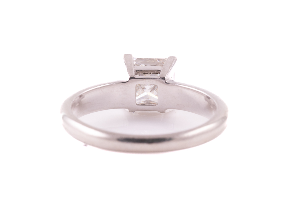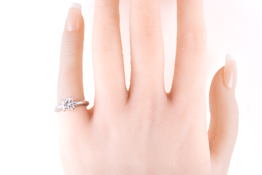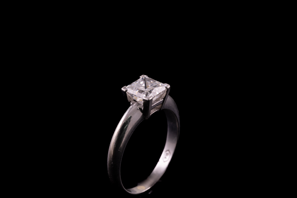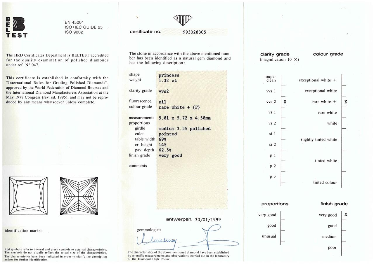 Diamond solitaire ring with a princess cut Diamond of 1.32ct (HRD certificate #993028305 graded as F VVS2). Platinum-900 (XRF tested). Ring size J 1/2. Weight: 4.2g. (Pre-owned)