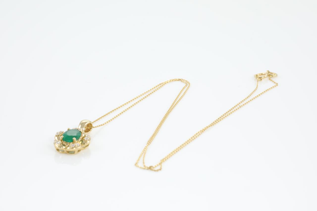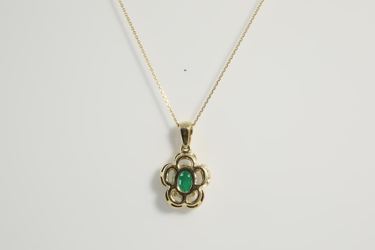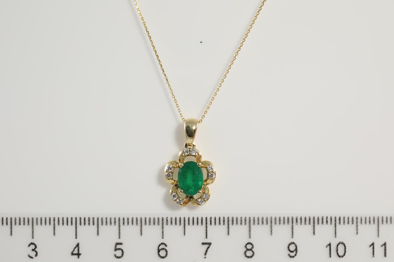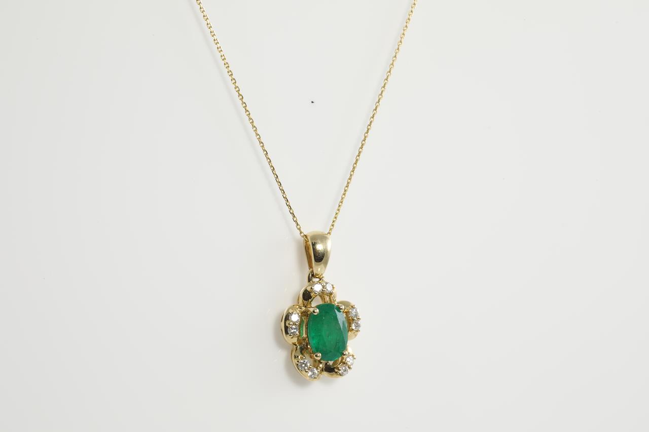 Emerald and Diamond pendant with oval cut Emerald of 1.32ct and Diamonds totalling 0.14cts. 14ct yellow gold with 14ct gold 45cm chain. Weight:2.6g (As new)