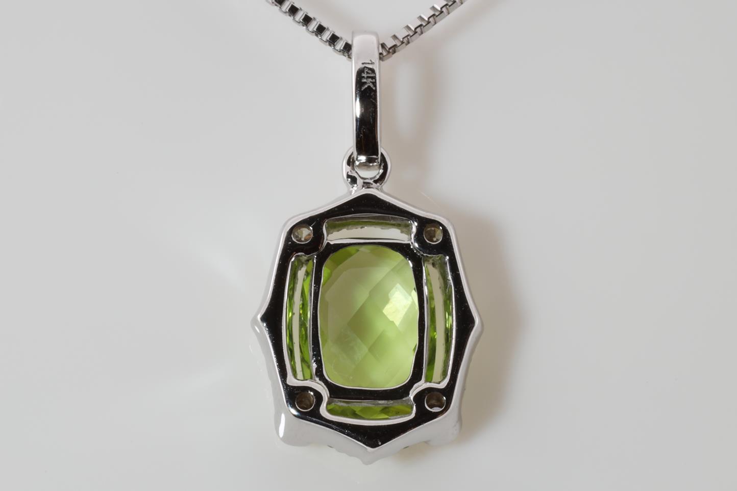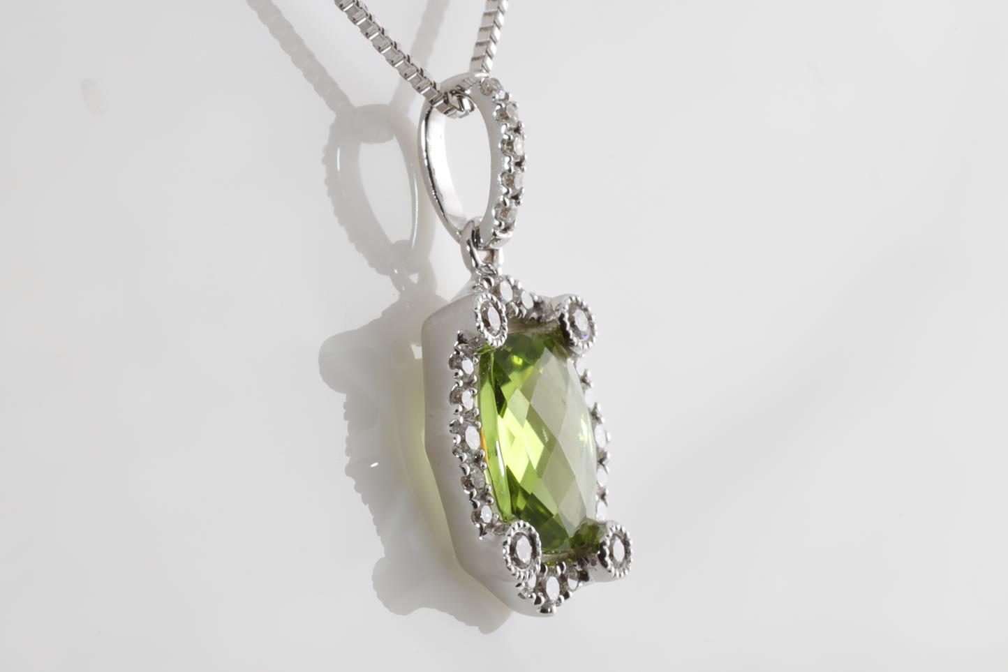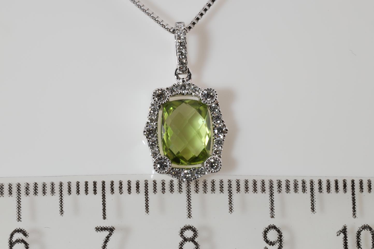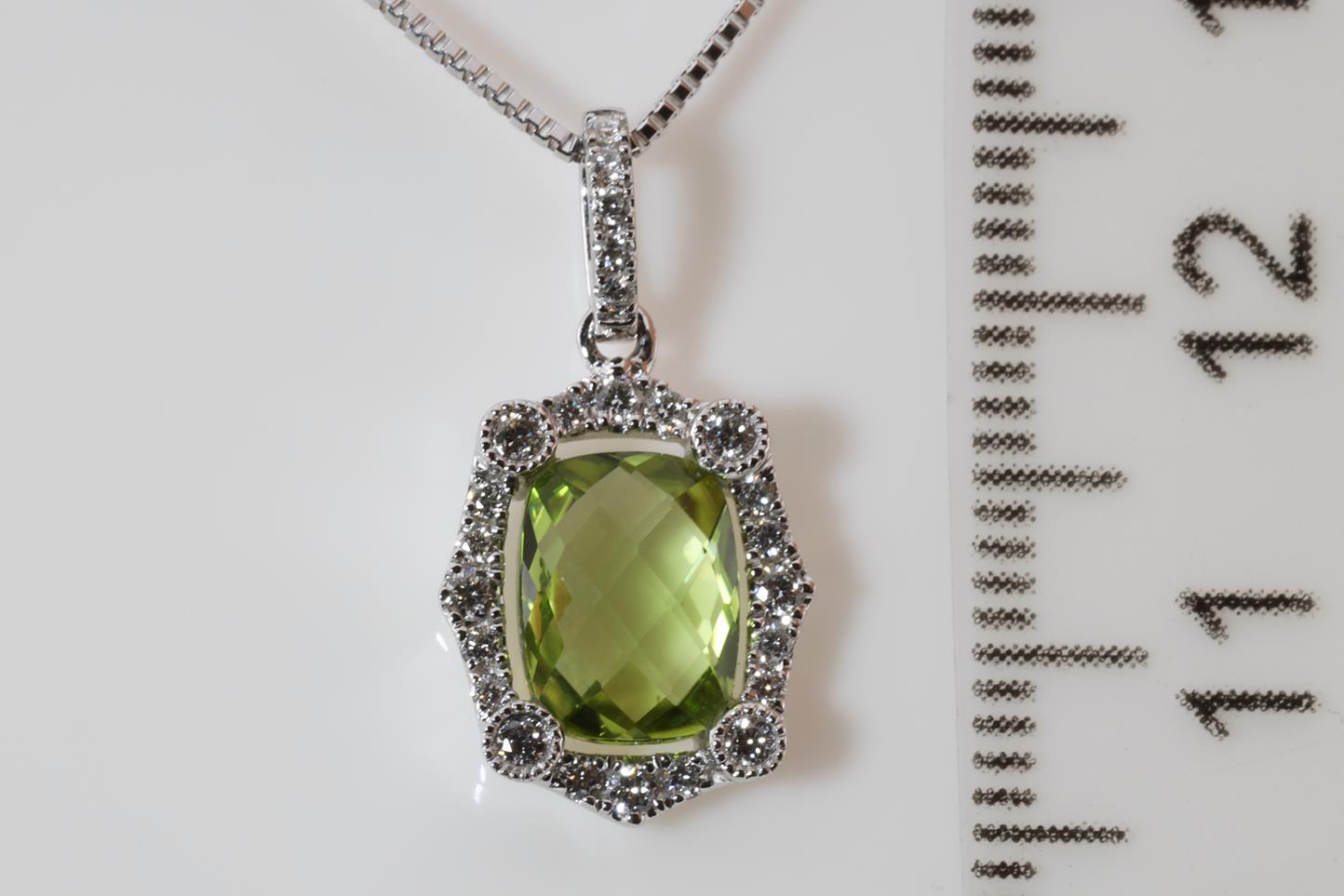 Peridot and Diamond pendant with cushion checkerboard cut Peridot of 1.32ct and Diamonds totalling 0.21cts. 14ct white gold with 18ct gold adjustable 45cm chain. Weight: 4.9g (New)
