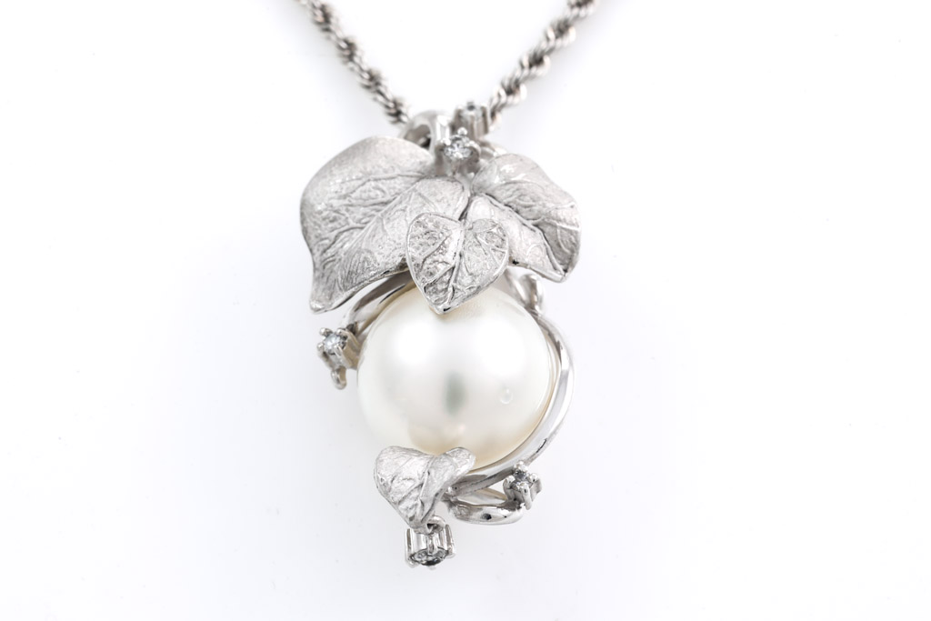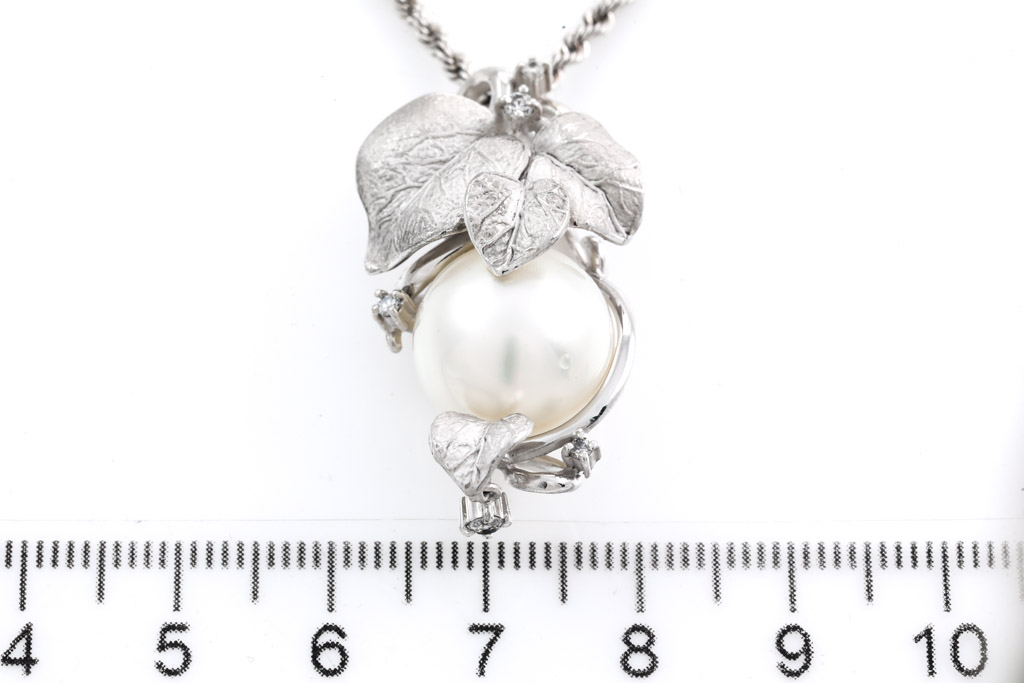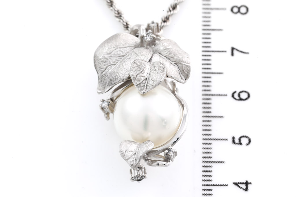 Pearl and Diamond pendant with South Sea Pearl of 13.2mm and round Diamonds totalling 0.12cts. 18ct white gold with 49cm 18ct white gold chain. Weight: 13.7g. (Pre-owned)