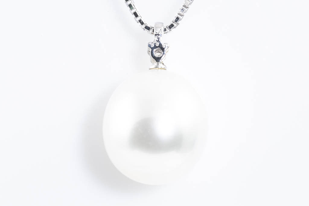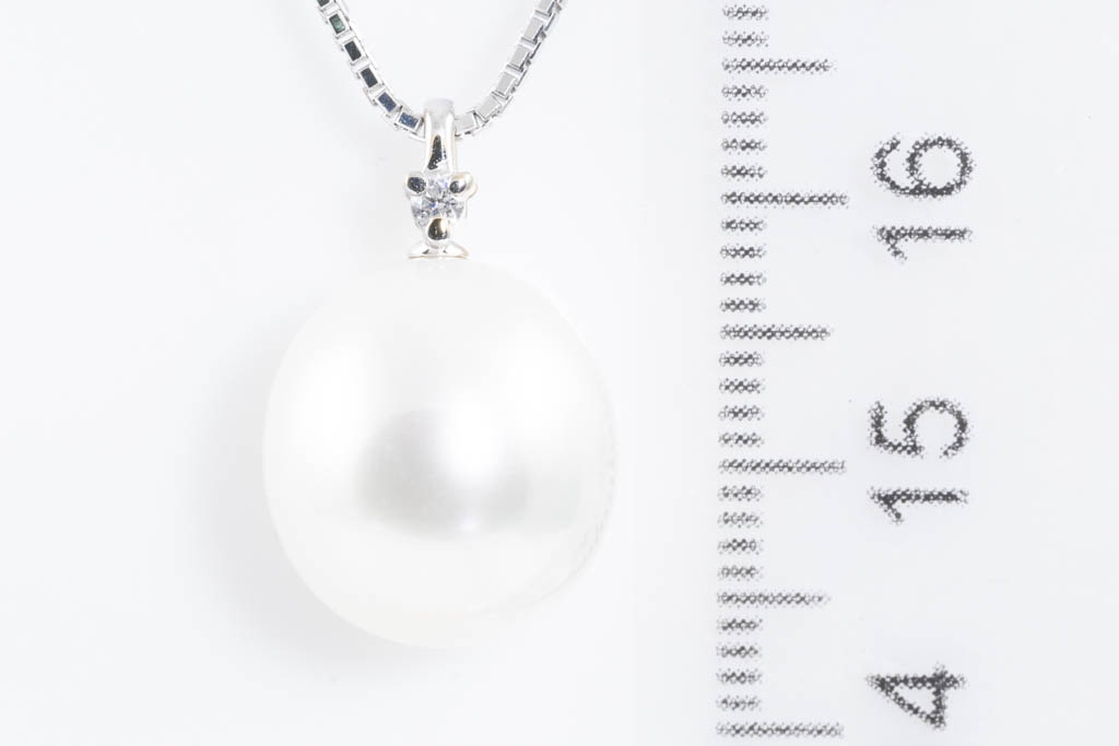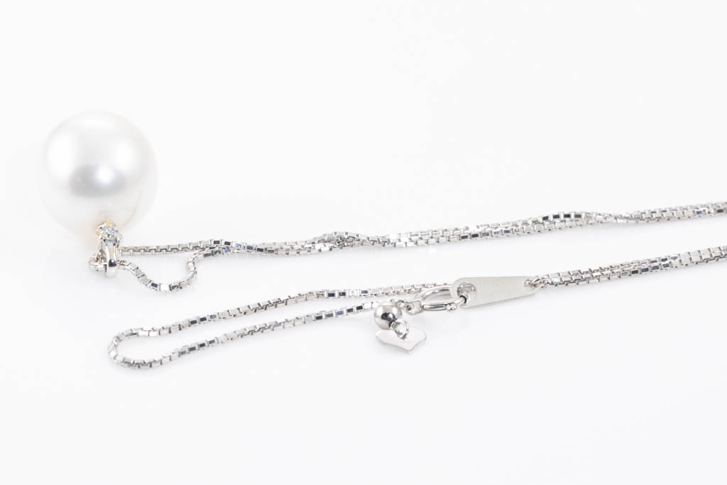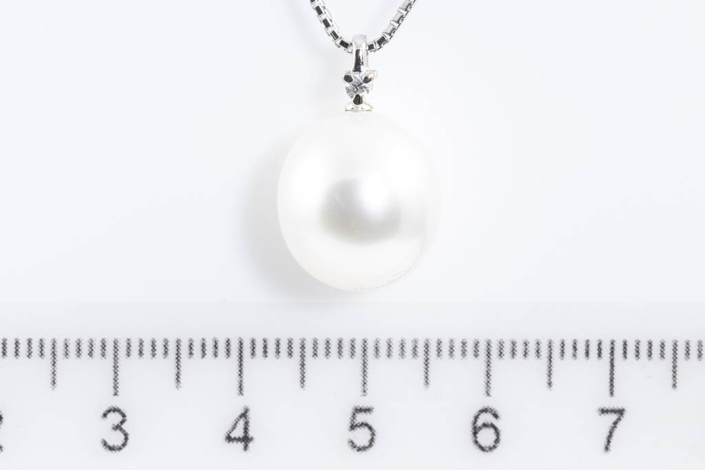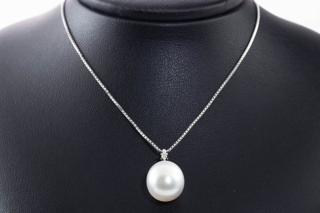 Pearl and Diamond pendant with South Sea Pearl of 13.2mm and round Diamond of 0.03ct. 18ct white gold with 44cm adjustable platinum chain. Weight: 8.4g. (Pre-owned)