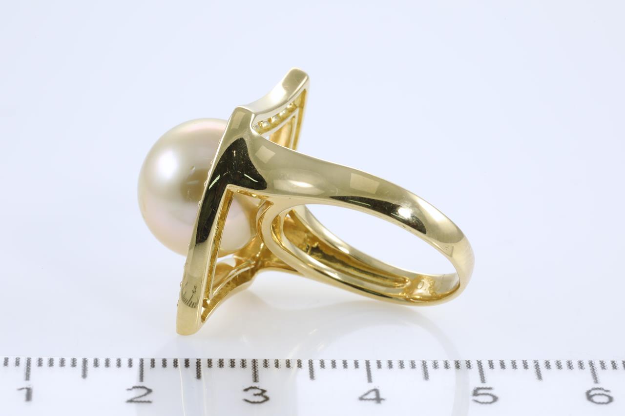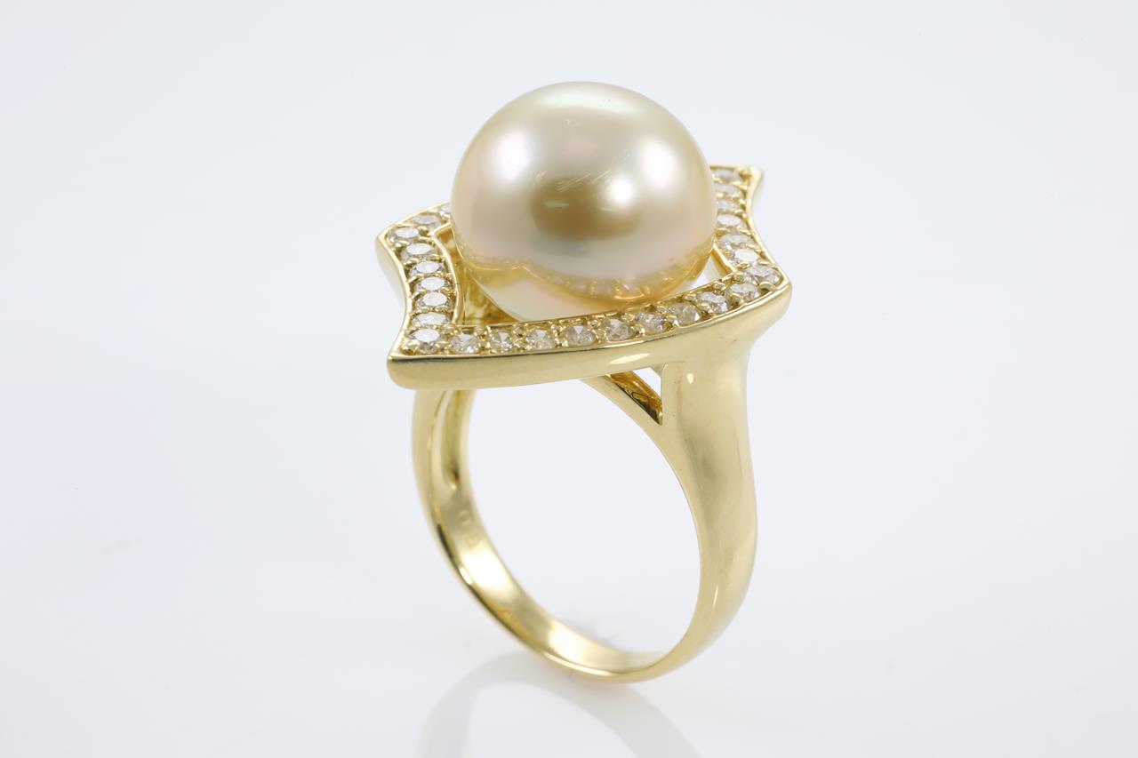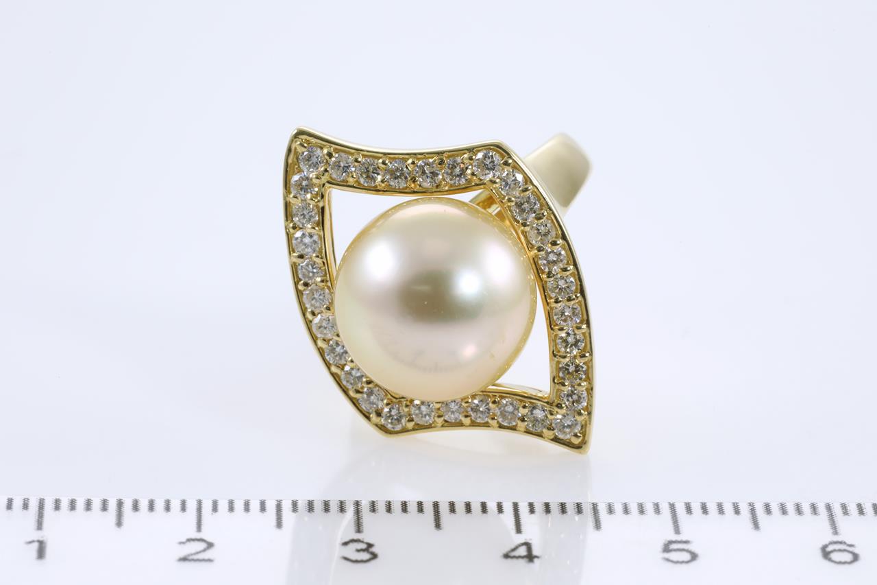 Pearl and Diamond ring with a Golden South Sea Pearl of 13.2mm and round Diamonds totalling 0.80cts (Estimated grading: H-I SI-P1). 18ct yellow gold. Ring size N. Weight: 12.6g (Pre-owned)