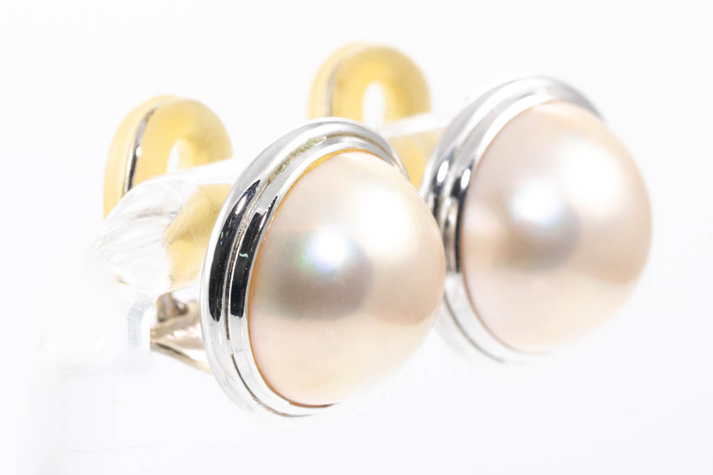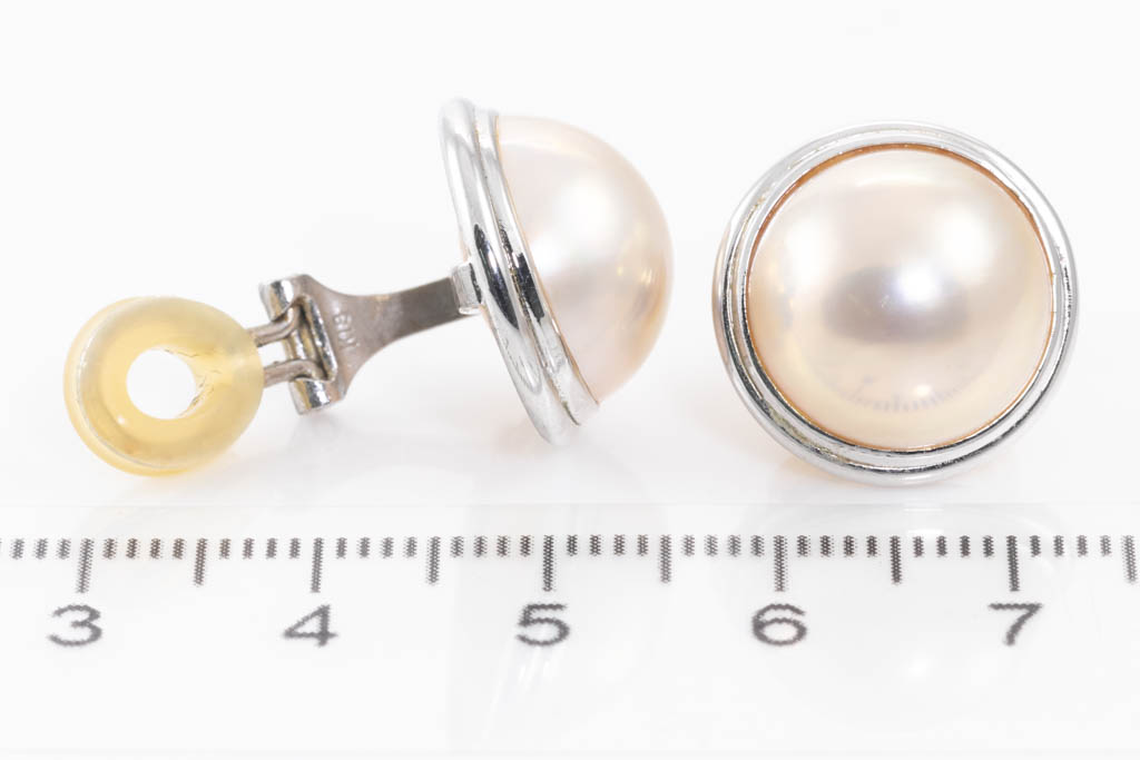 Pearl Clip on earrings (for non pierced ears) with Mabe Pearls of 13.2mm and 13.3mm. 14ct white gold and silicon. Weight: 6.4g. (Pre-owned)