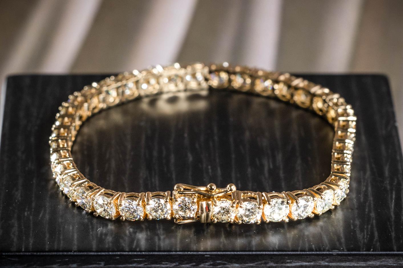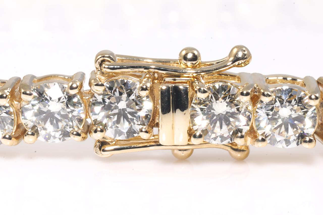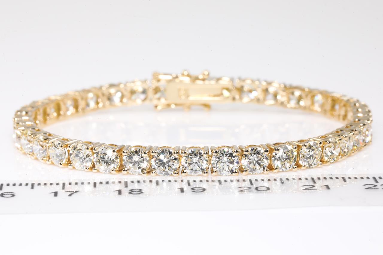 Diamond tennis bracelet with 38 round Diamonds totalling 13.33cts (Estimated grading: J-K SI). 18ct yellow gold. Length: 18cm. Weight: 16.5g. With certificate #415283. (New)