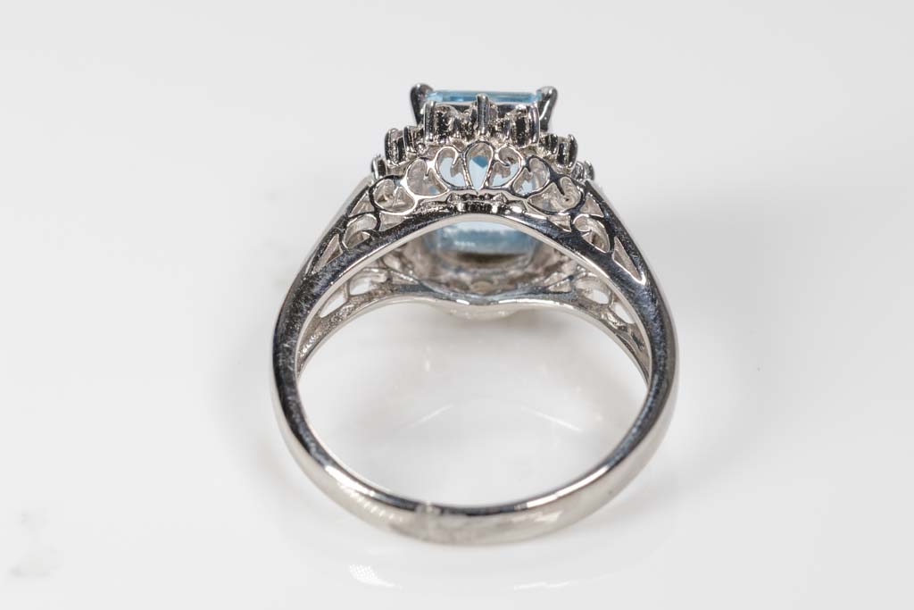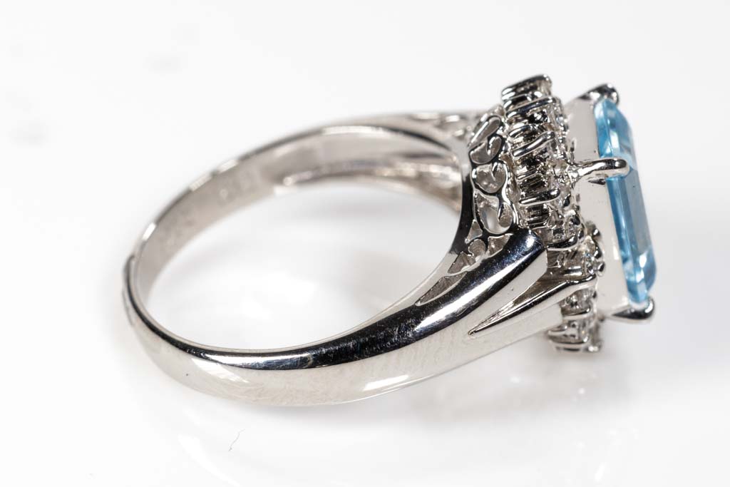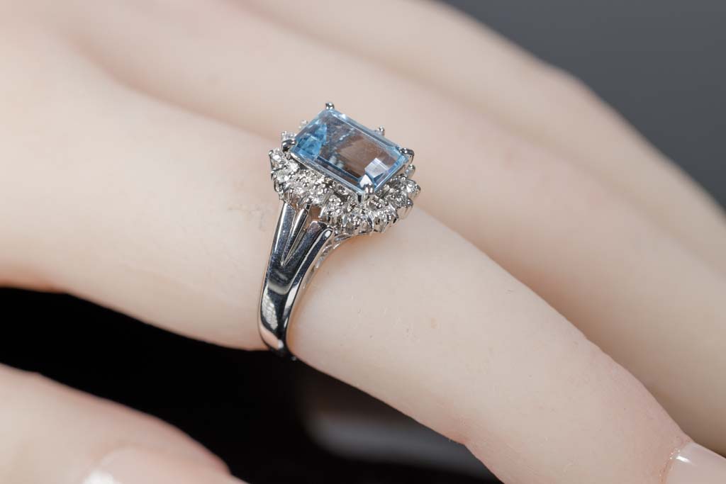 Aquamarine and Diamond ring with an emerald cut Aquamarine of 1.33ct and round Diamonds totalling 0.14cts. Platinum. Ring size: H. Weight: 5.9g. (Pre-owned)