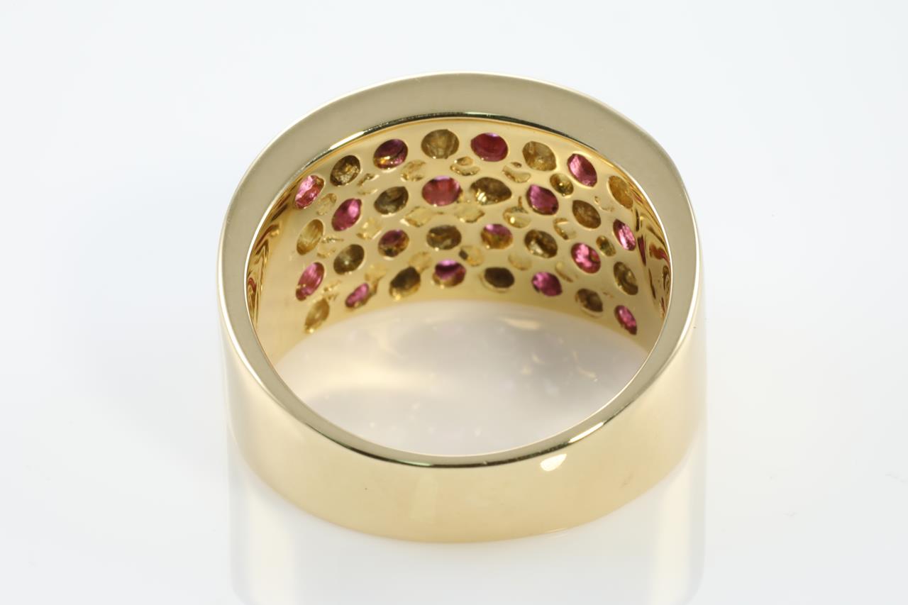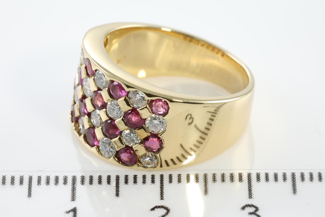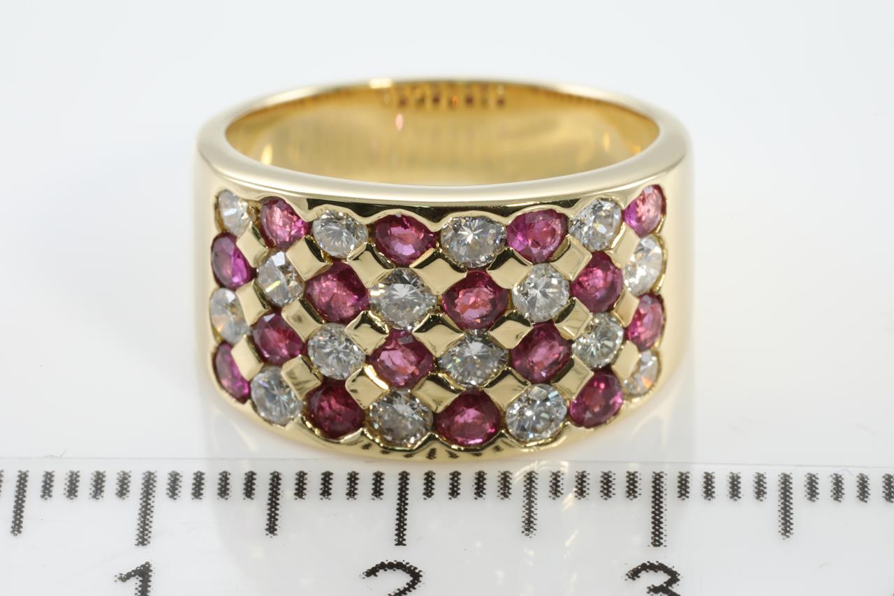 Ruby and Diamond ring with round Rubies totalling 1.33cts and Diamonds totalling 0.96cts (Estimated grading: H-I SI-P1). 18ct yellow gold. Ring size: M1/2 - Ring resizing is not recommended. Weight: 10.2g (Pre-owned)