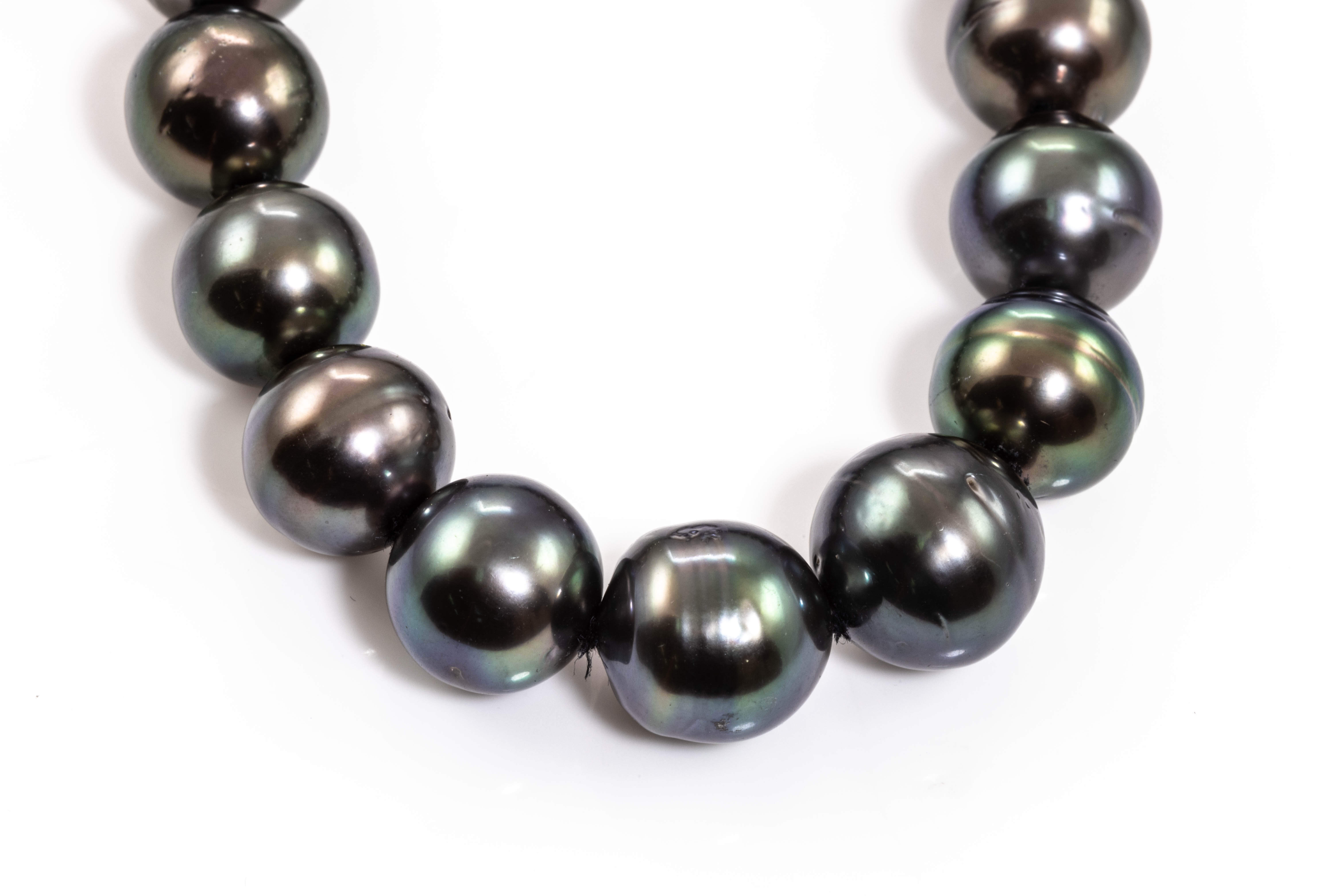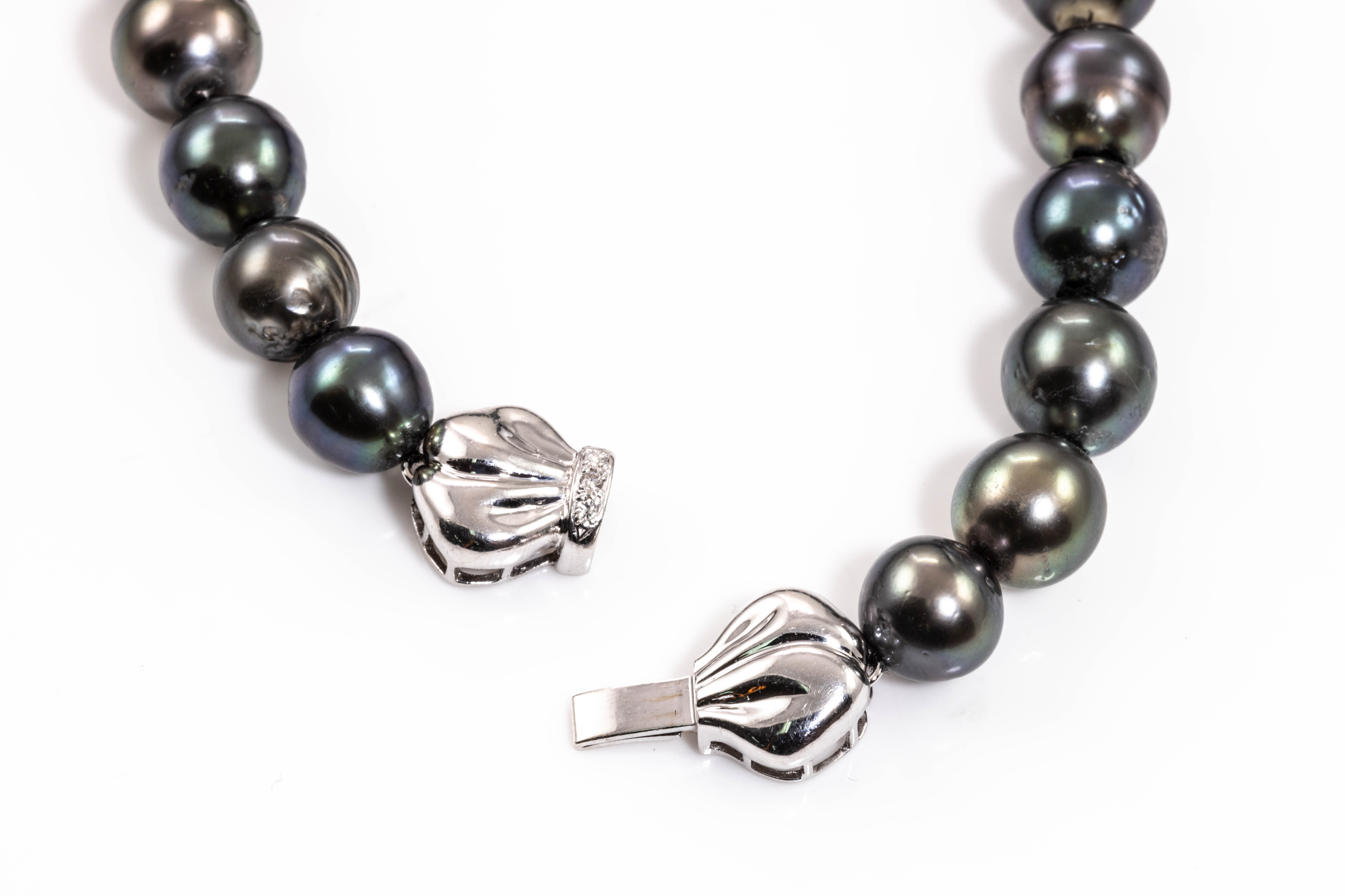 Pearl and Diamond necklace with ringed Tahitian Pearls of 9.1-13.3mm and round Diamonds totalling 0.03cts set on 14ct white gold clasp. Length: 46cm. Weight: 73.8g. (Pre-owned)