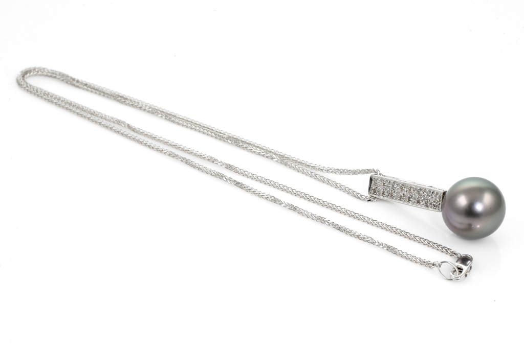 Pearl and Diamond pendant with Tahitian Pearl of 13.3mm and Diamonds totalling 0.47cts (Estimated grading: J-K VS). 18ct white gold with 44cm 18ct white gold adjustable chain. Weight: 8.4g. (Pre-owned)