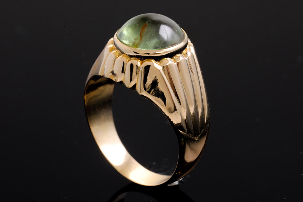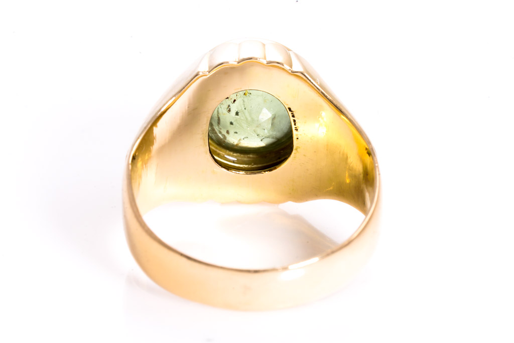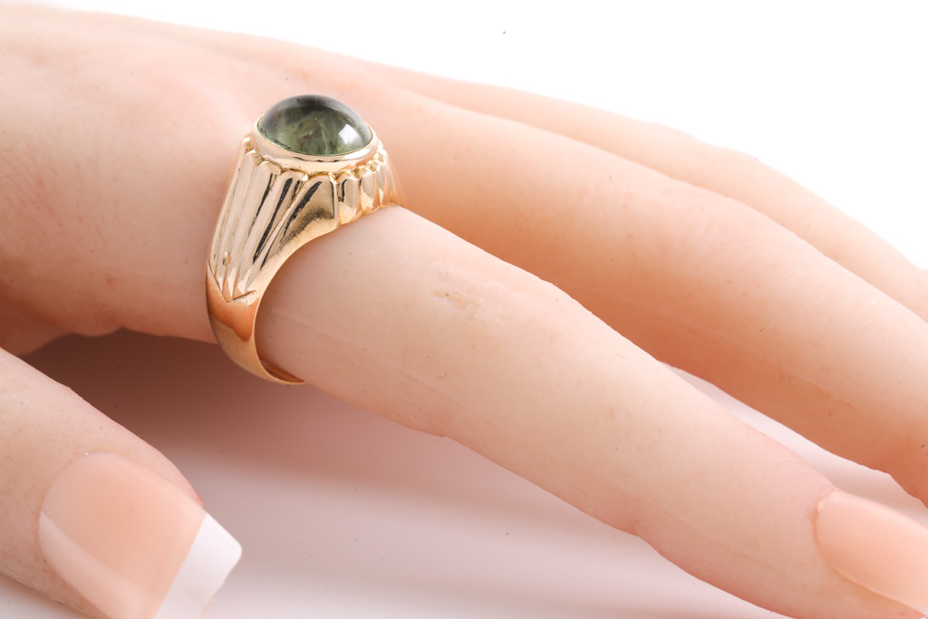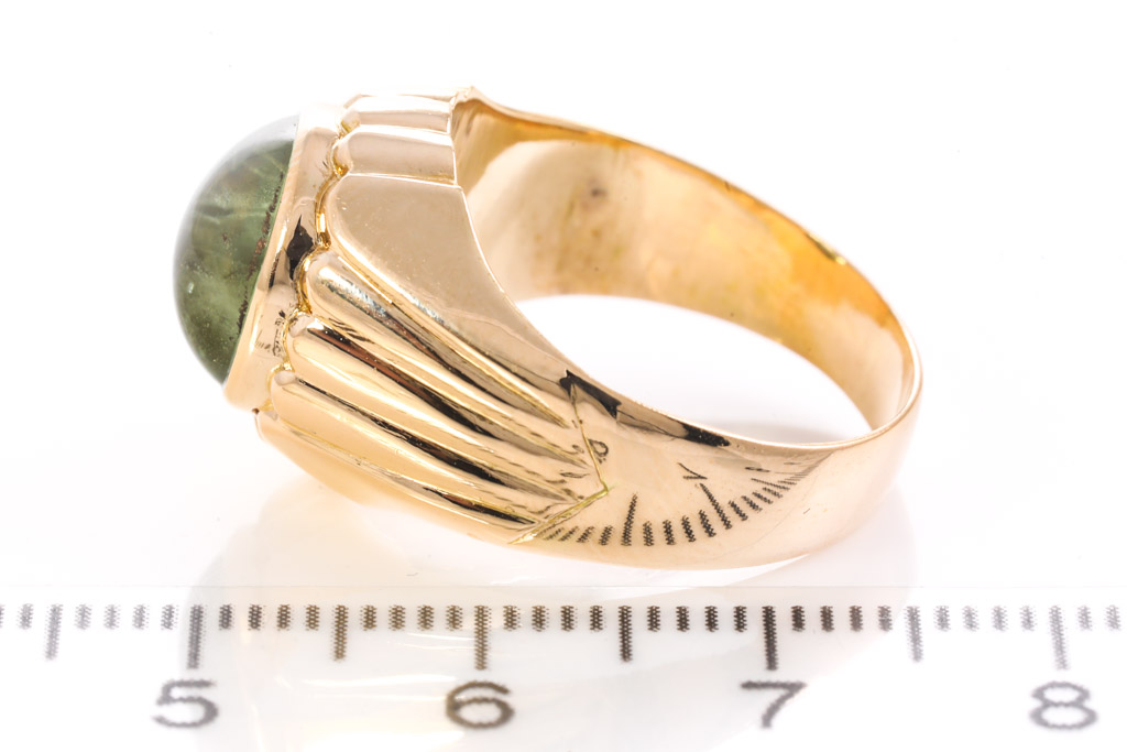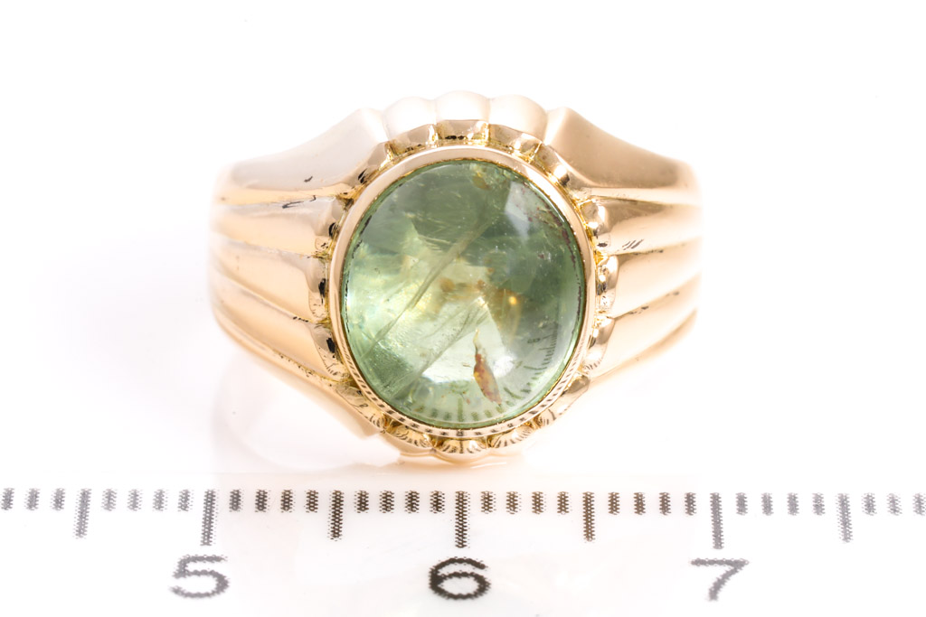 Sapphire ring with oval cabochon cut light green Sapphire of approximately 13.40ct (with natural and surface reaching inclusion). 14ct yellow gold. Ring size: Q. Weight: 8.2g. (Pre-owned)