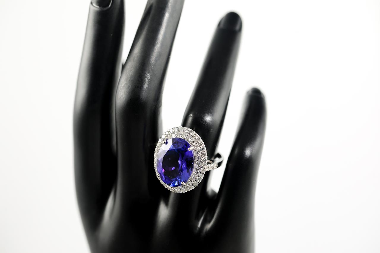 Tanzanite and Diamond Ring with an oval shape Tanzanite of 13.41ct and round Diamonds totalling 1.62cts (Estimated grading: H-I SI). Platinum. Ring size M, can be resized up by a maximum of 3 sizes, down with ring clip. Weigth: 10.9g. With certificate #415314. (Pre-owned)