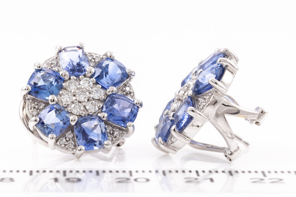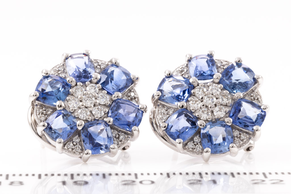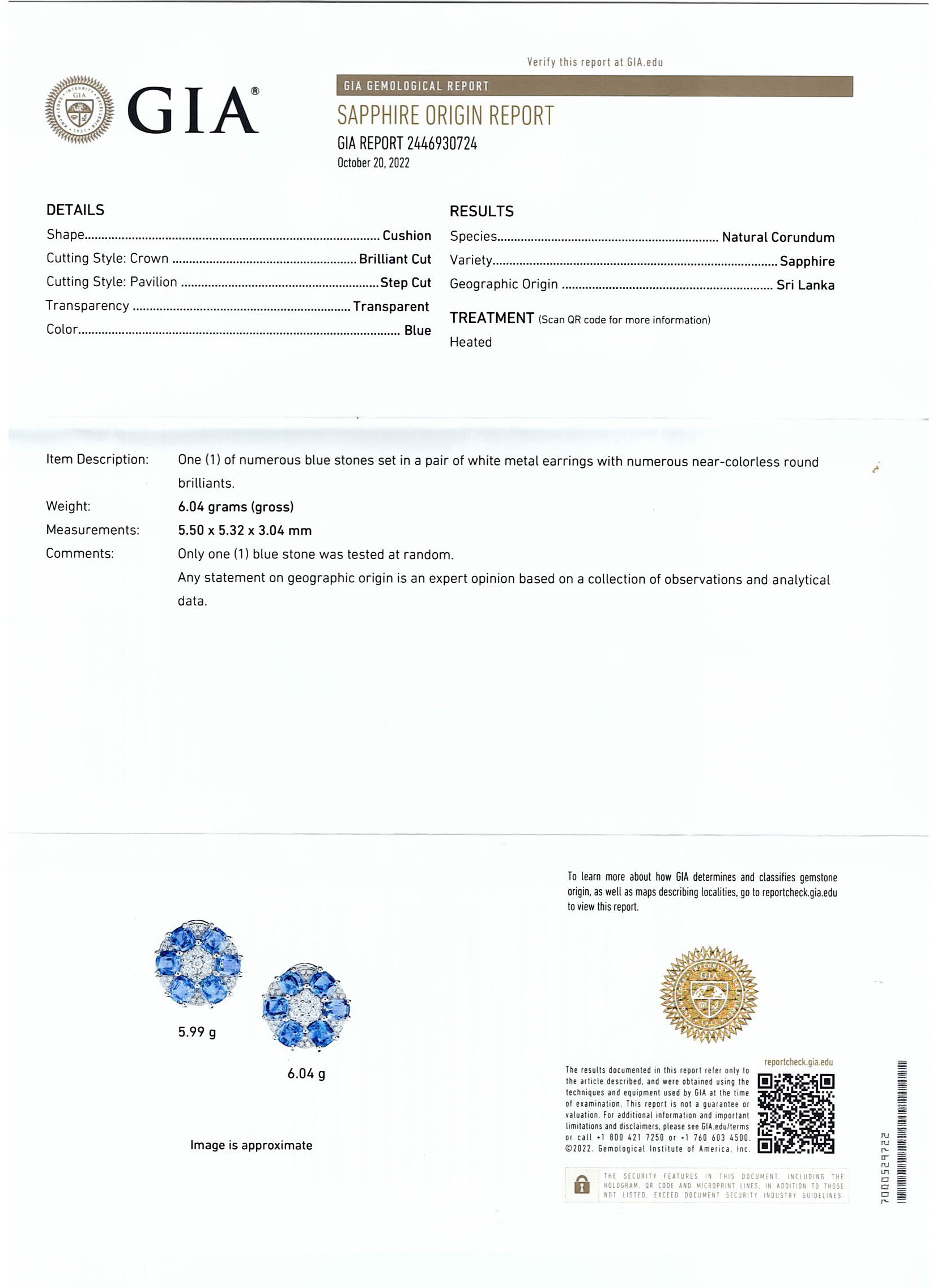 Sapphire and Diamond clip-on earrings (for pierced ears) with cushion cut Ceylon blue Sapphires totalling approximately 13.46cts (one Sapphire with GIA Origin Report #2446930724) and round Diamonds totalling 0.93cts (Estimated grading: G VS-SI). 18ct white gold. Weight 6.0g. (Pre-owned)