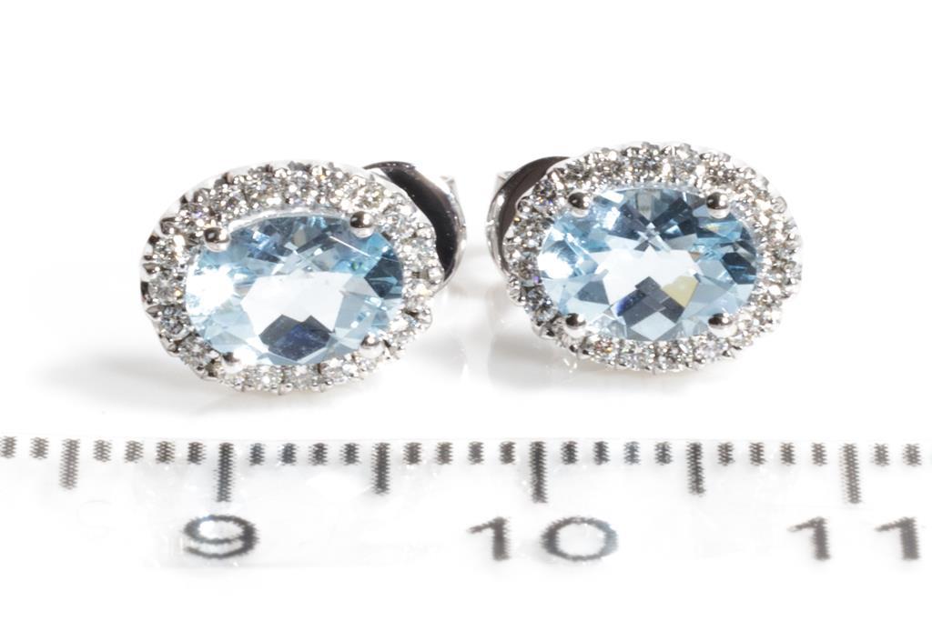 Aquamarine and Diamond earrings with oval Aquamarine totalling 1.34cts and round Diamonds totalling 0.23cts. 14ct white gold. Weight 2.44g. (New)