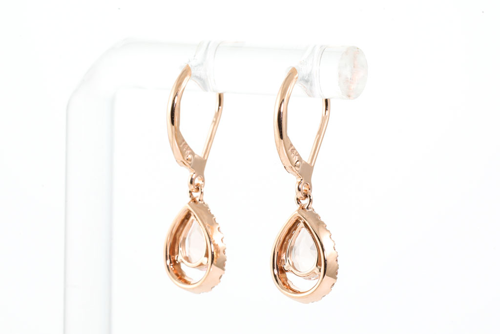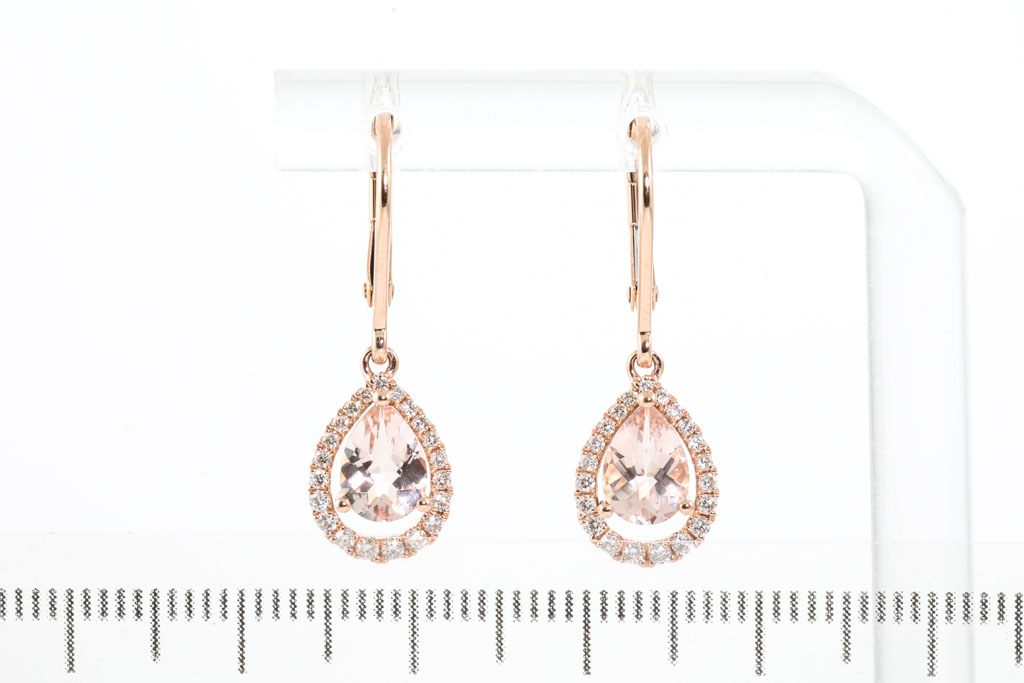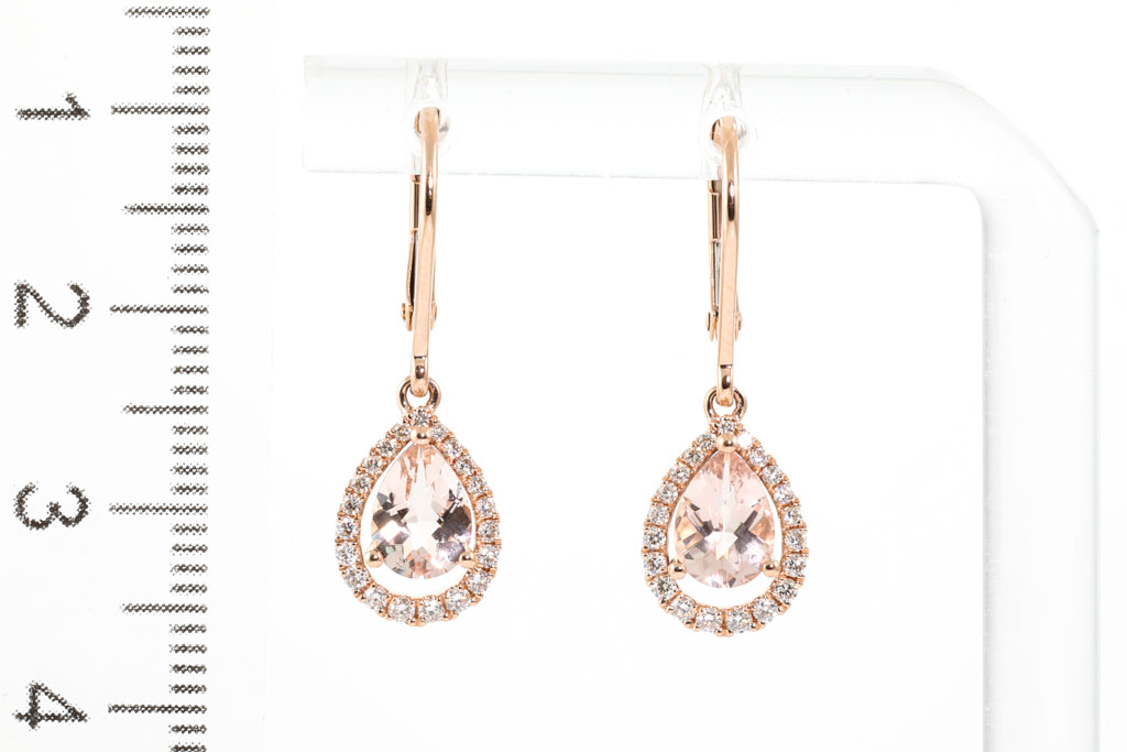 Morganite and Diamond lever back earrings with pear checkerboard cut Morganite totalling 1.34cts and round Diamonds totalling 0.28cts (Estimated grading: H SI). 14ct rose gold. Weight: 2.6g. (New)