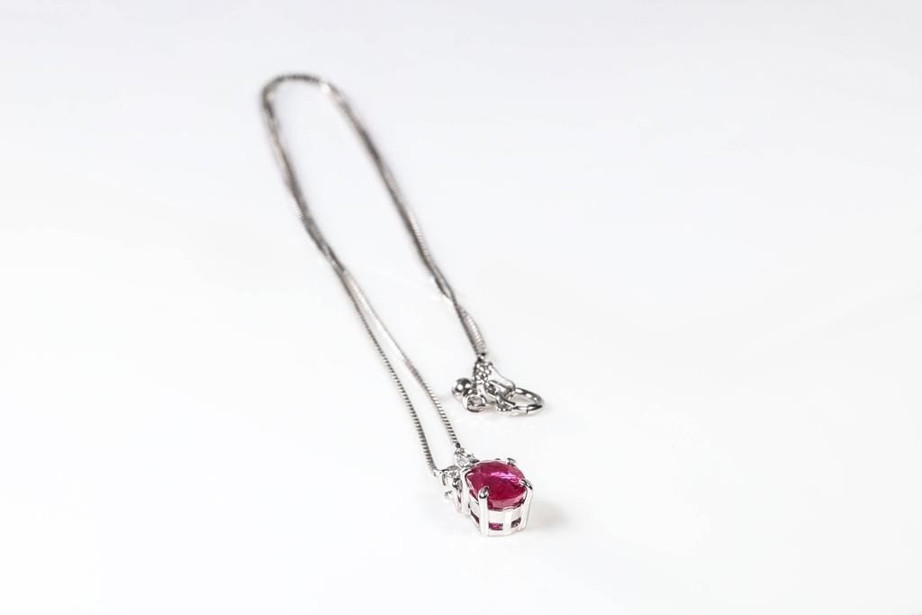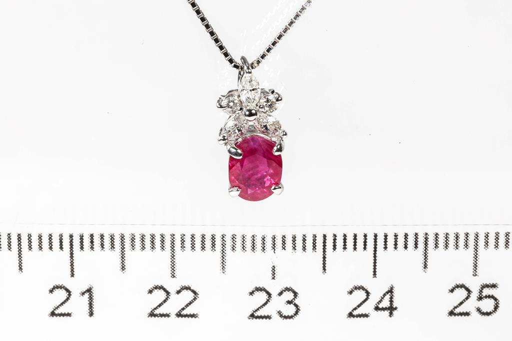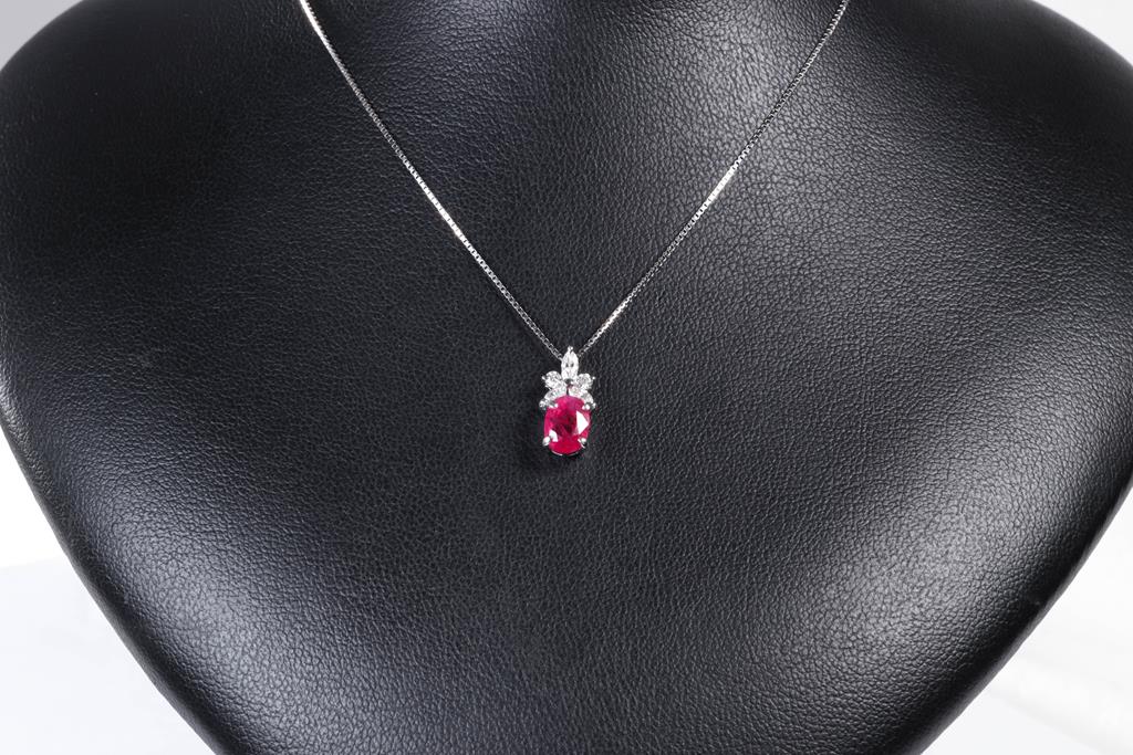 Ruby and Diamond pendant with an oval shape Ruby of 1.34cts with round and marquise cut Diamonds totalling 0.25cts. Platinum with 44cm 18ct white gold adjustable chain. Weight: 3.5g. (Pre-owned)