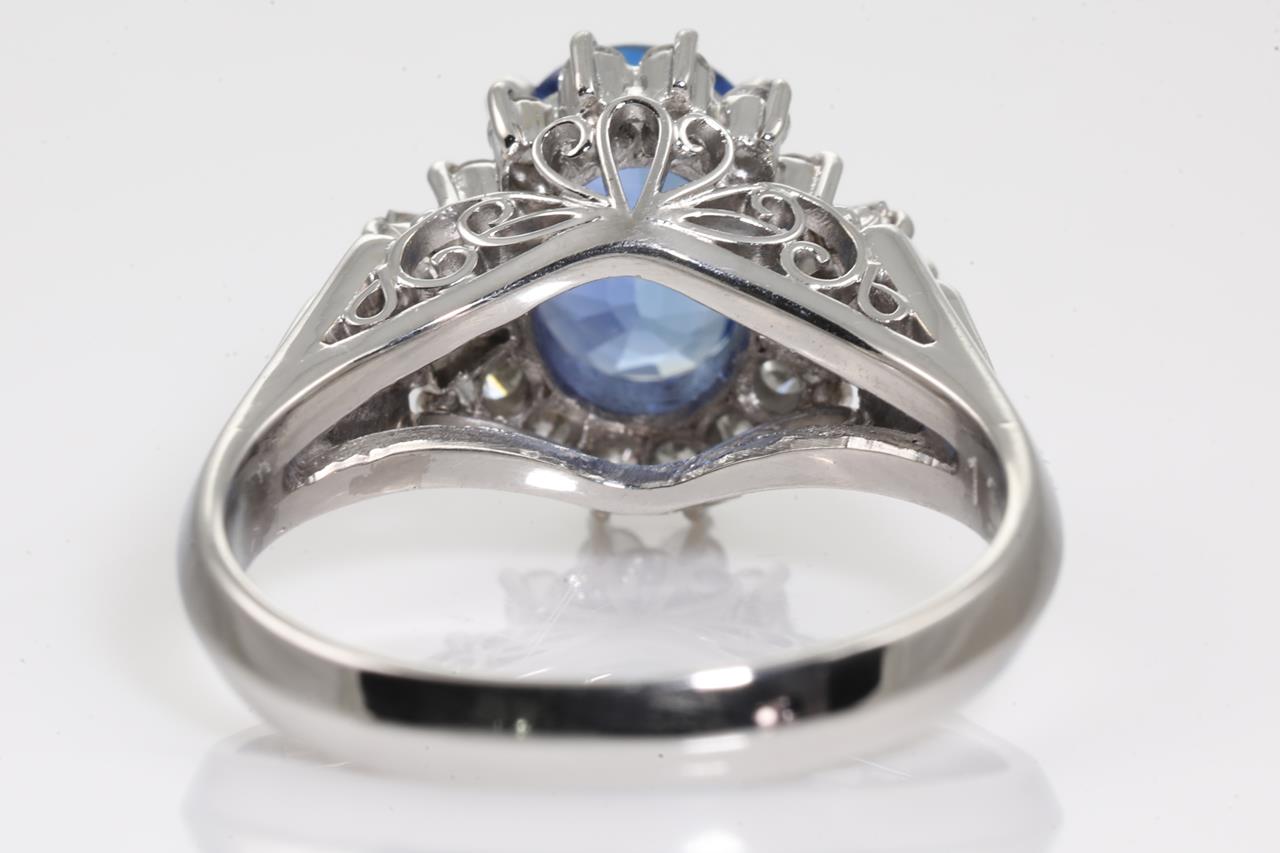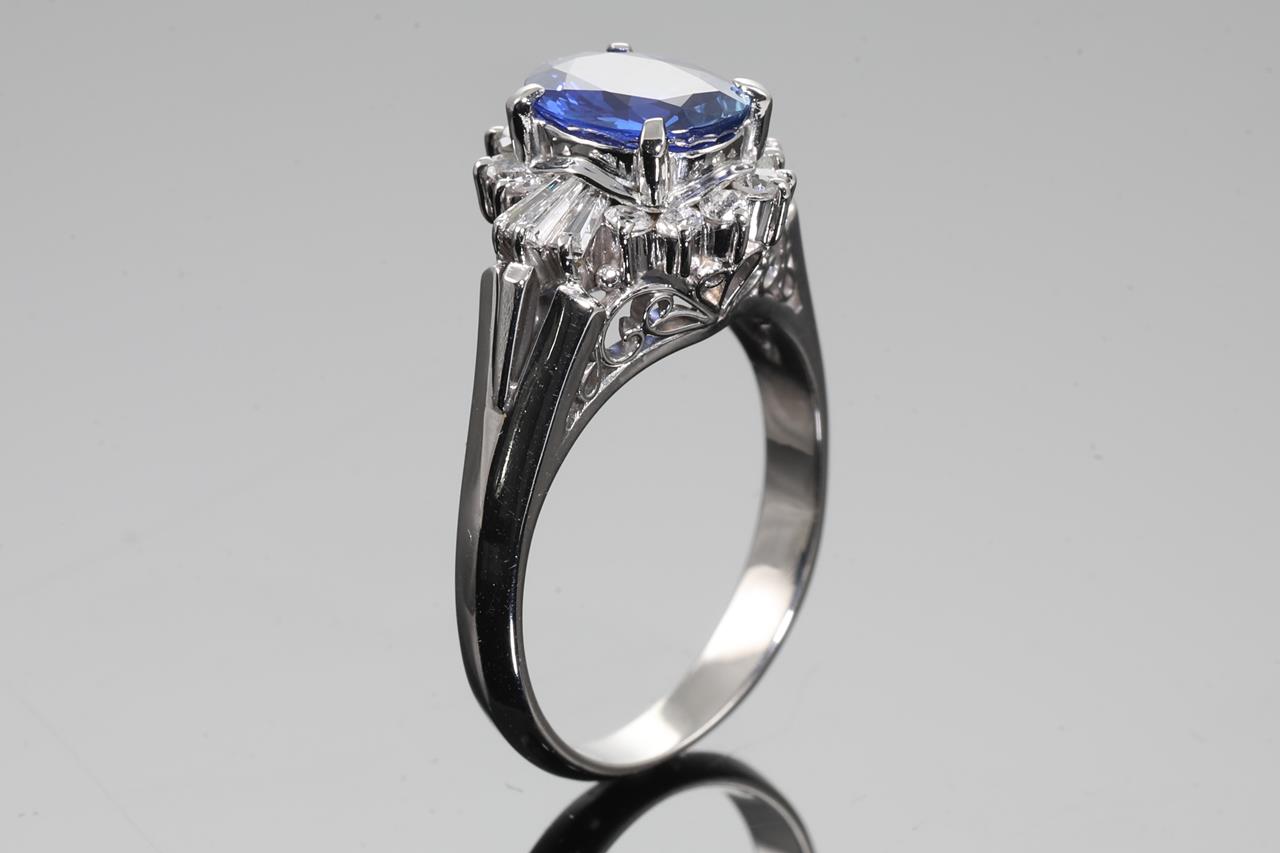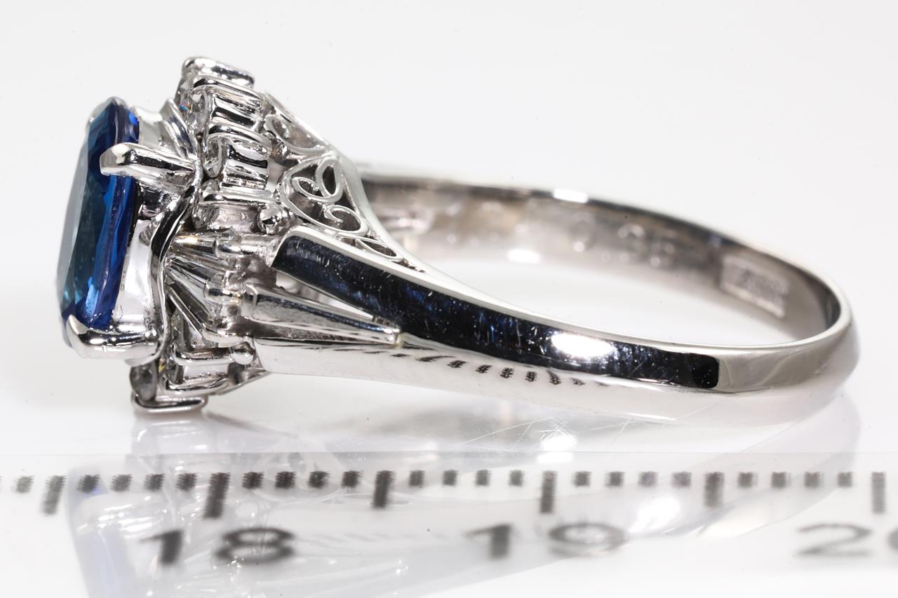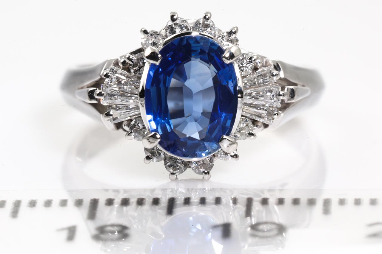 Sapphire and Diamond ring with centre oval shape Sapphire of 1.34cts and surrounding round and baguette cut Diamonds totalling 0.35cts (Estimated grading: H P1-2). Platinum. Ring size: J. Weight: 5.9g. (Pre-owned)