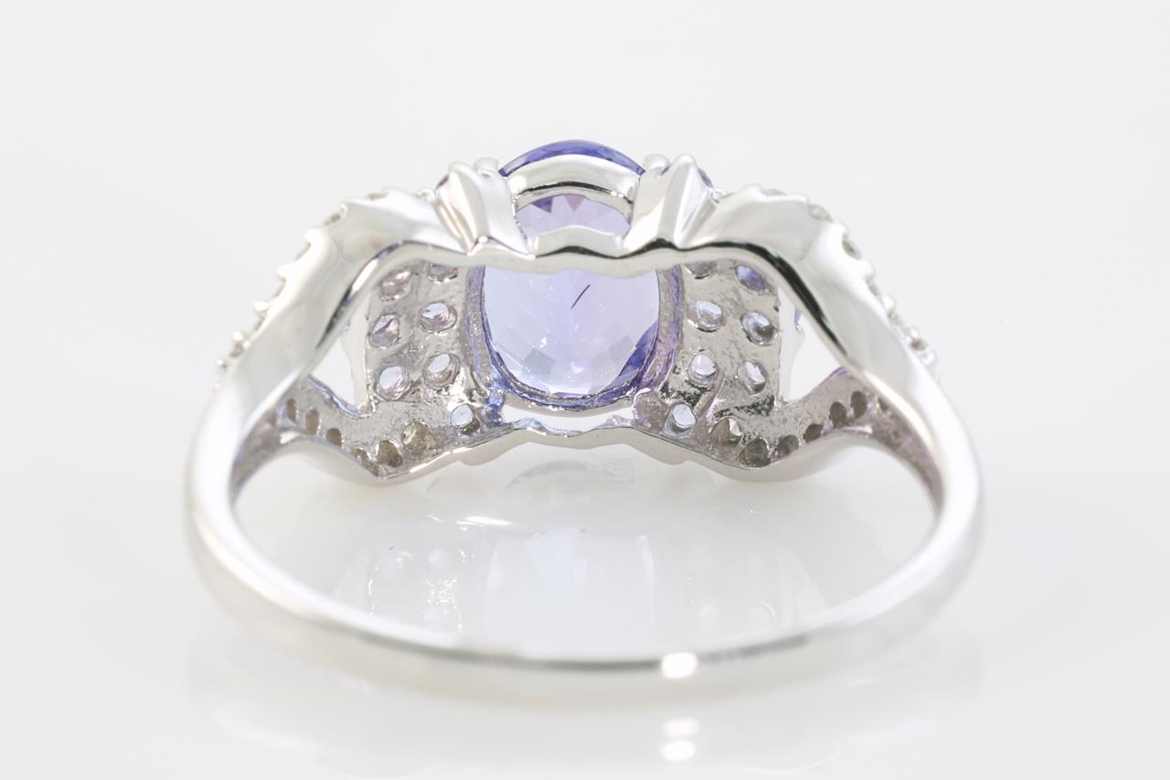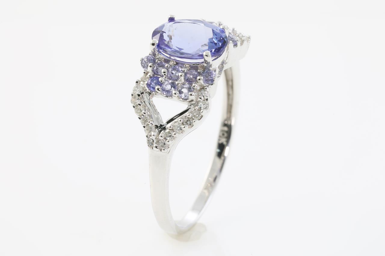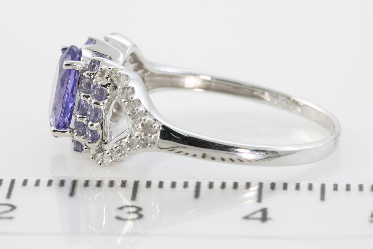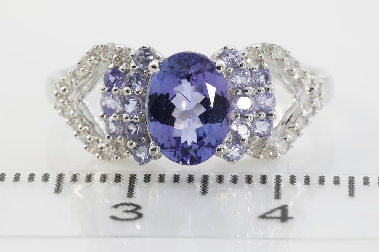 Tanzanite and Diamond ring with centre oval Tanzanite and surrounding round Tanzanites totalling 1.34cts and Diamonds totalling 0.14cts. 10ct white gold. Ring size P. Weight:2.6g (As New)