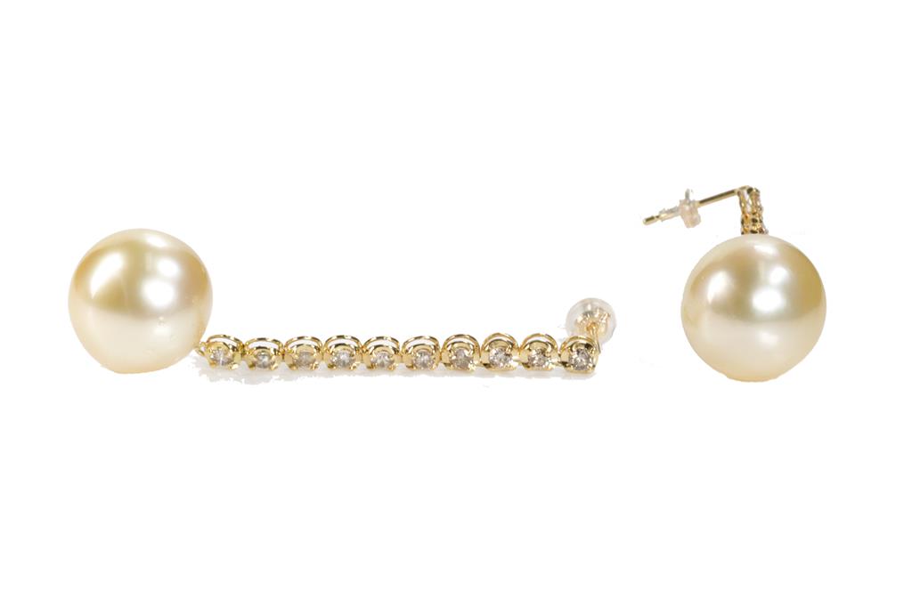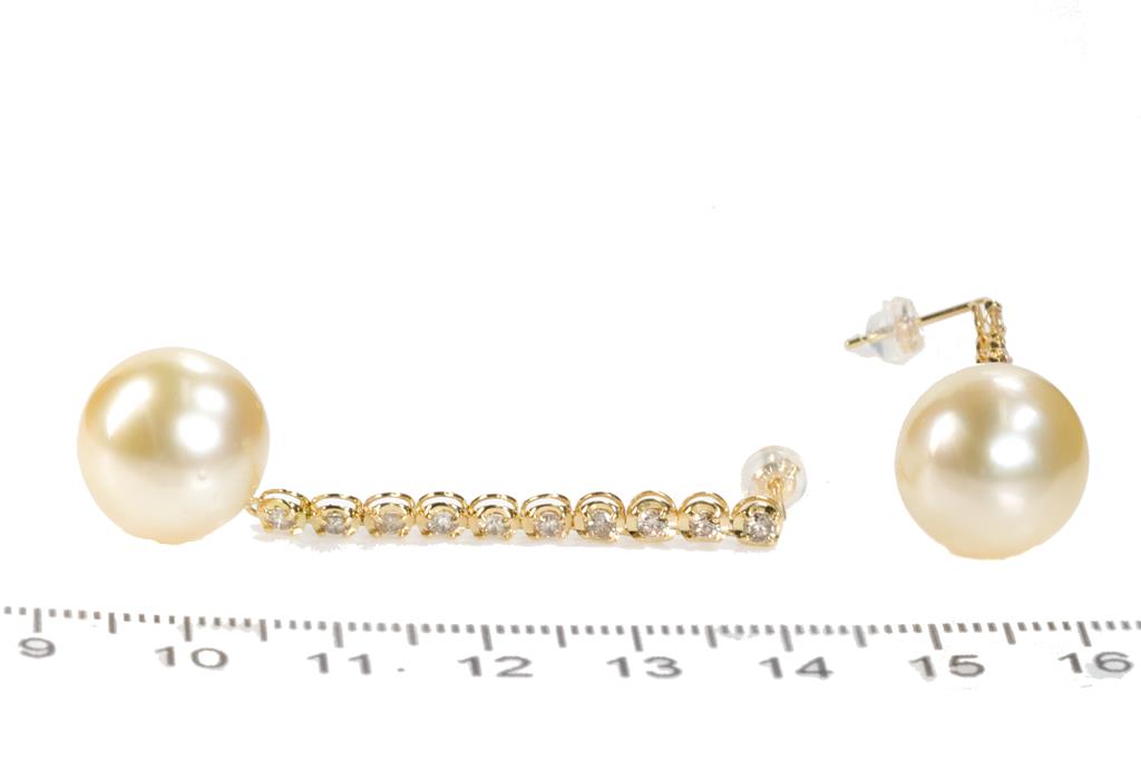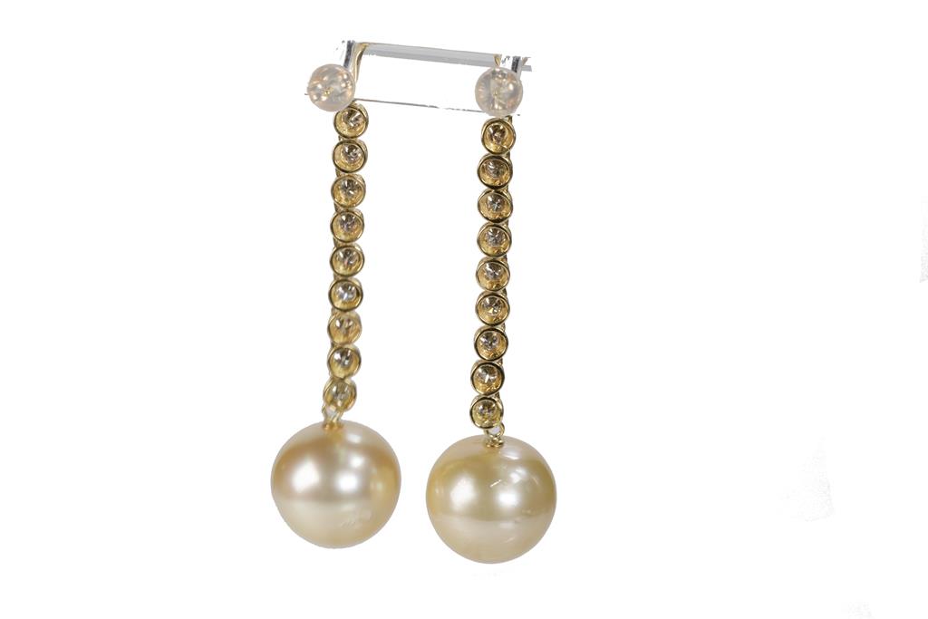 Pearl and Diamond drop earrings with golden South Sea Pearl of 13.4mm and round Diamonds totalling 1.00cts (Estimated grading: M-N SI). 18ct yellow gold with silicon backs. Weight: 9g. (Pre-owned)