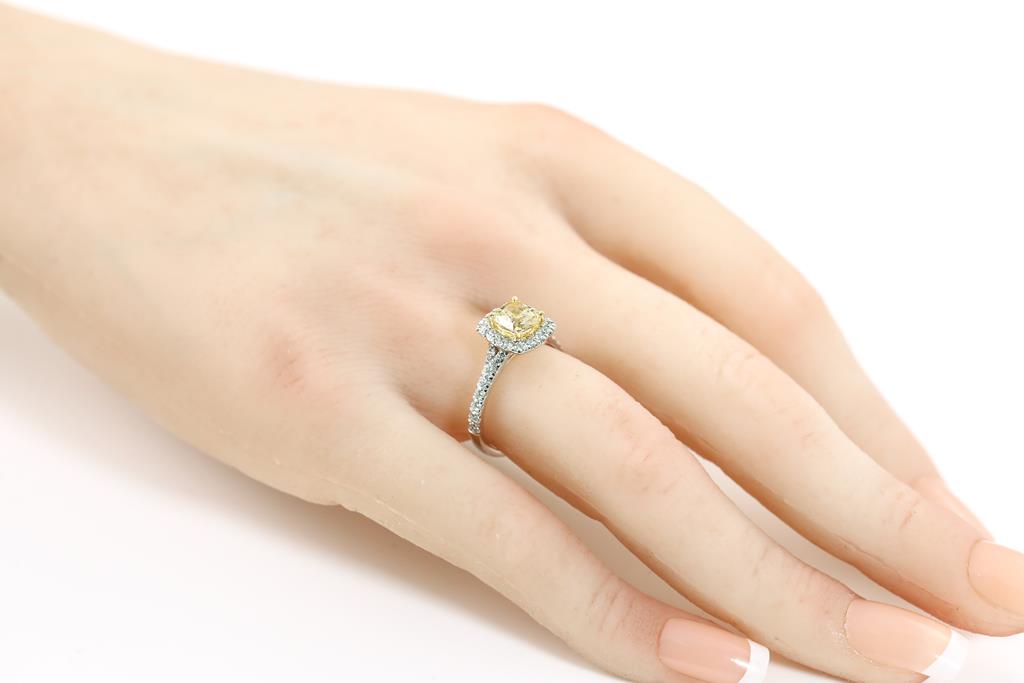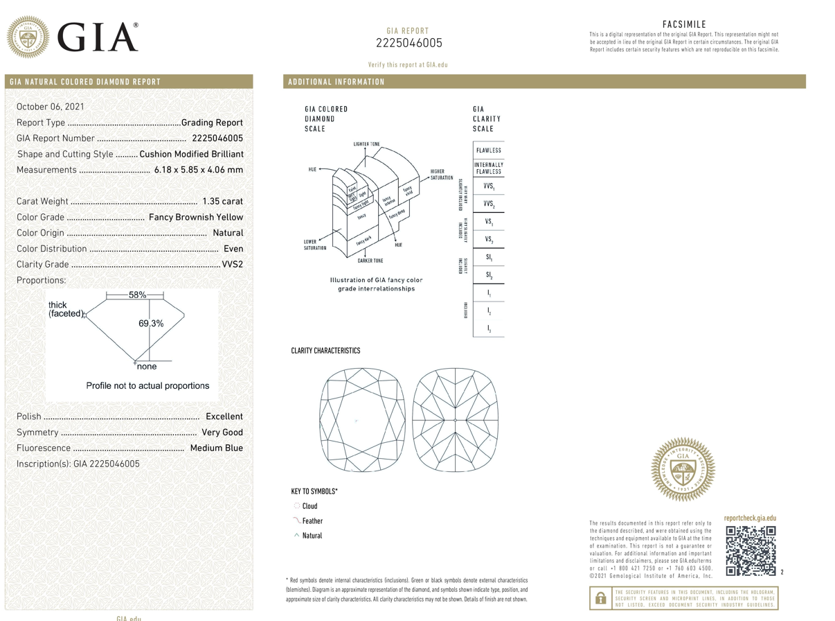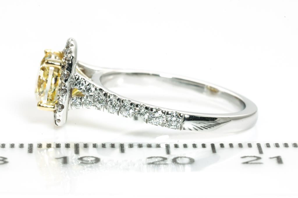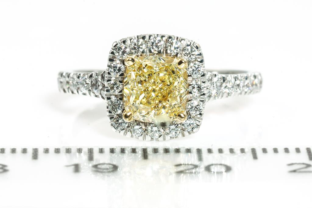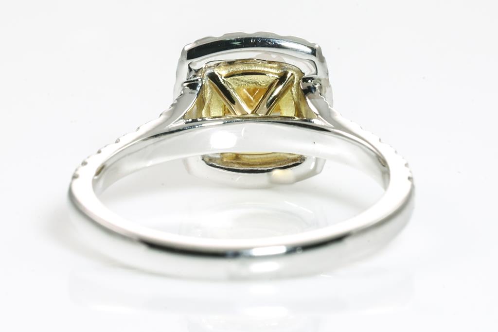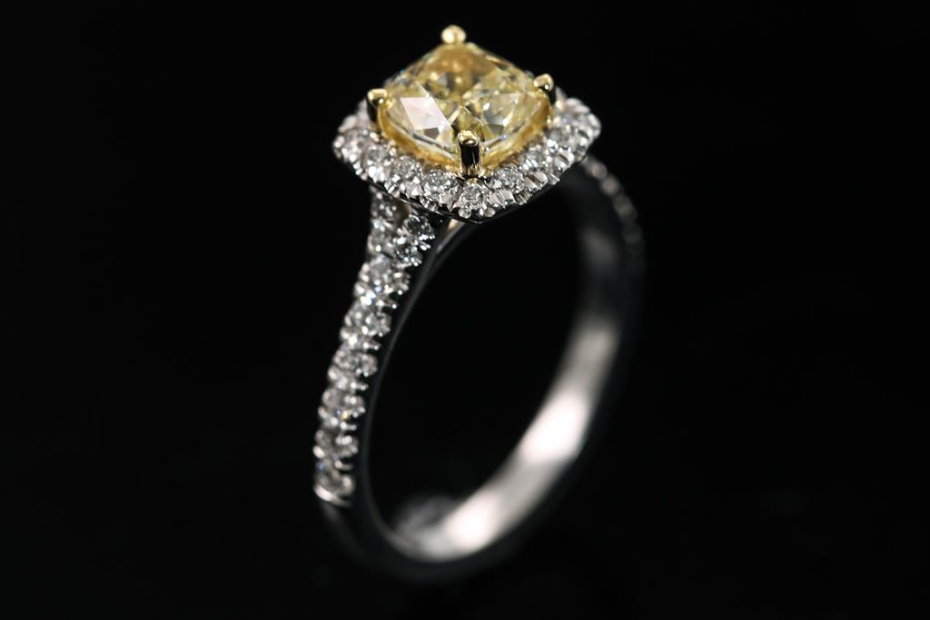 Diamond halo ring with centre cushion cut Diamond of 1.35ct (with GIA report graded as Natural Fancy Brownish Yellow Even VVS2 #2225046005) and diamonds totalling 0.48cts (Estimated grading: G-H SI). 18ct white and yellow gold. Ring size: L. Weight: 4.2g. (New).