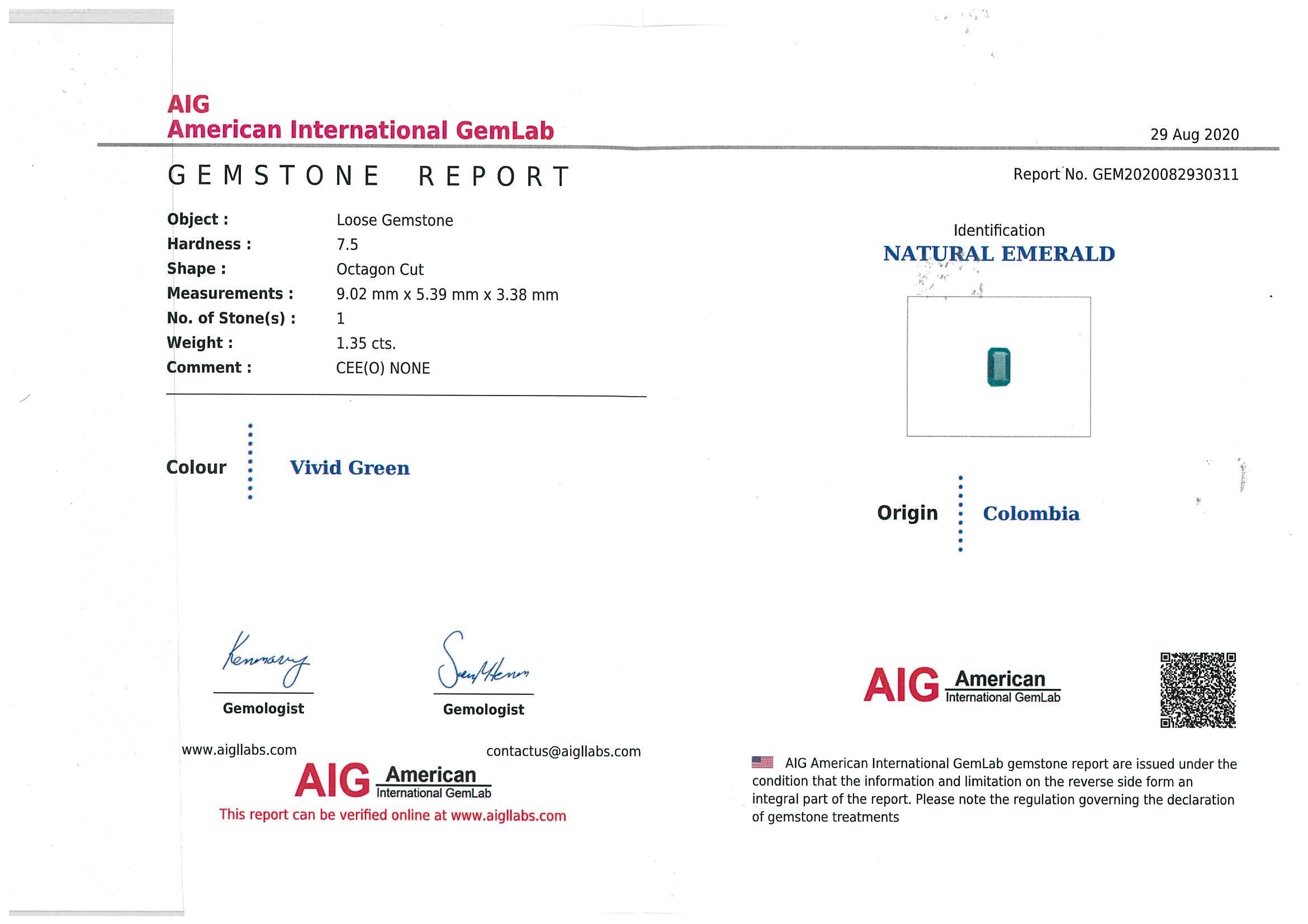 A loose Octagon cut Natural Emerald of 1.35ct (with AIG report #GEM2020082930311). Size: 9.0 x 5.3 x 3.3mm. (New)