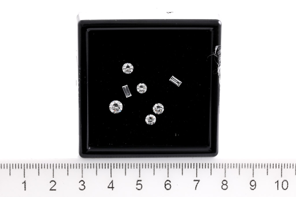 A loose parcel of 5 round and 2 baguette cut diamonds totalling approximately 1.35cts. Approximate size of rounds: 3.6-4.7mm, baguettes, length and width: 4.37 x 1.91mm and 4.15 x 1.95mm (Estimated grading SI G-H). (As New)