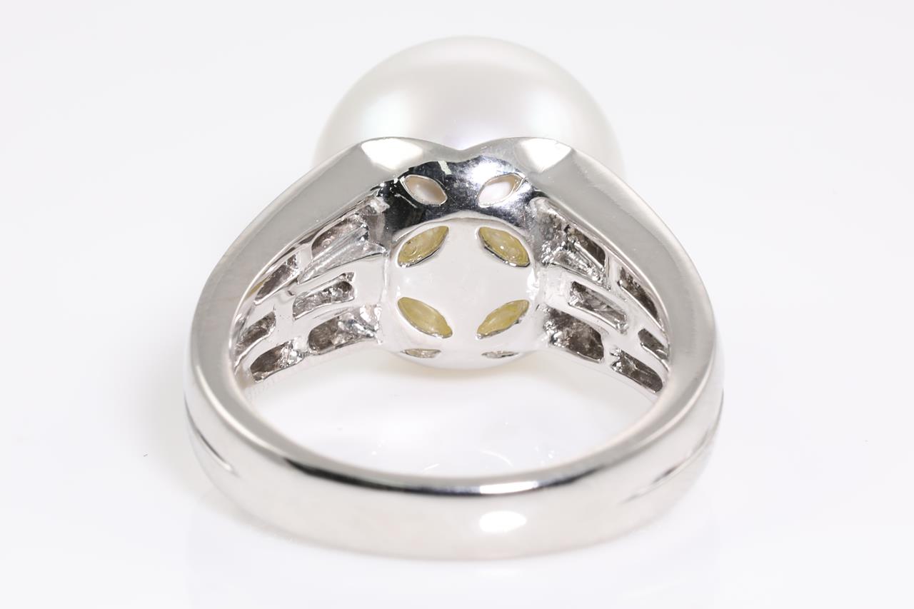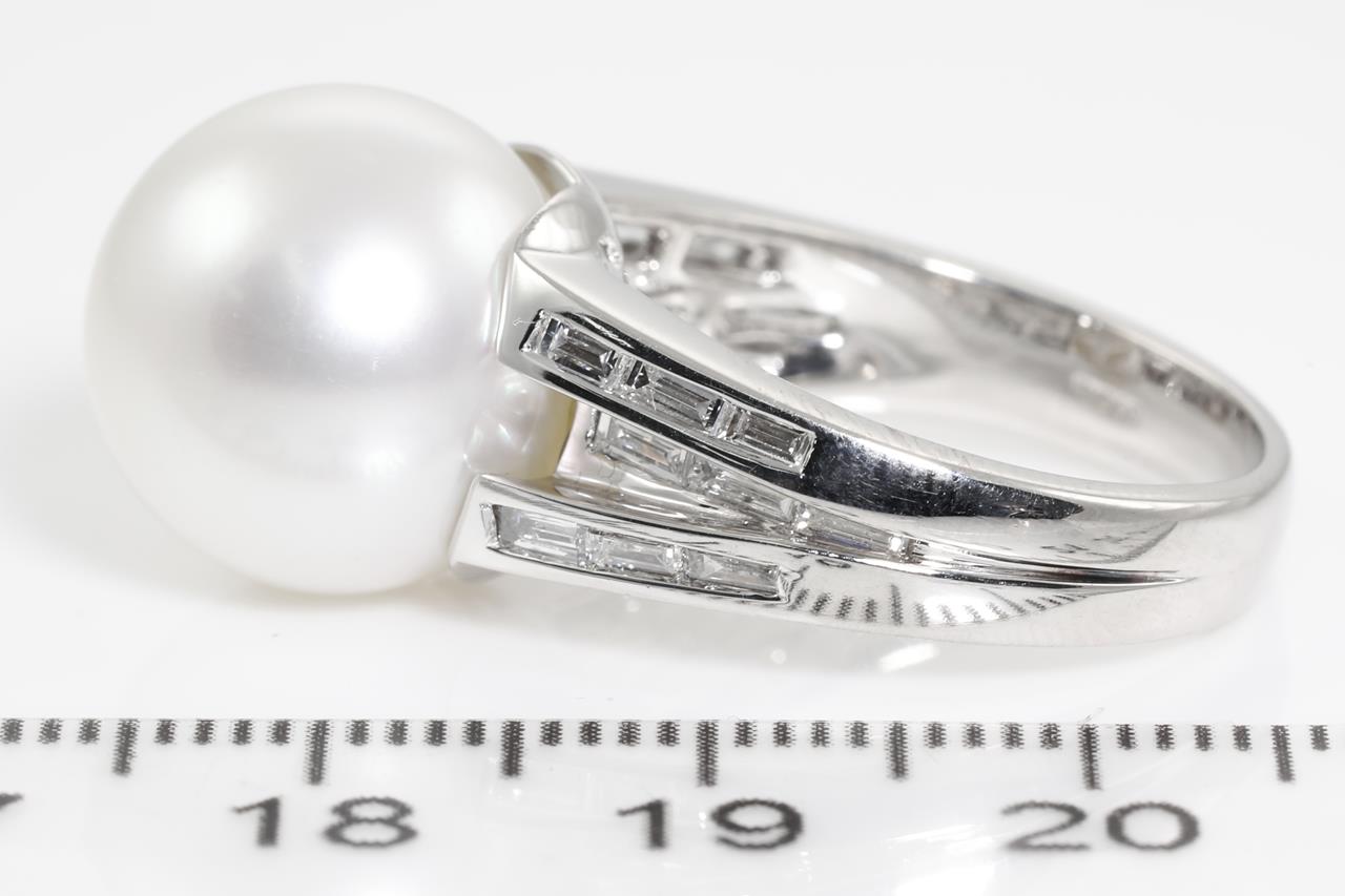 Pearl and Diamond ring with South Sea Pearl of 13.5mm baguette cut Diamonds totalling 0.62cts (Estimated grading: G-H VS-SI). Platinum. Ring size O - cannot be resized up, down with ring clip. Weight: 13.8g (Pre-owned)