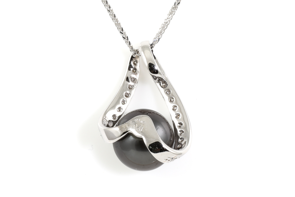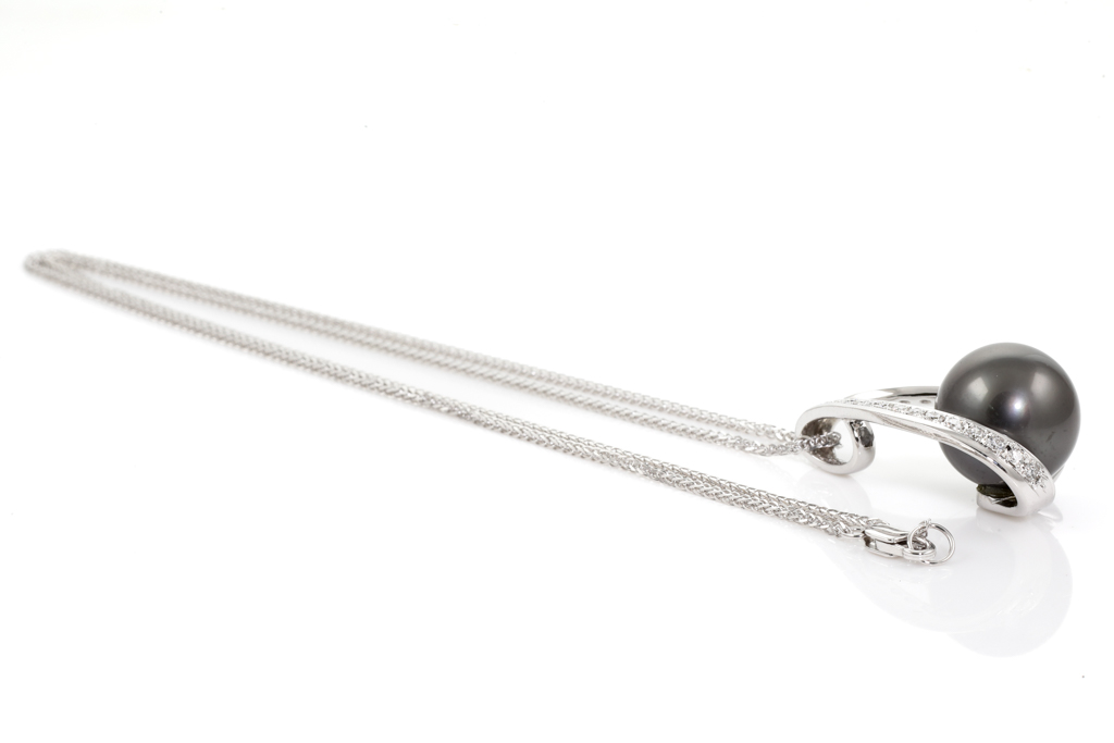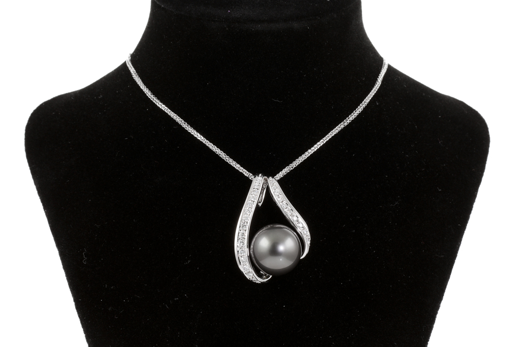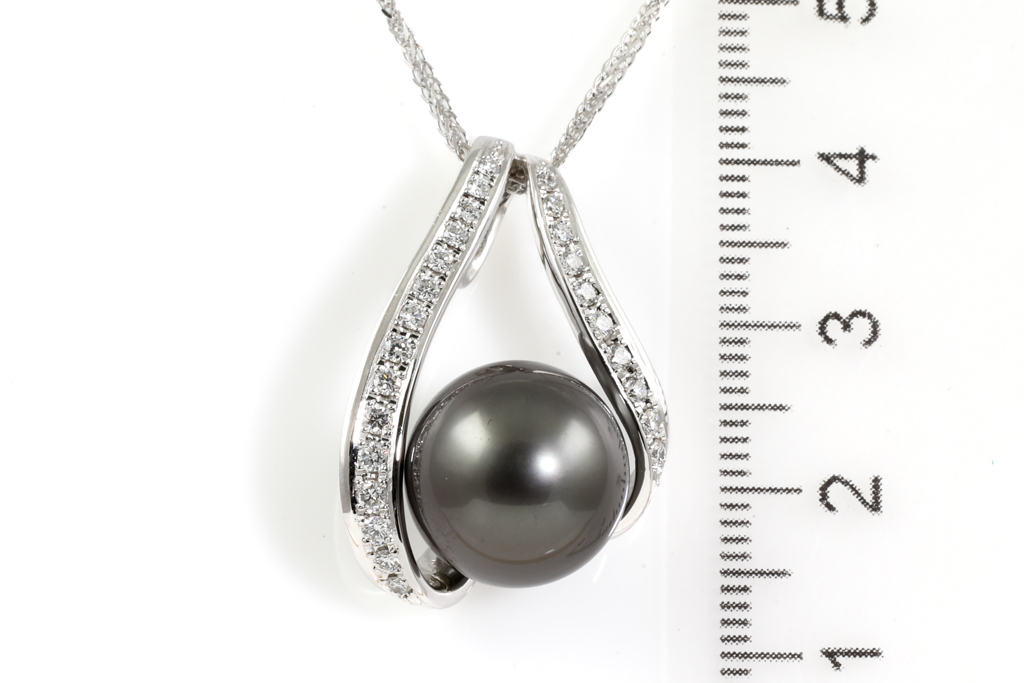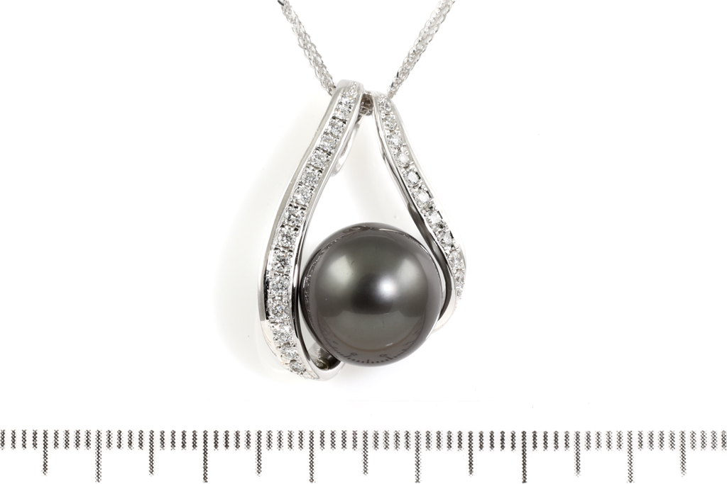 Tahitian and Diamond pendant with Tahitian Pearl of 13.5mm and round Diamonds totalling 0.41cts (Estimated grading: H SI). 18ct white gold with 45cm 18ct white gold chain. Weight: 11.6g. (Pre-owned)