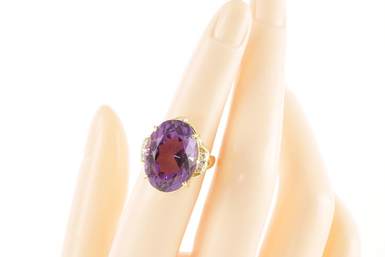 Amethyst and Diamond ring with an oval Amethyst of 13.65ct and Diamonds totalling 0.11cts. 18ct yellow gold. Ring size K1/2. Weight: 10.4g (Pre-owned)