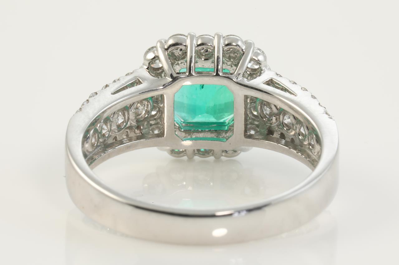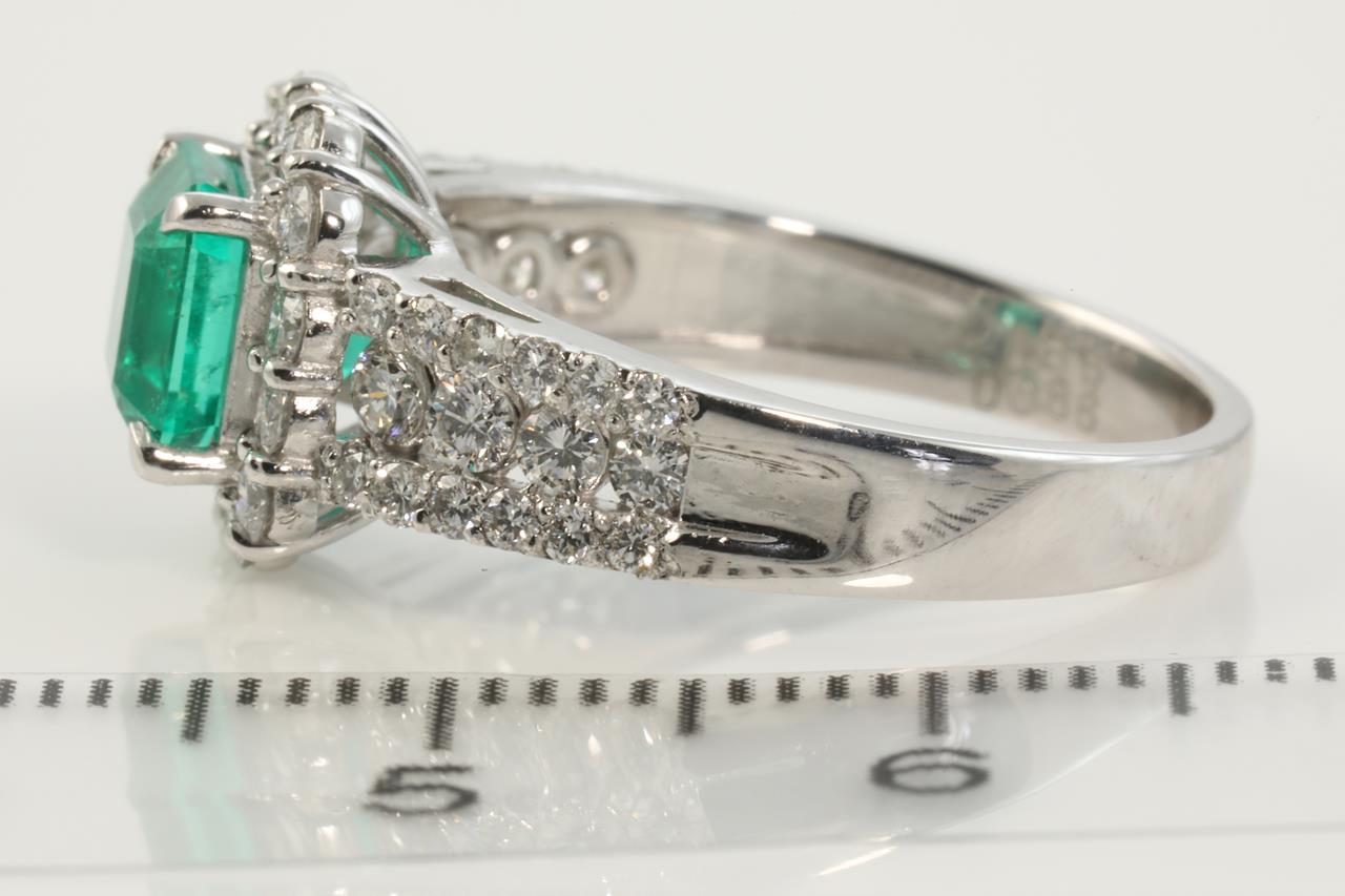 Emerald and Diamond ring with octagonal step cut Colombian Emerald of 1.36ct (with GRS Gemstone report #GRS2019-098674) and Diamonds totalling 0.86cts (Estimated grading: G SI). Platinum. Ring size M1/2 - ring resizing up is not recommended, can only be resized down with ring clip. Weight: 6.1g (Preowned)