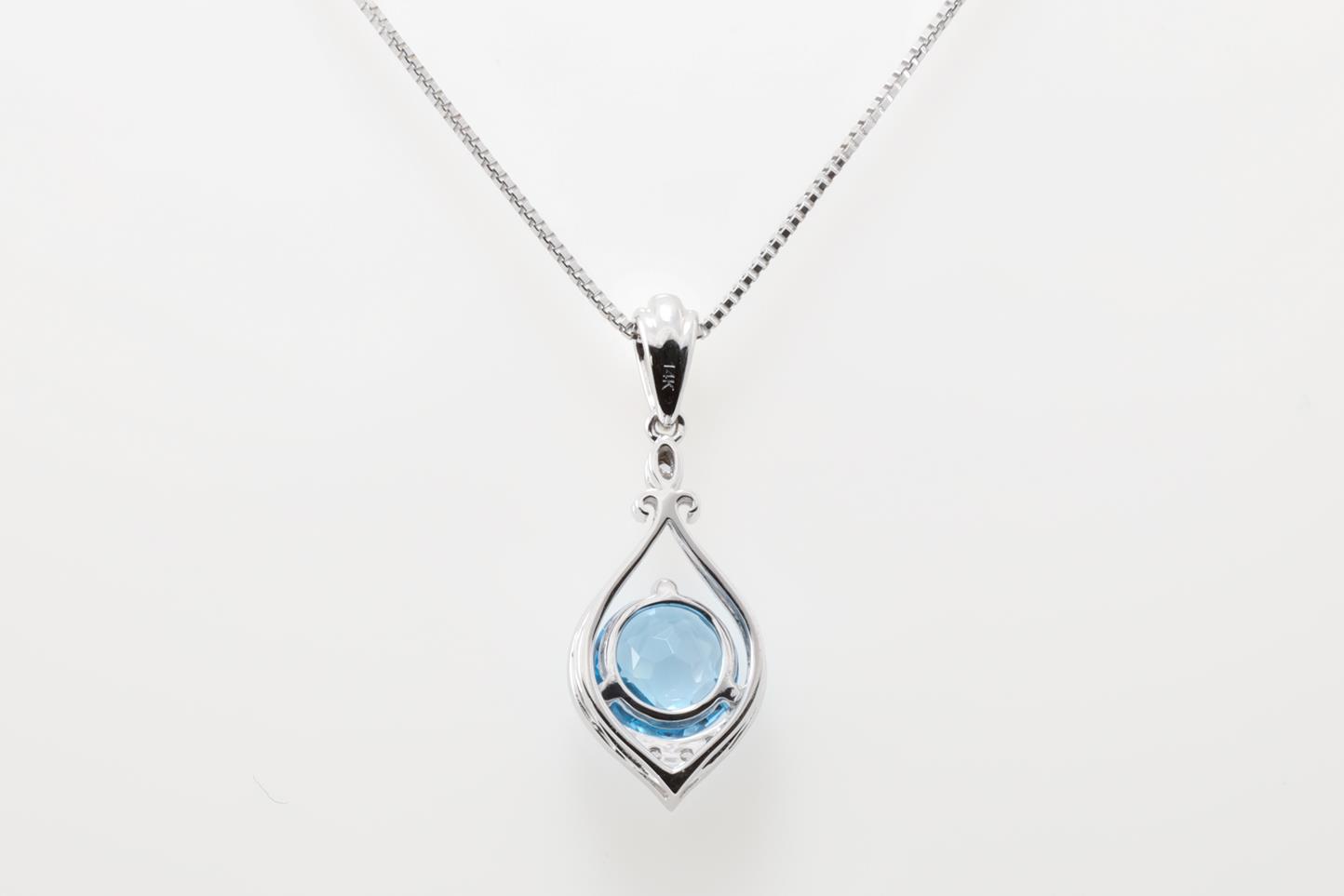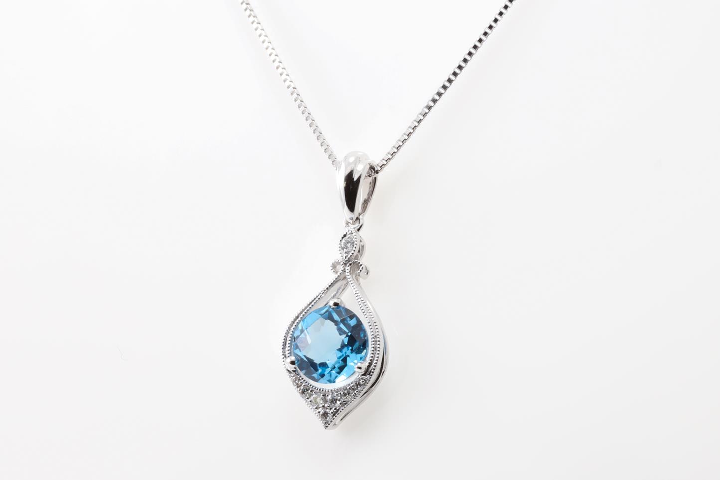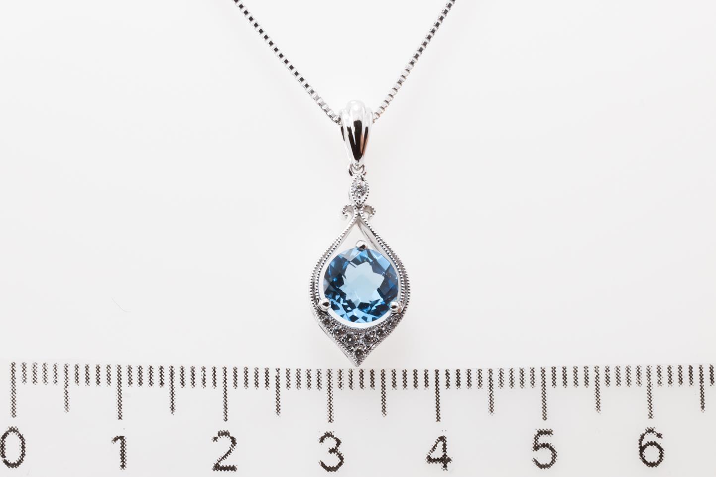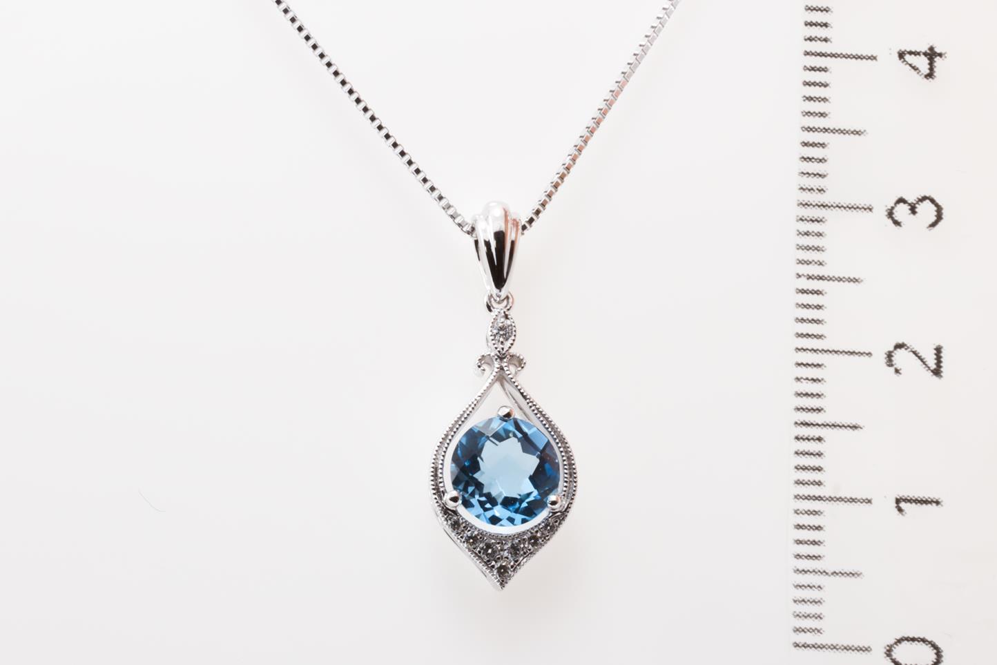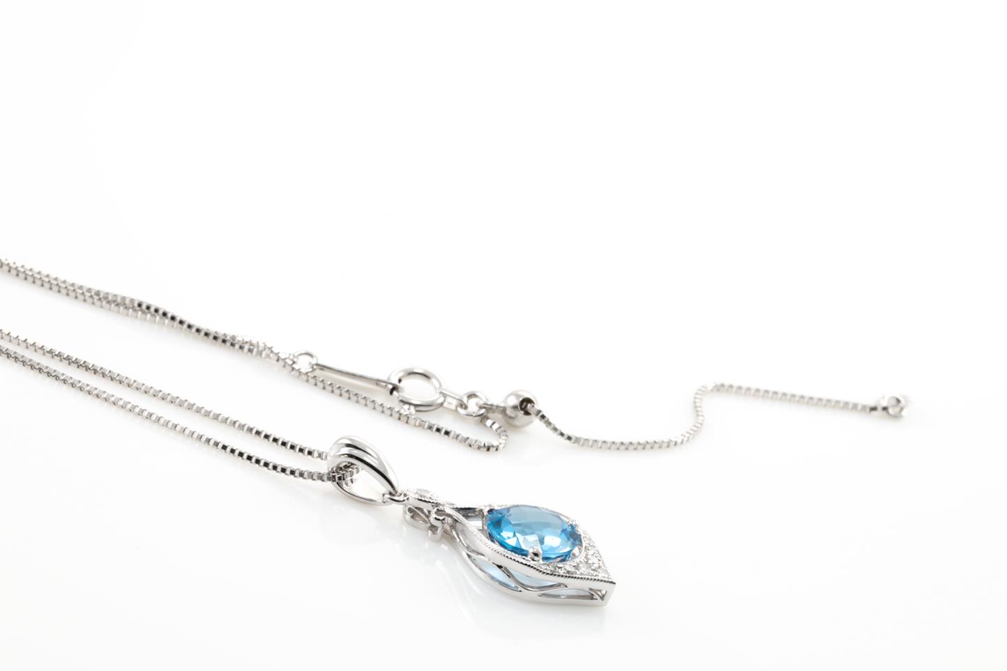 Topaz and Diamond pendant with round Blue Topaz of 1.36ct and Diamonds totalling 0.07cts. 14ct white gold with 18ct gold adjustable 45cm chain. Weight: 5.3g (New)