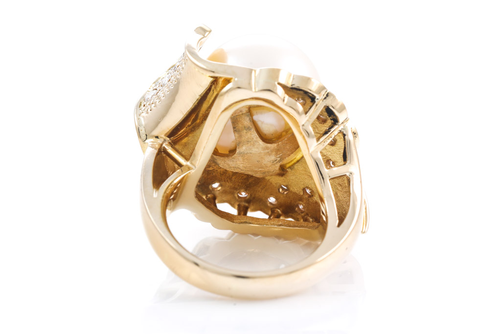 Pearl and Diamond ring with pinkish South Sea Pearl of 13.6mm and round Diamonds totalling 0.80cts (Estimated grading: G-H SI-SI). 18ct yellow gold. Ring size J. Weight: 18g. (Pre-owned)