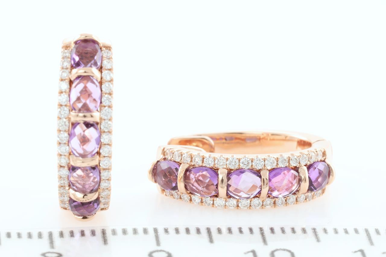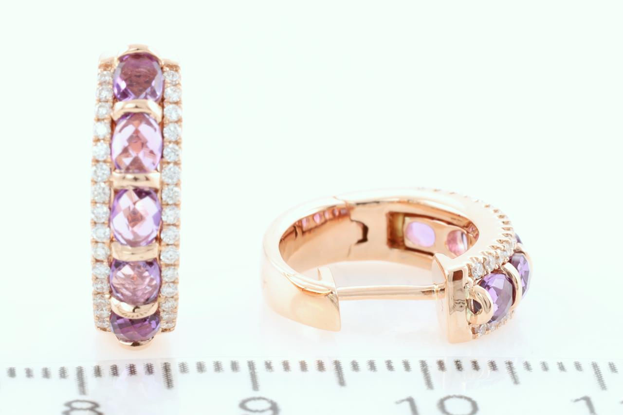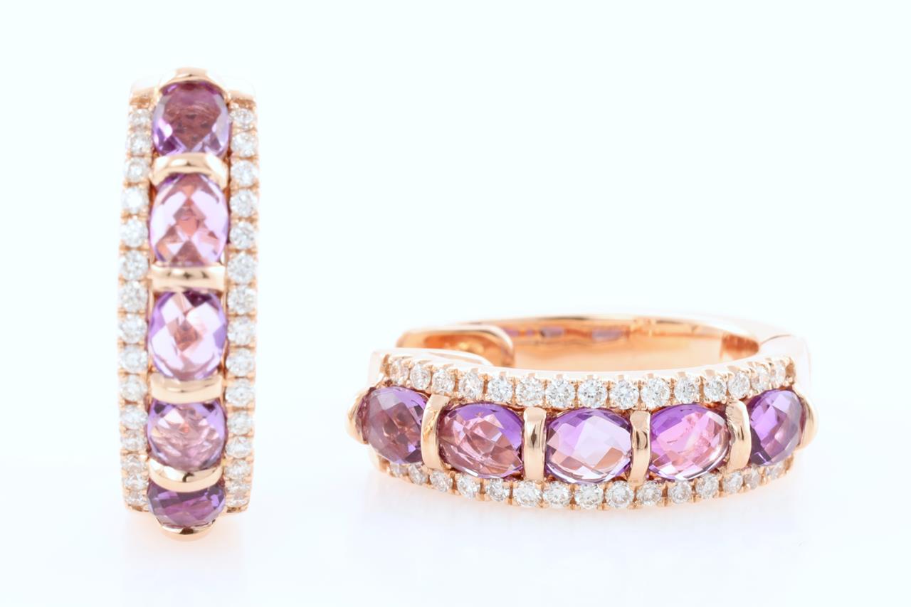 Amethyst and Diamond huggie earrings with oval checkerboard cut Amethysts totaling 1.37cts and Diamonds totalling 0.32cts (Estimated grading: H-I SI) 14ct Rose gold. Weight: 6.8g (New)