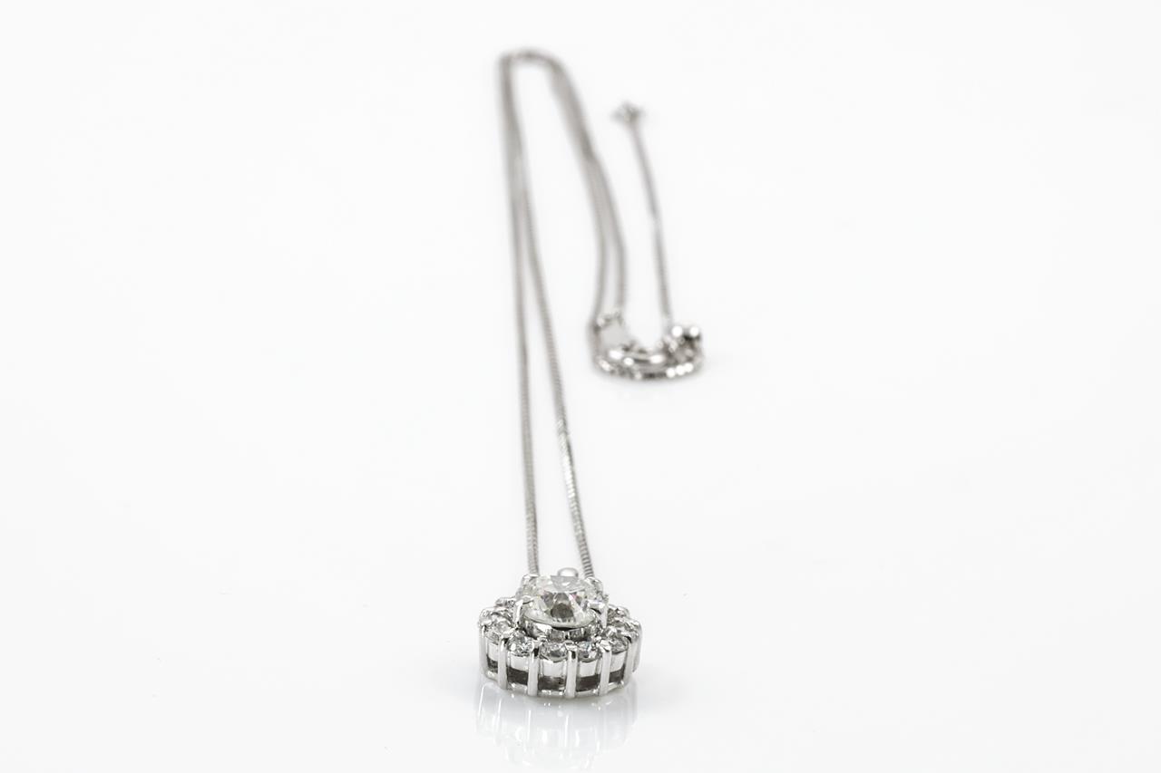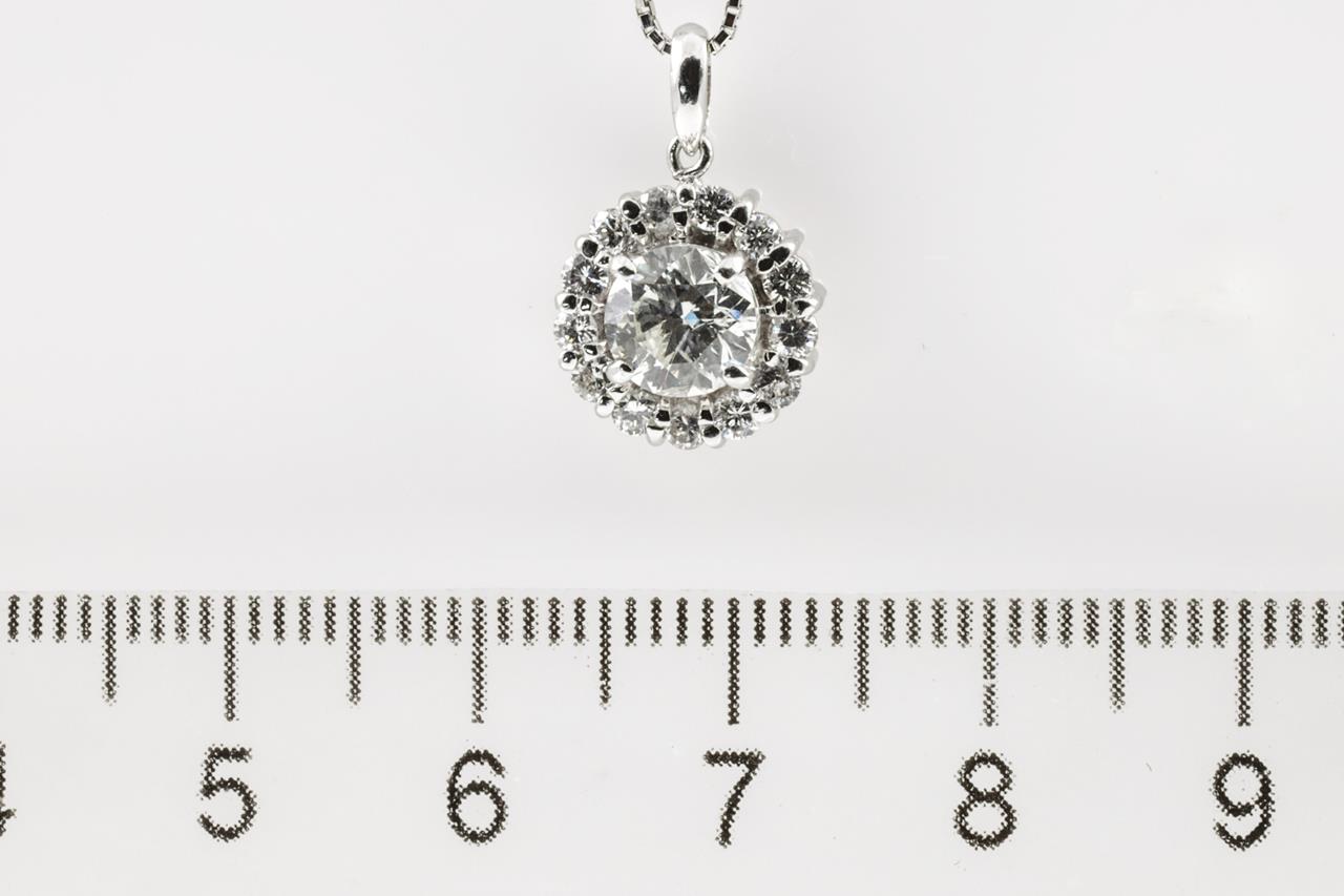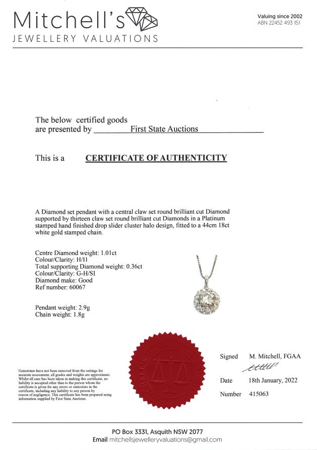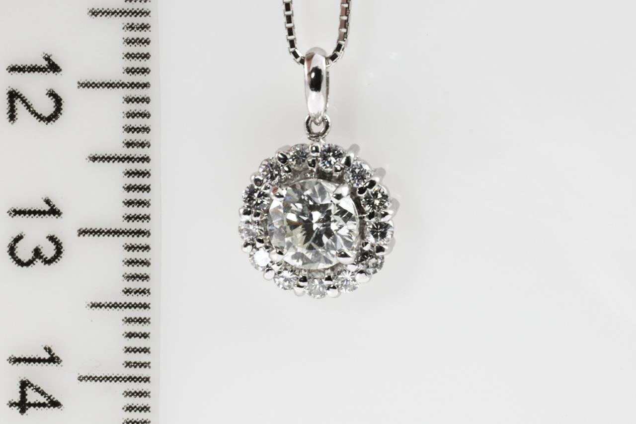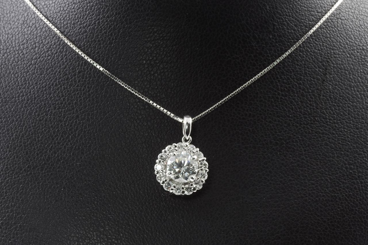 Diamond halo pendant with a centre round Diamond of 1.01ct (Estimated grading: H P1) and remaining Diamonds totalling 0.36cts (Estimated grading: G-H SI). Platinum with 44cm 18ct white gold adjustable chain. Weight: 4.7g. With certificate #415063 (Pre-owned)
