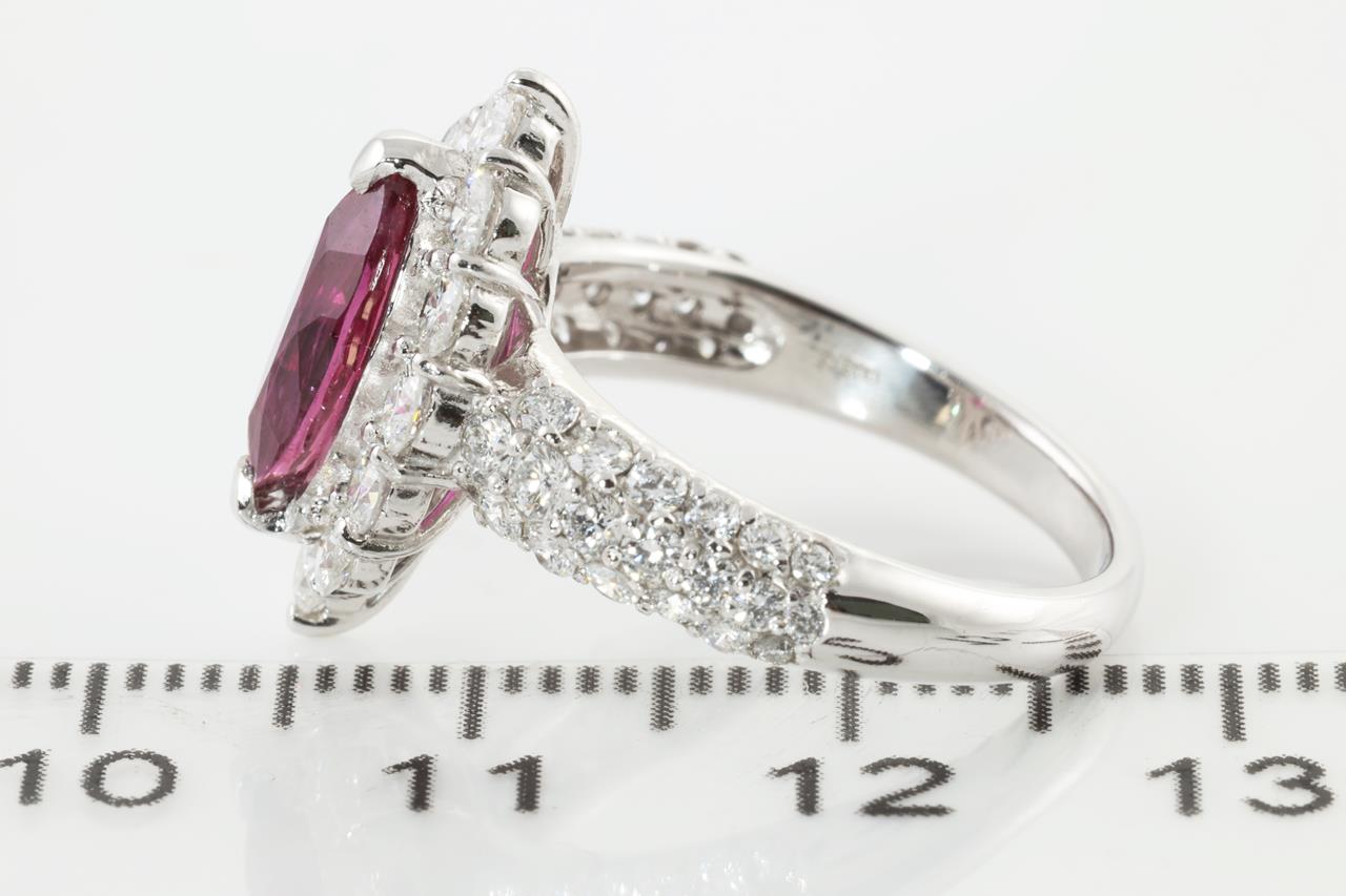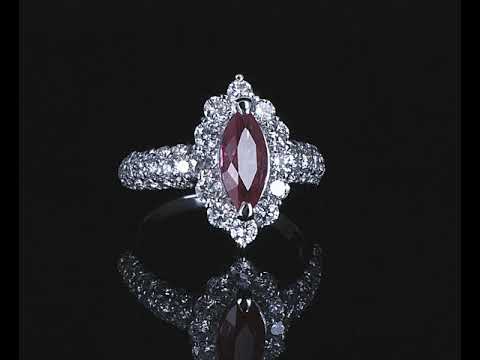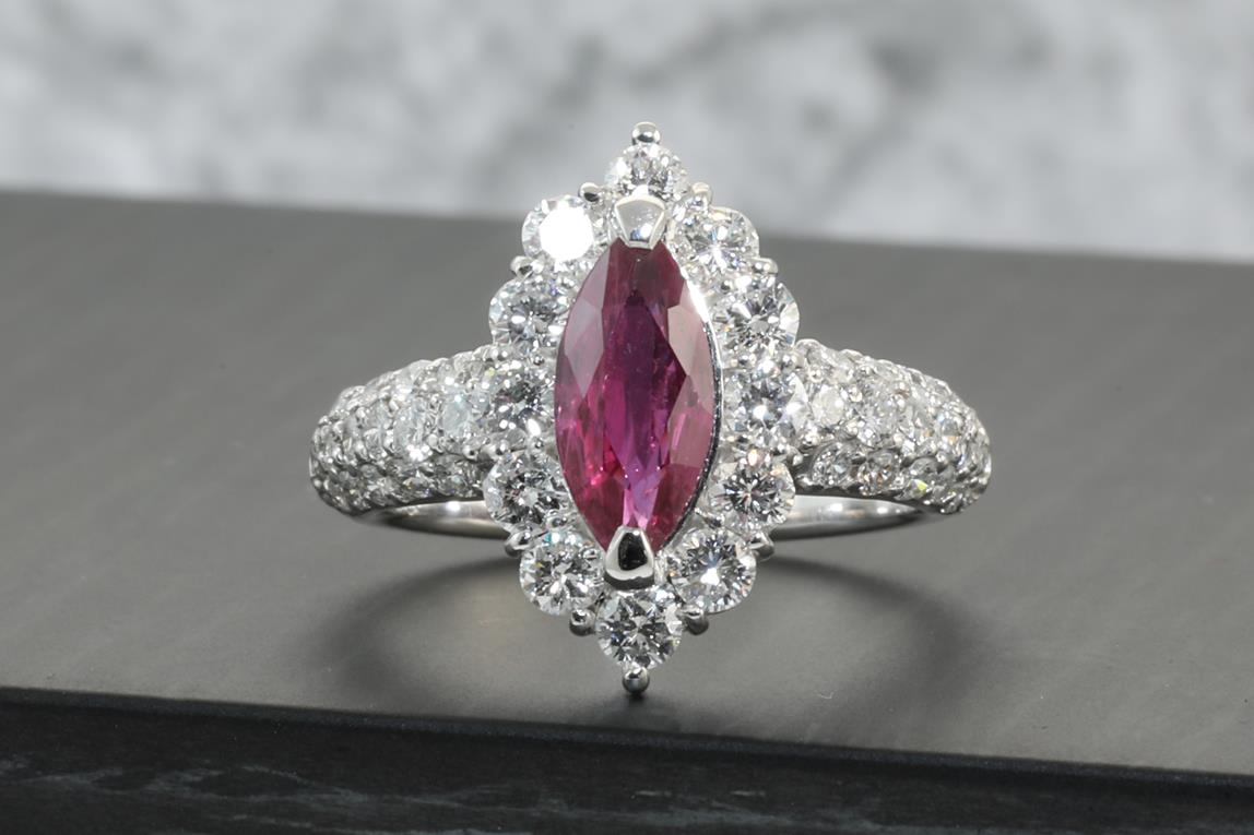 Ruby and Diamond ring with marquise cut Ruby of 1.37ct and Diamonds totalling 1.33cts (Estimated grading: G-H VS). Platinum. Ring size L - ring size can be increased by 3 sizes, can only be resized down using a ring clip. Weight: 7.0g (Pre-owned)