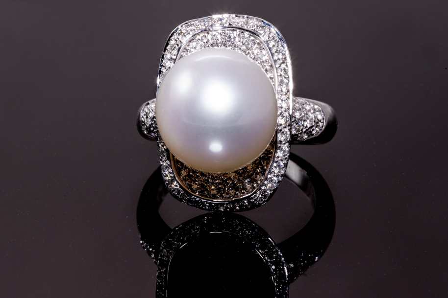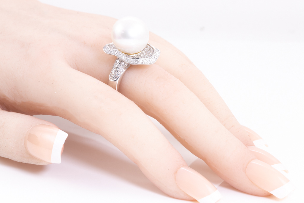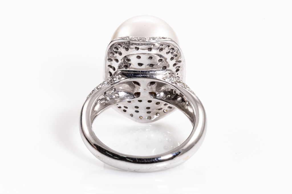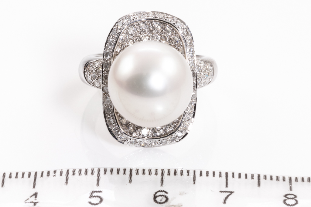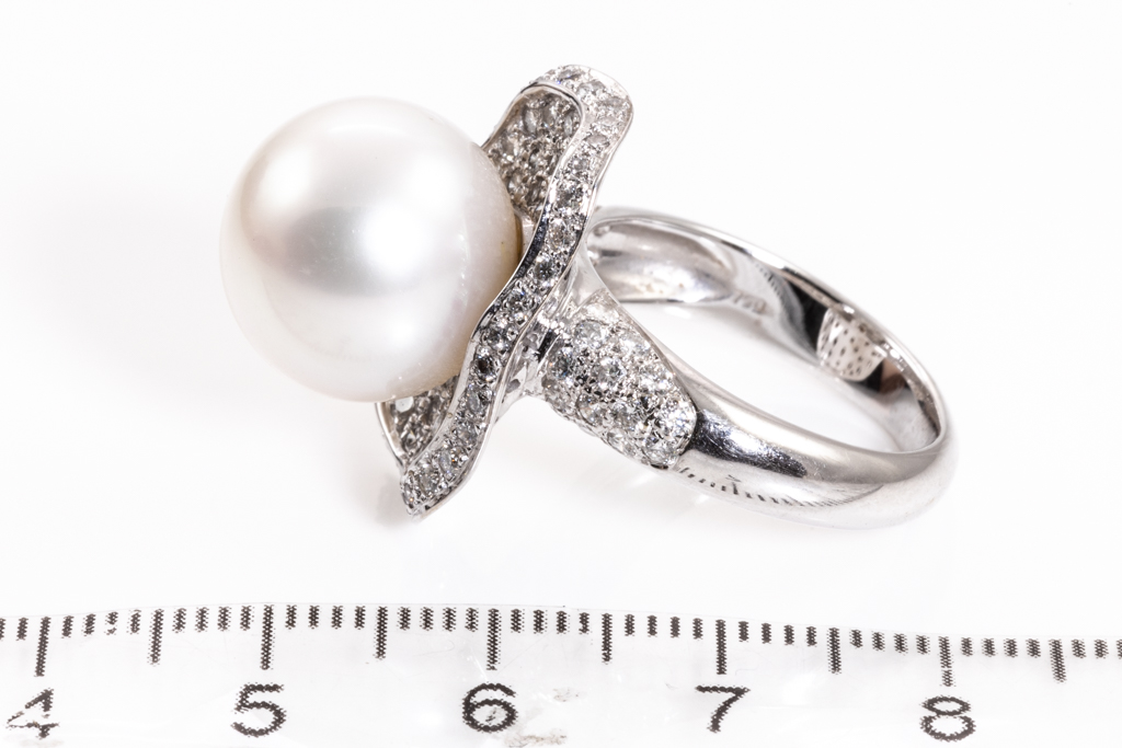 Pearl and Diamond ring with South Sea Pearl of 13.7mm and round Diamonds totalling 1.58cts (Estimated grading: H SI). 18ct white gold. Ring size P - ring resizing is not recommended. Weight: 14.7g. (Pre-owned)