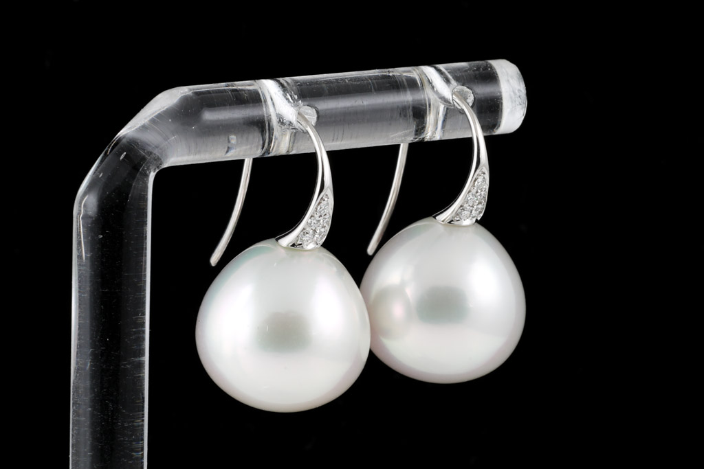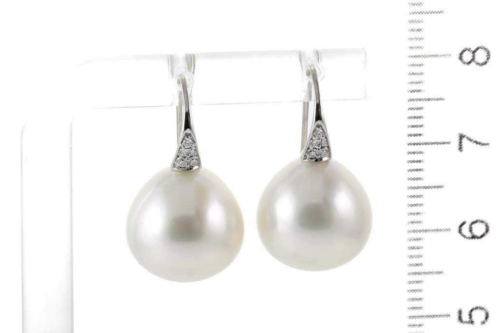 Autore Pearl hook earrings with 2 drop shape South Sea Pearl of 13.8-13.5mm. 18ct white gold hook set with round Diamonds totalling approximately 0.14cts. Weight: 8.2g. With Autore box. (Pre-owned)
