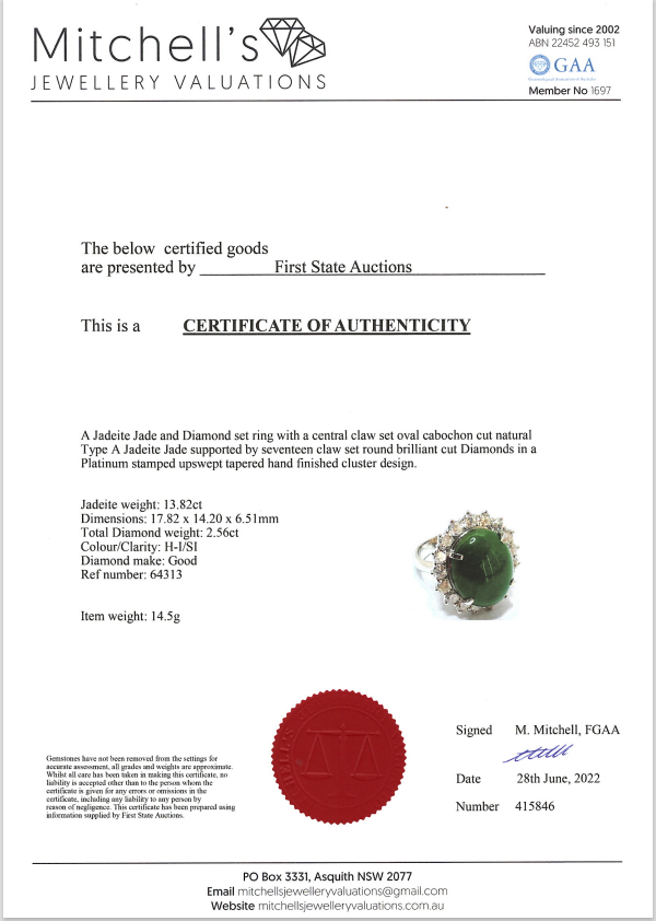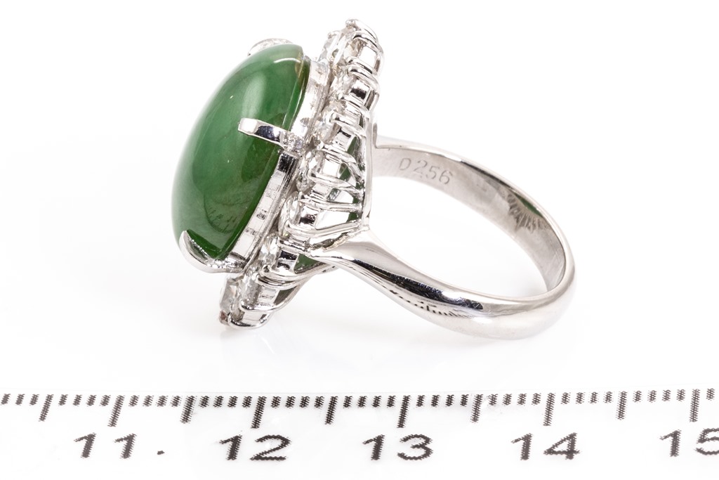 Jade and Diamond ring with an oval cabochon cut Natural Type A green Jadeite Jade of 13.82ct and round Diamonds totalling 2.56cts (Estimated grading: H-I SI). Platinum. Ring size: L1/2. Weight: 14.5g. With certificate #415846. (Pre-owned)